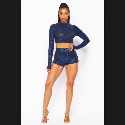 Sequin crop top and shorts set Long sleeves crop top with mock neck Hot shorts...