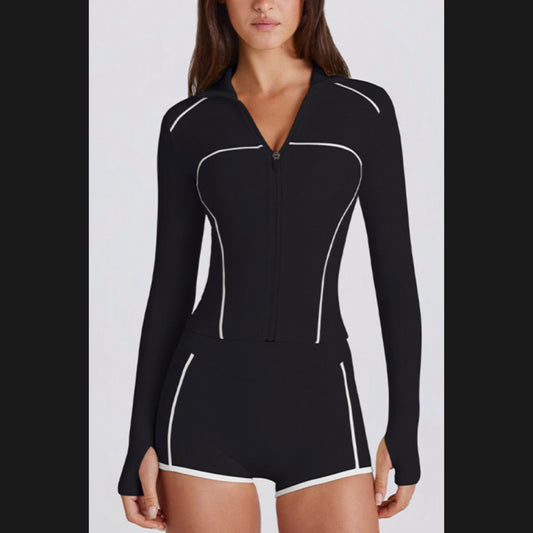 Design Details - Breathable full zipper long sleeve yoga jackets and high-waisted shorts set design...