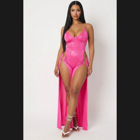 O-ring detailed shiny zebra metallic sexy wide open leg jumpsuit