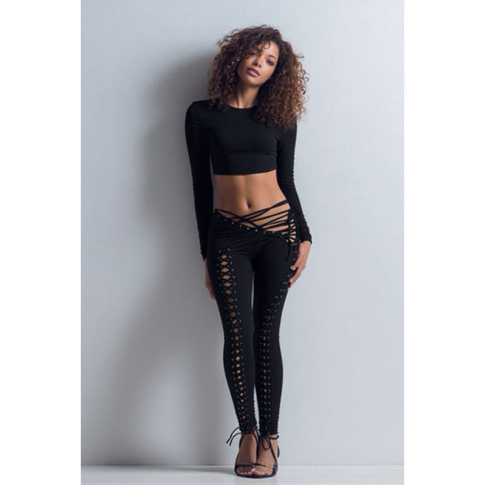 Lace up detailed pants and top set Round neck Long sleeve Pull on bottom Unlined...