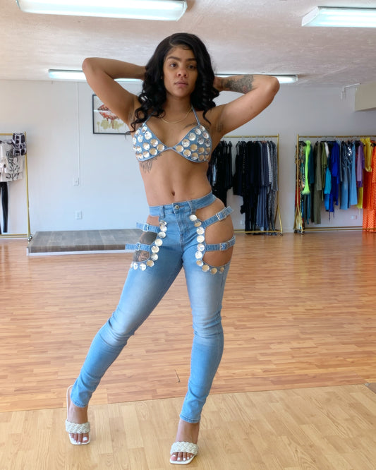 Two piece rhinestone top with denim jeans set Contents: 70% Cotton, 21% Polyester, 8% Viscose,...