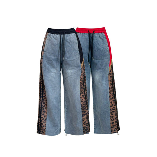 These jogger pants feature a bold, contrasting design combining denim, leopard print, and color block...