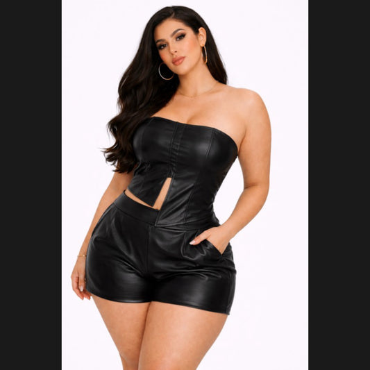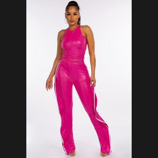 Faux leather wing pants with faux leather stacked top Contents: 96% Polyester, 4% Spandex Made...