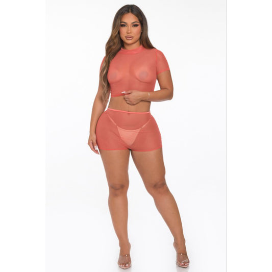 Sheer mesh crop top with short sleeves and see through shorts Stretch and comfortable fit ...