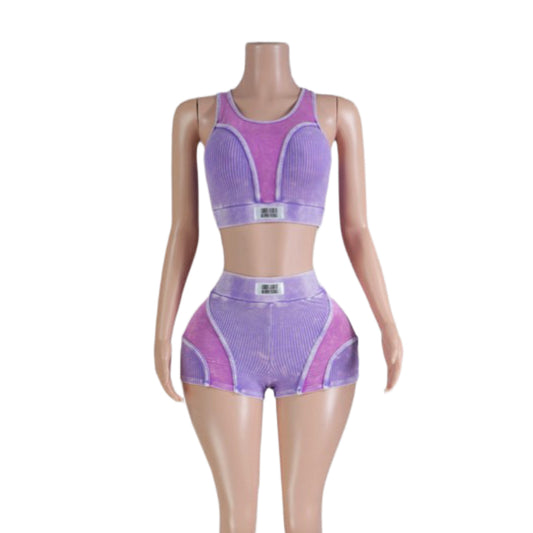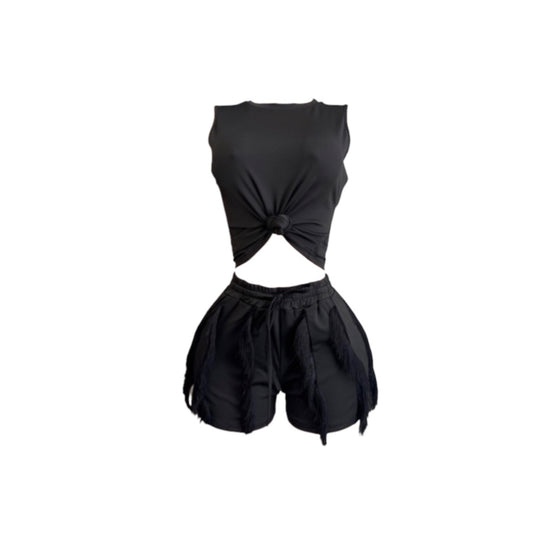 This two piece set featuring a sleeveless knitted crop top and matching high waisted shorts...