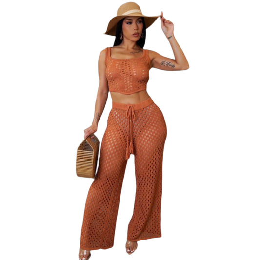 Two piece cover up pants set Elasticized high rise waist band Quick drying crochet knit ...