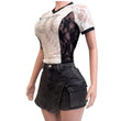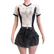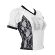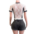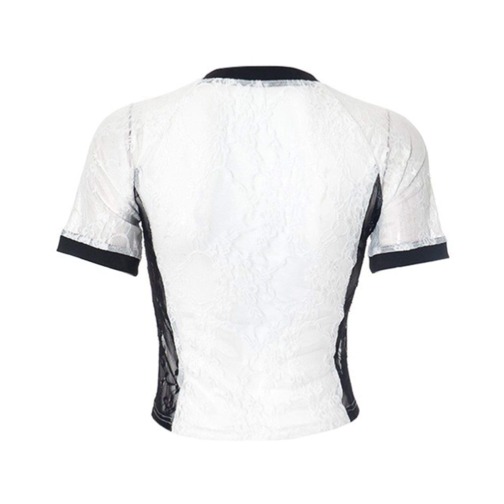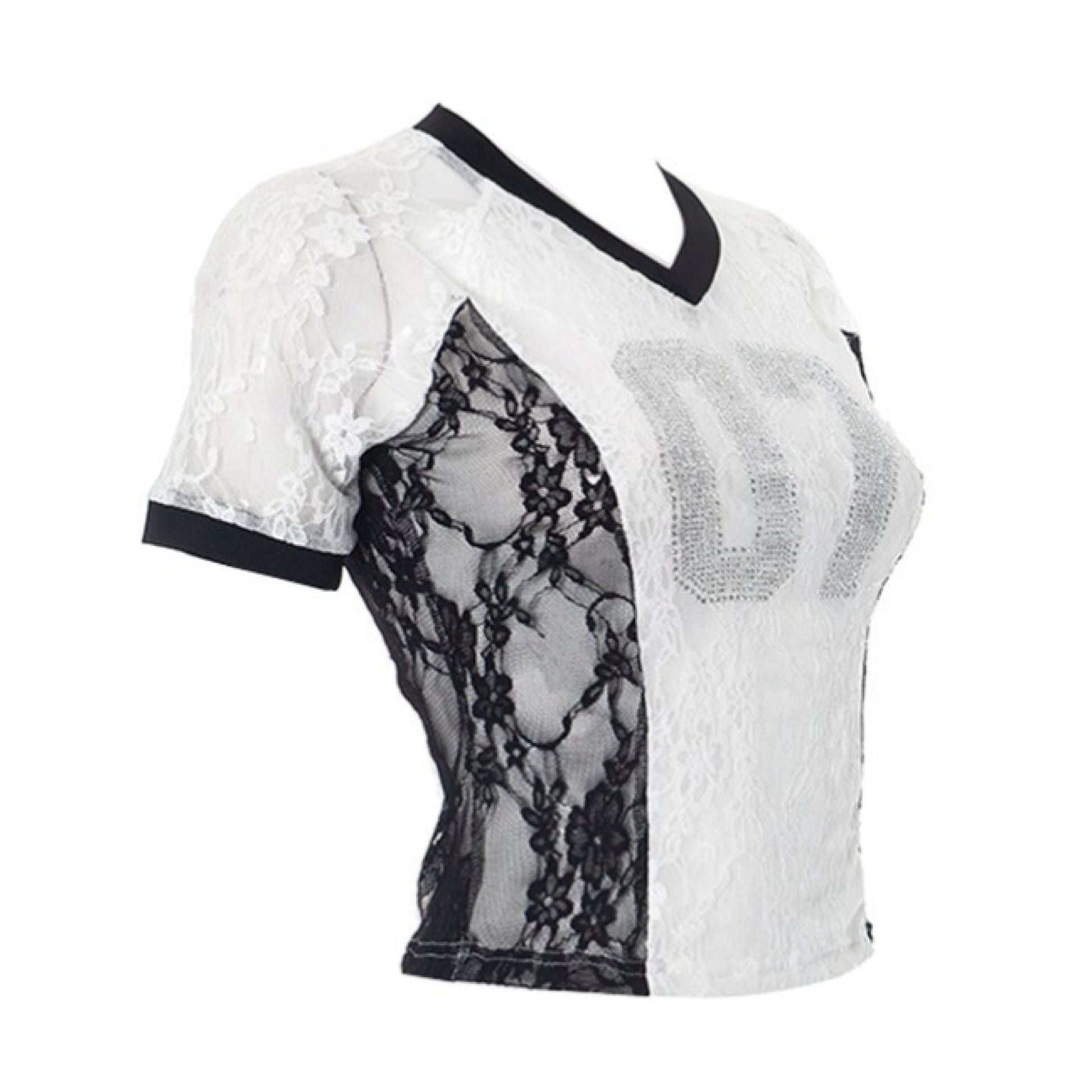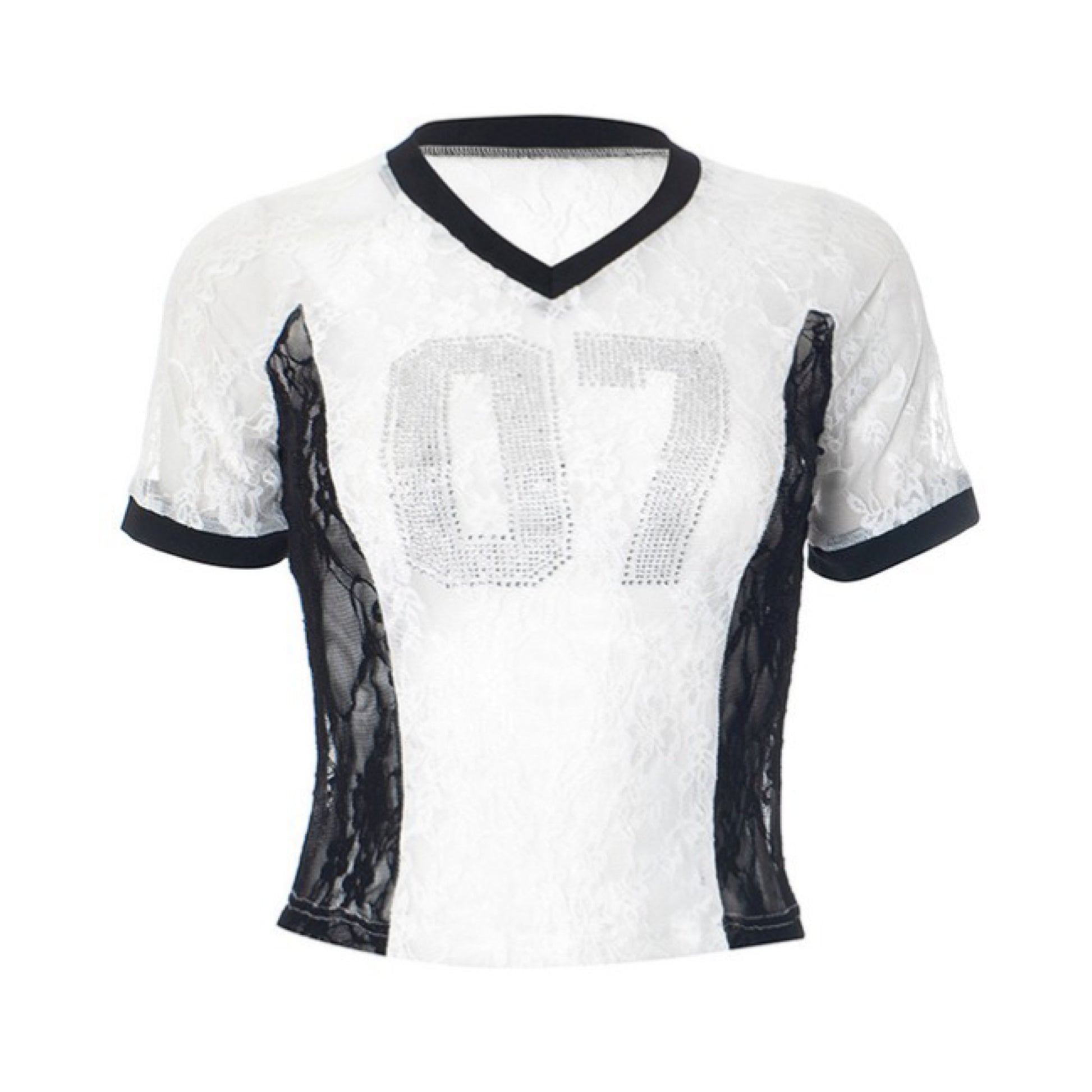 This stylish varsity-inspired top features a sheer lace mesh design with contrasting black trim and side panels. The front is adorned with a rhinestone "07" graphic, adding a sporty yet feminine touch. Perfect for layering or making a statement in casual and streetwear outfits