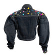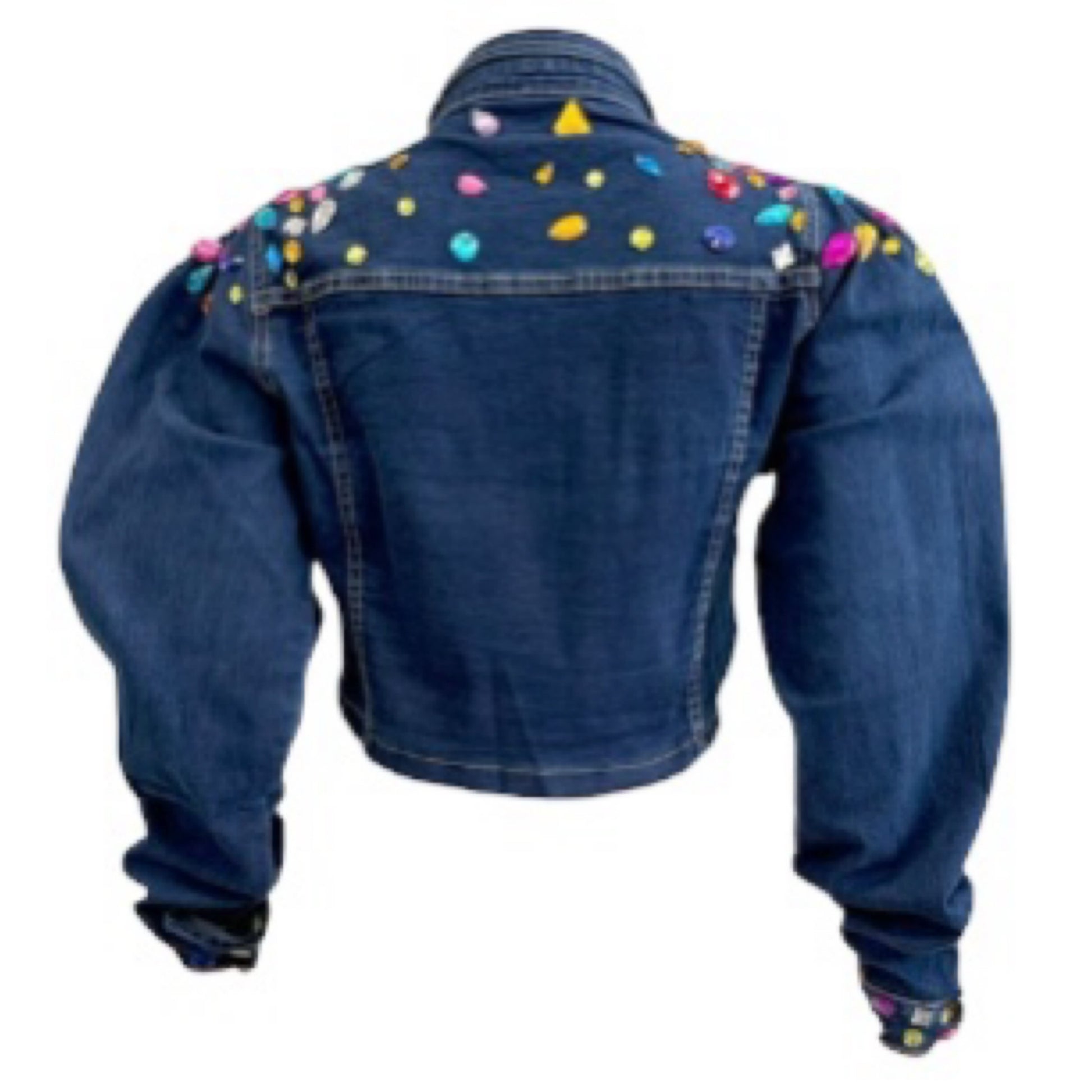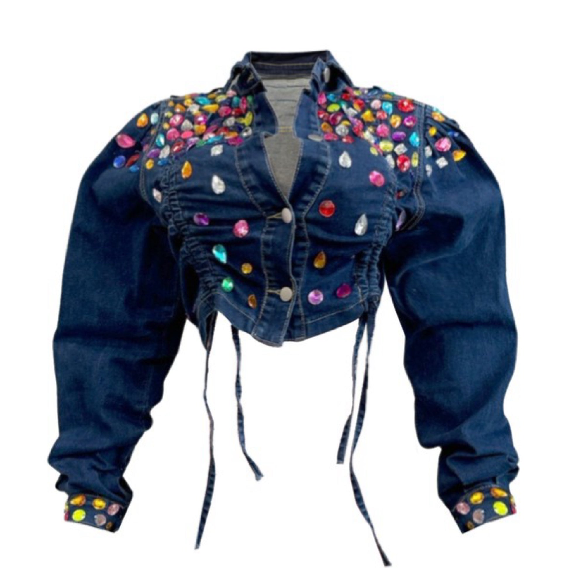 Add sparkle to your wardrobe with this cropped denim jacket, featuring vibrant rhinestone embellishments for a touch of glam. Designed with adjustable drawstrings for a cinched fit and statement puff sleeves, this jacket is available in jet black and classic blue, perfect for making a bold fashion statement