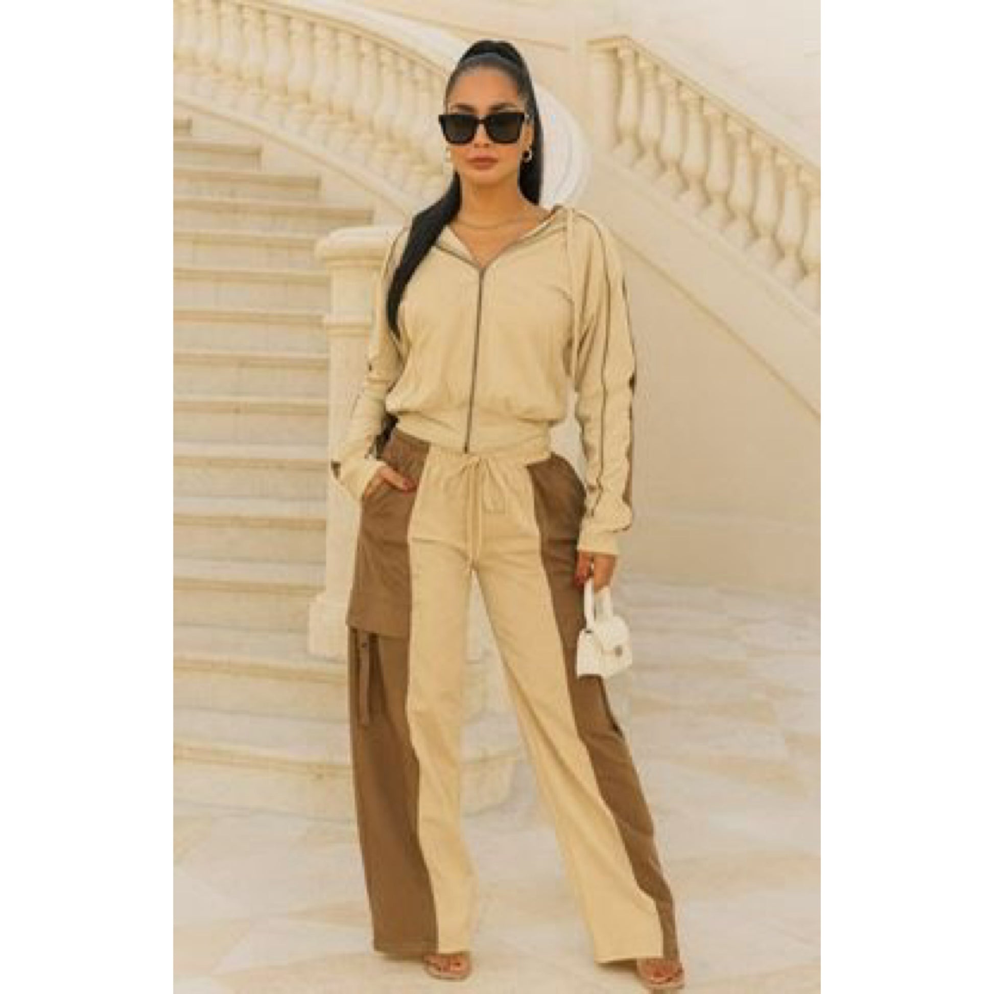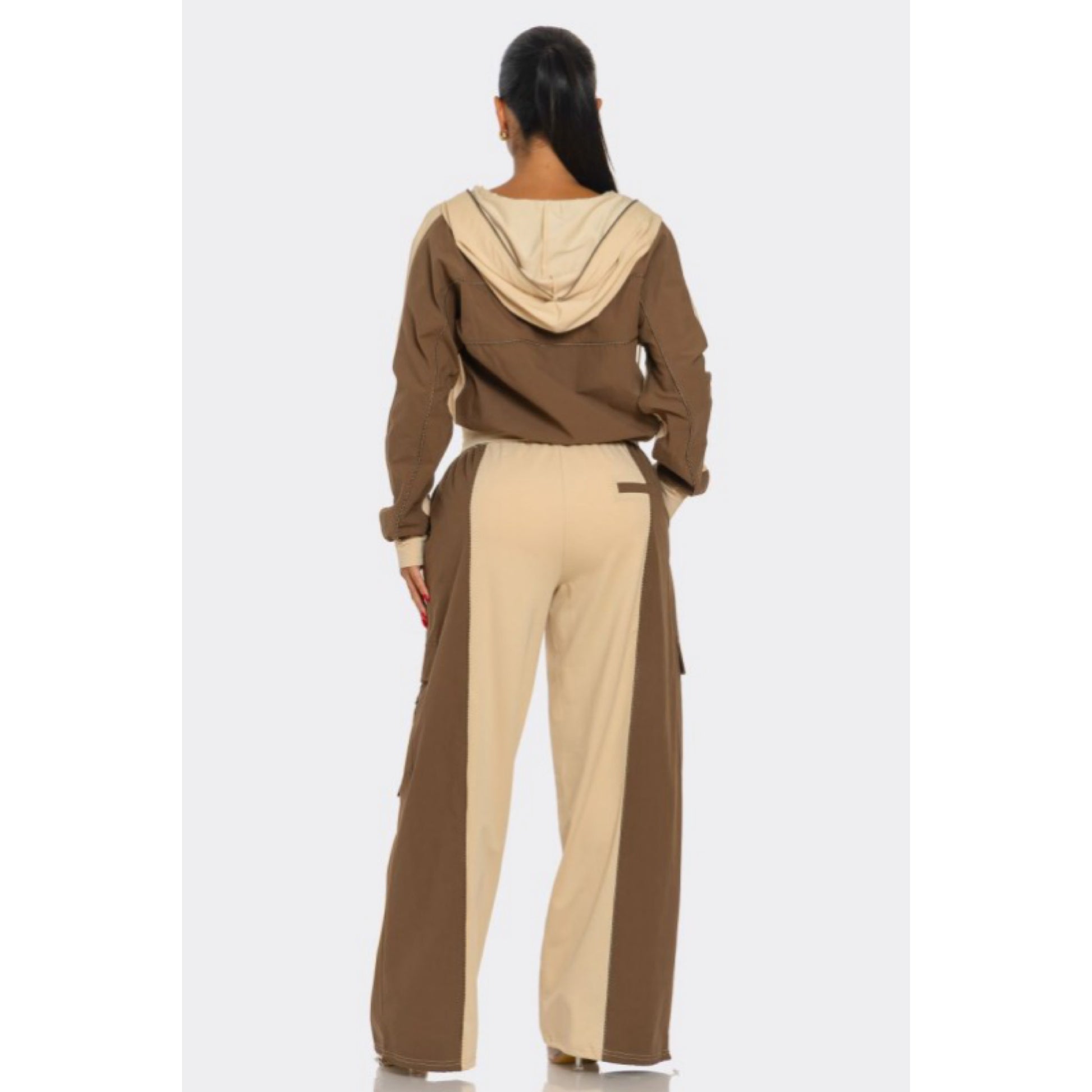 Elasticized trim, functional pockets, hoodie, and contrasting piping