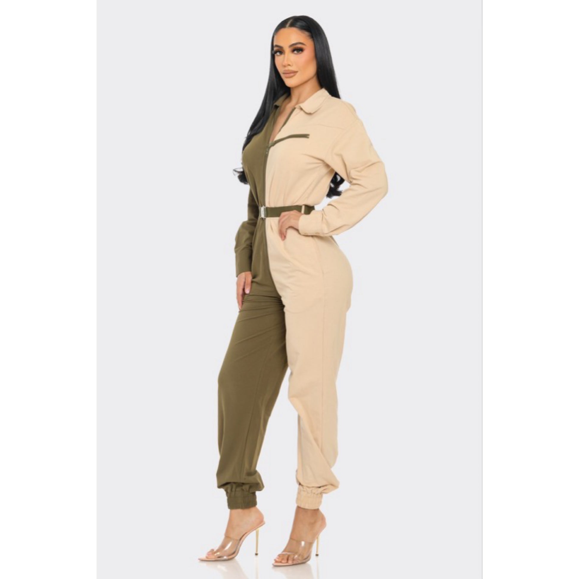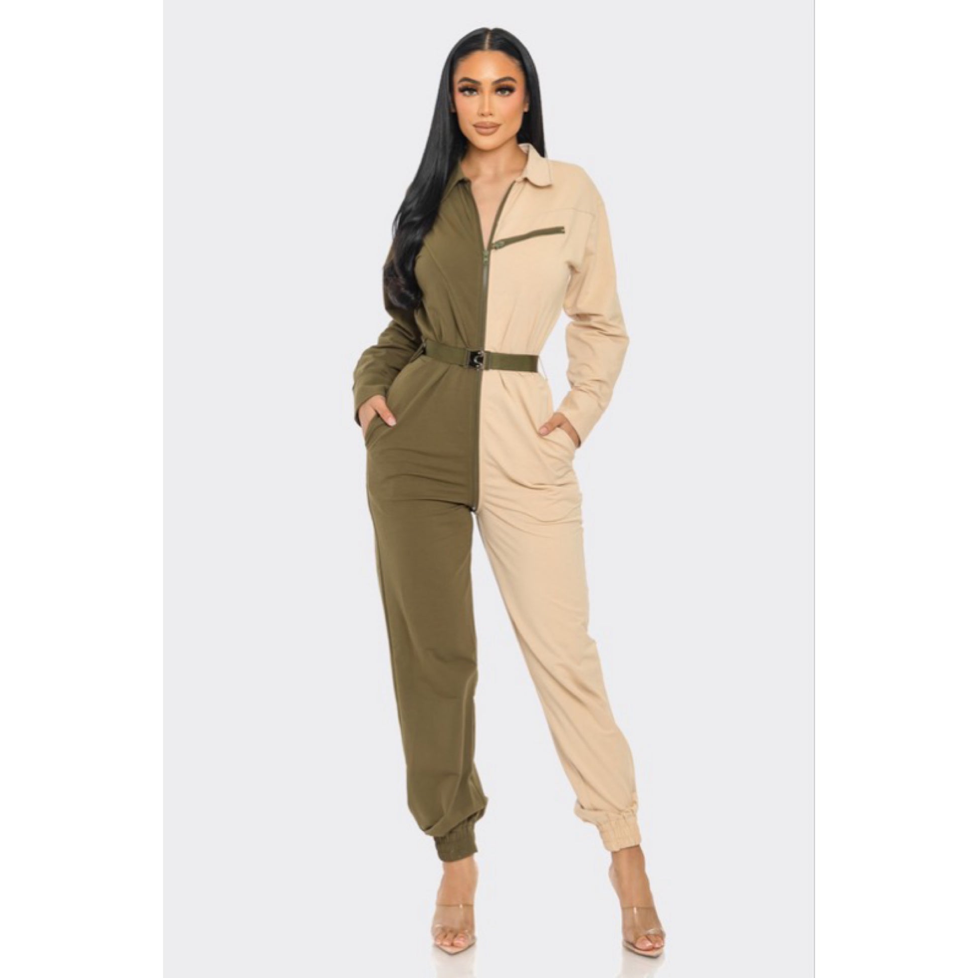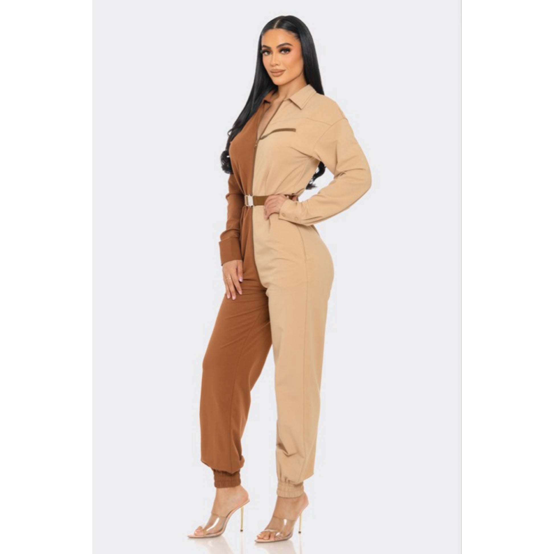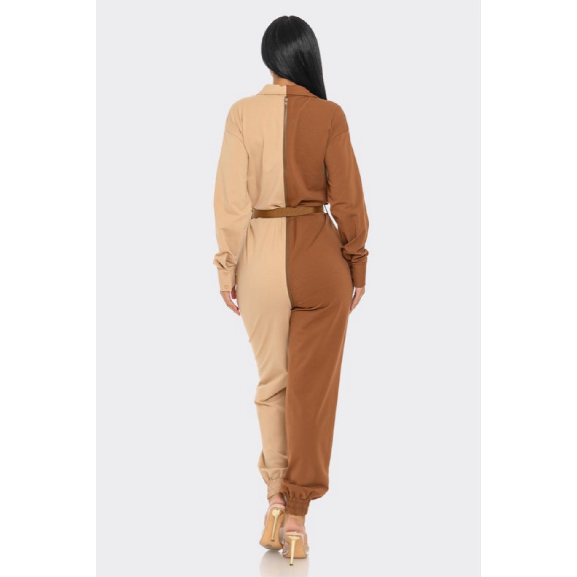 Long sleeve oversized cozy shirt jumpsuit with an accent belt and adjustable front zipper details