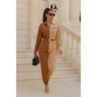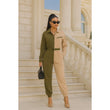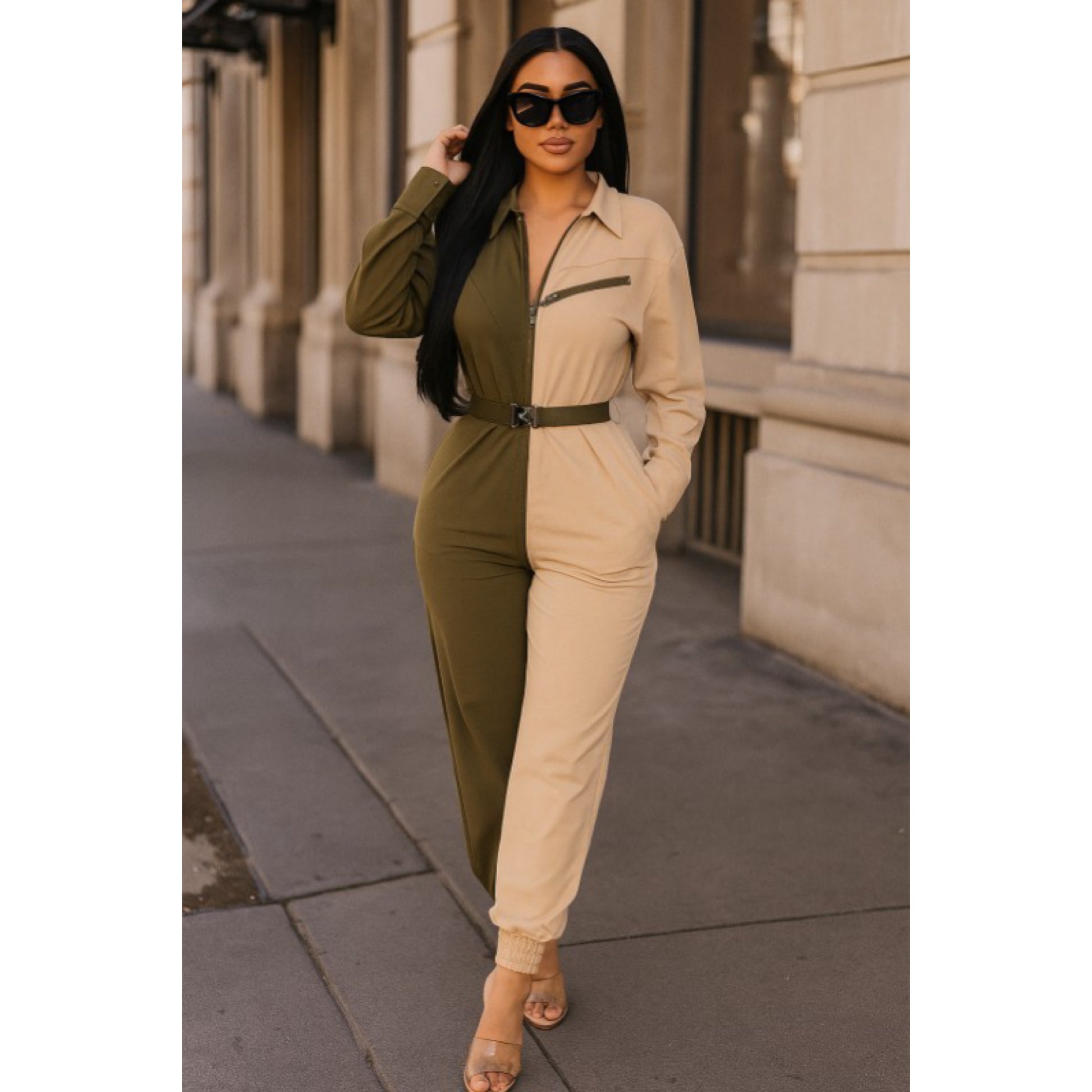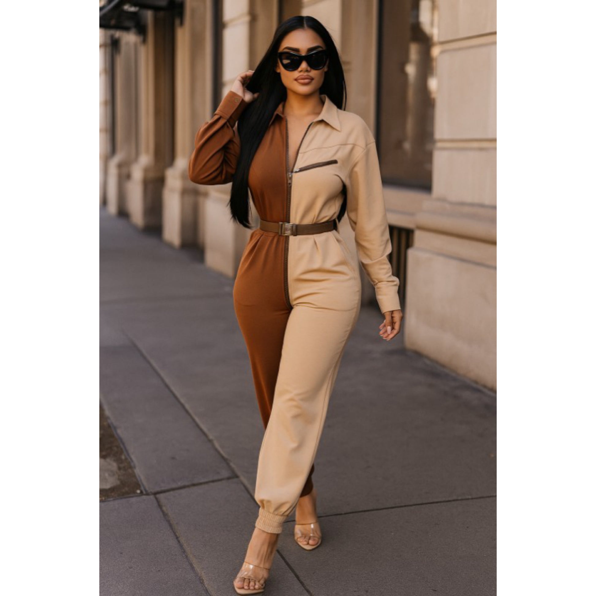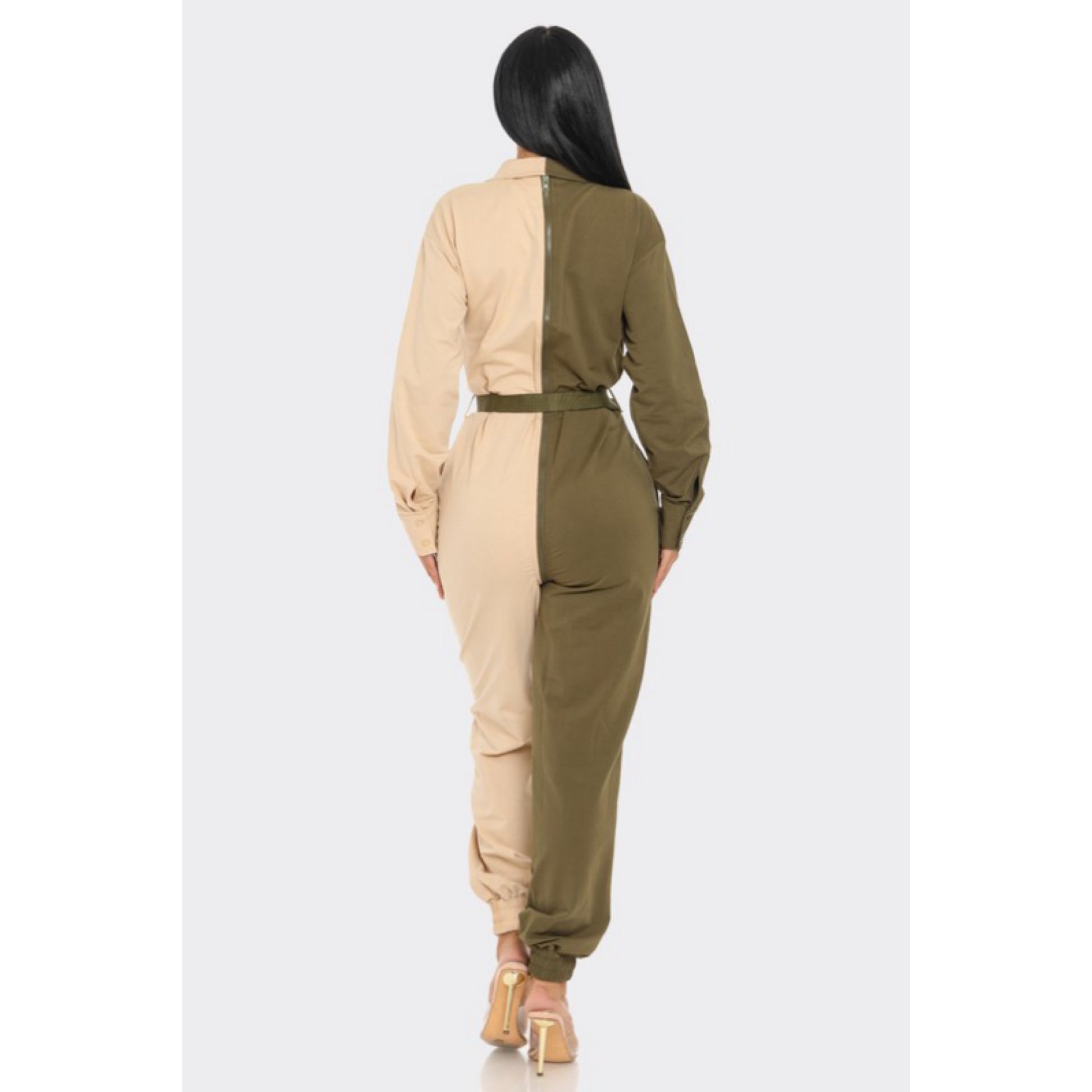 Long sleeve oversized cozy shirt jumpsuit with an accent belt and adjustable front zipper details