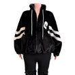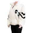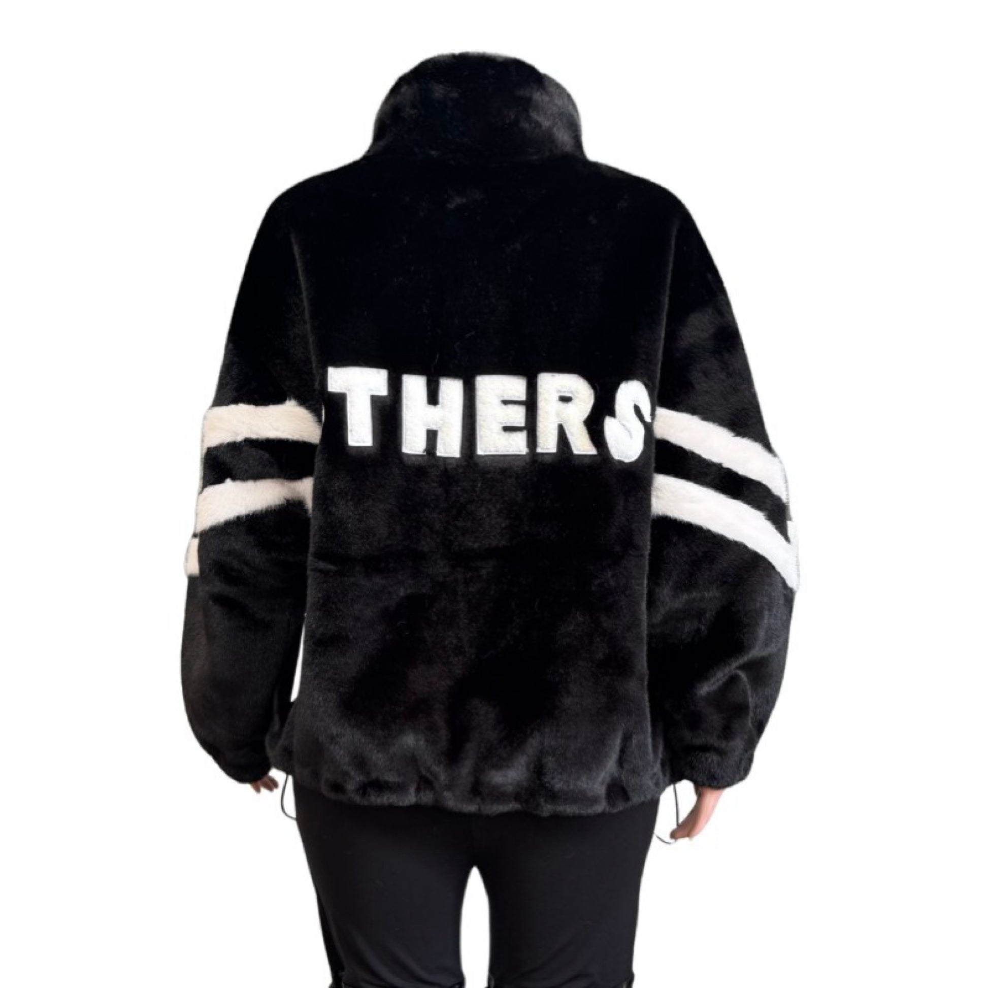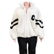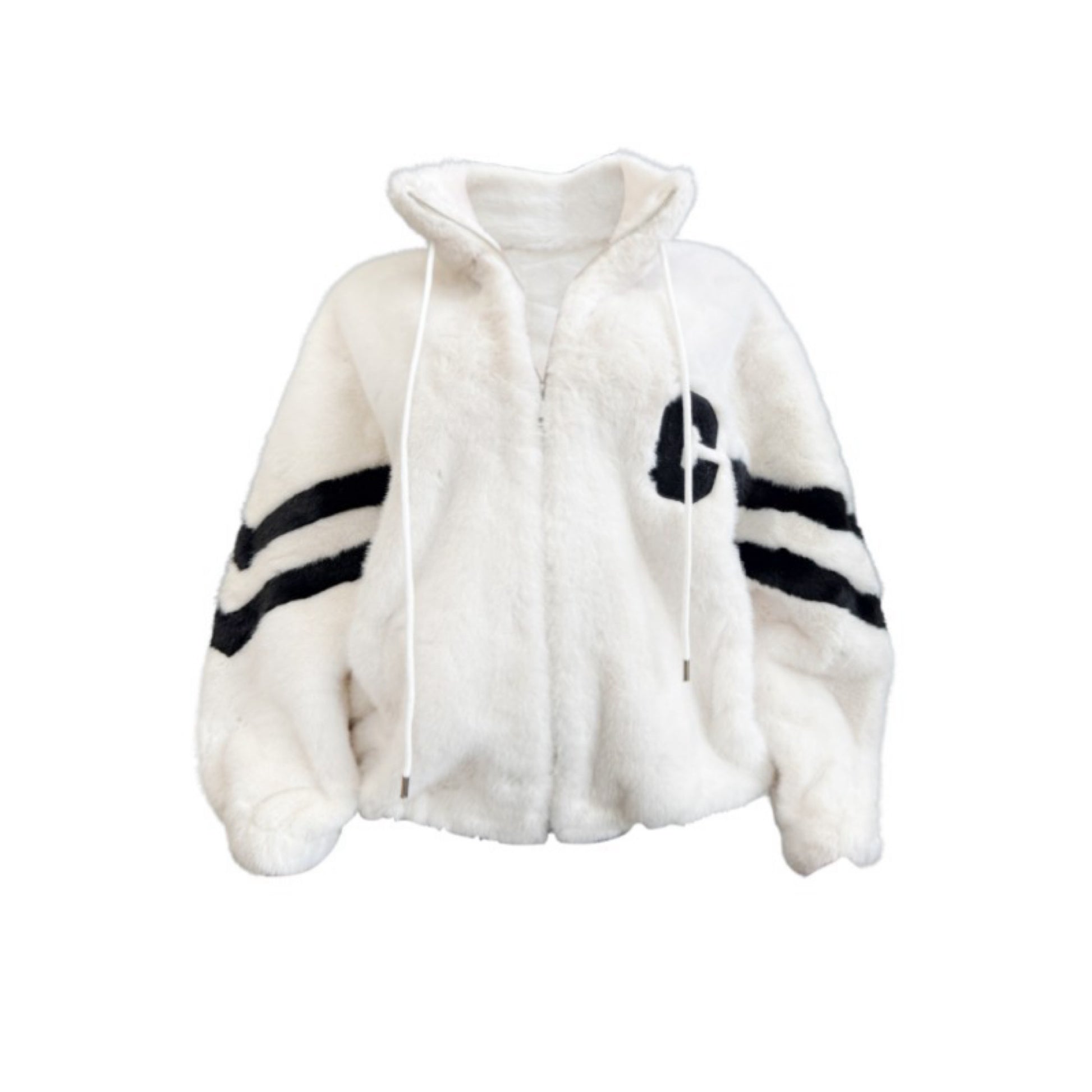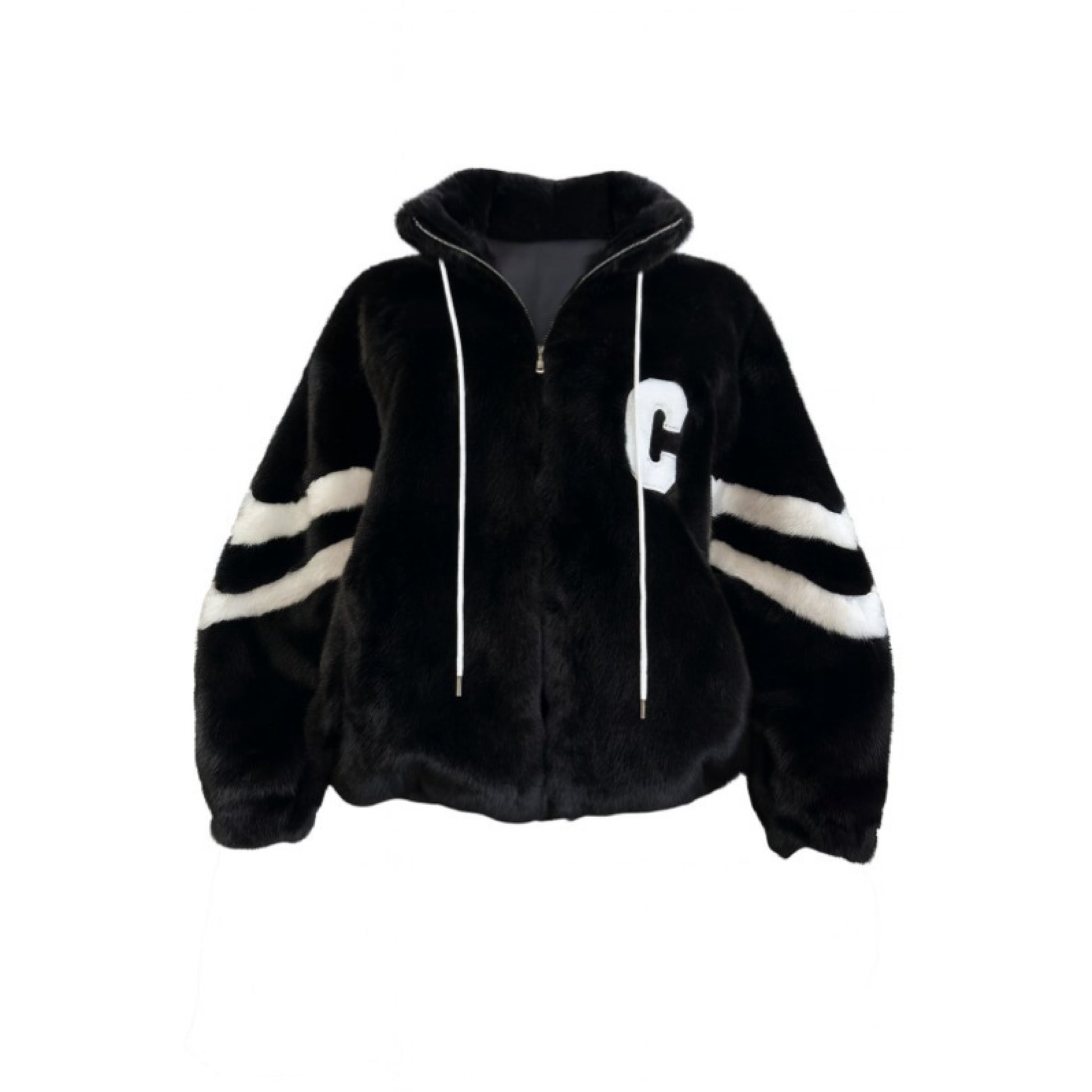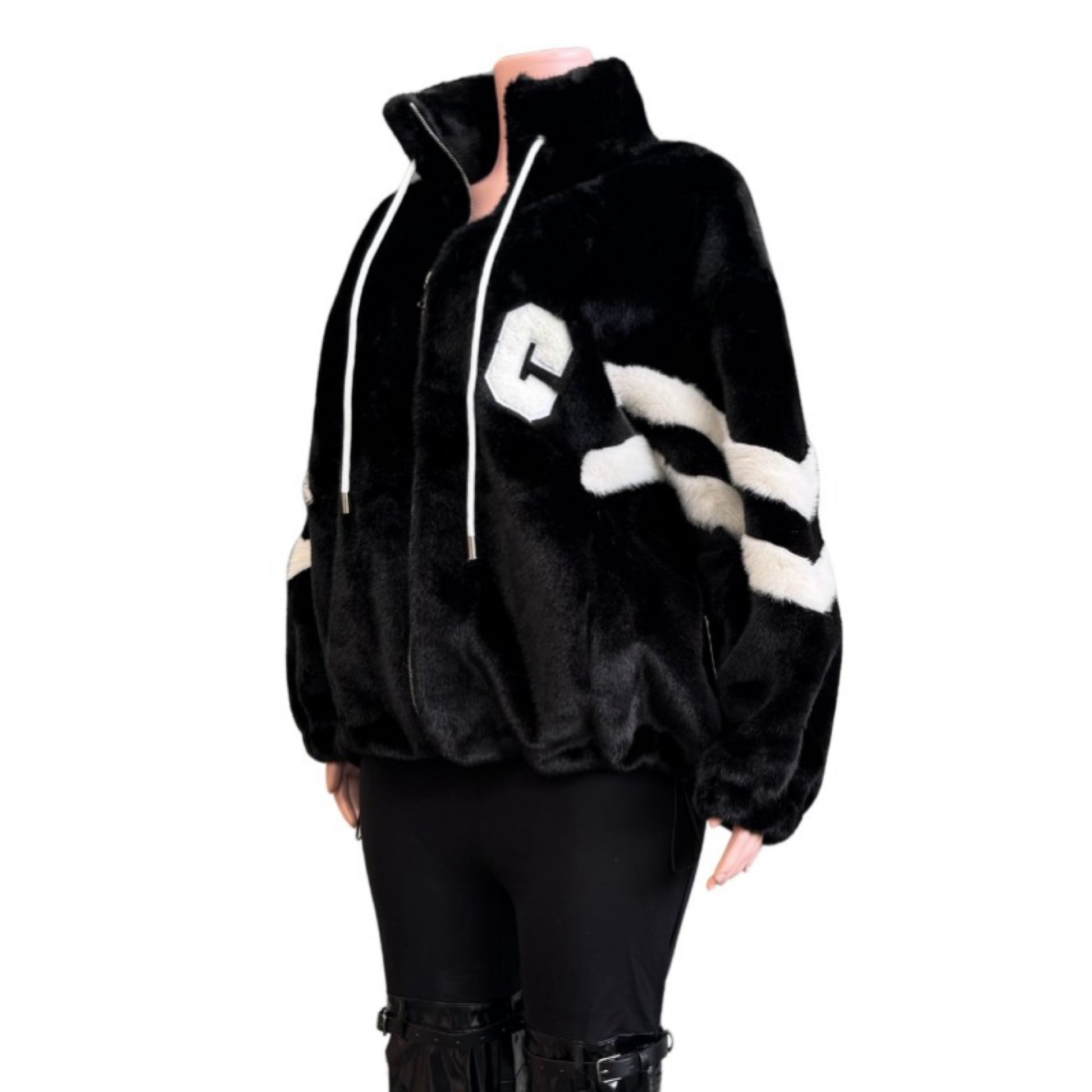 A cozy faux fur zip up jacket with sporty white sleeve stripes and a bold varsity style ‘C’ patch on the chest