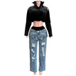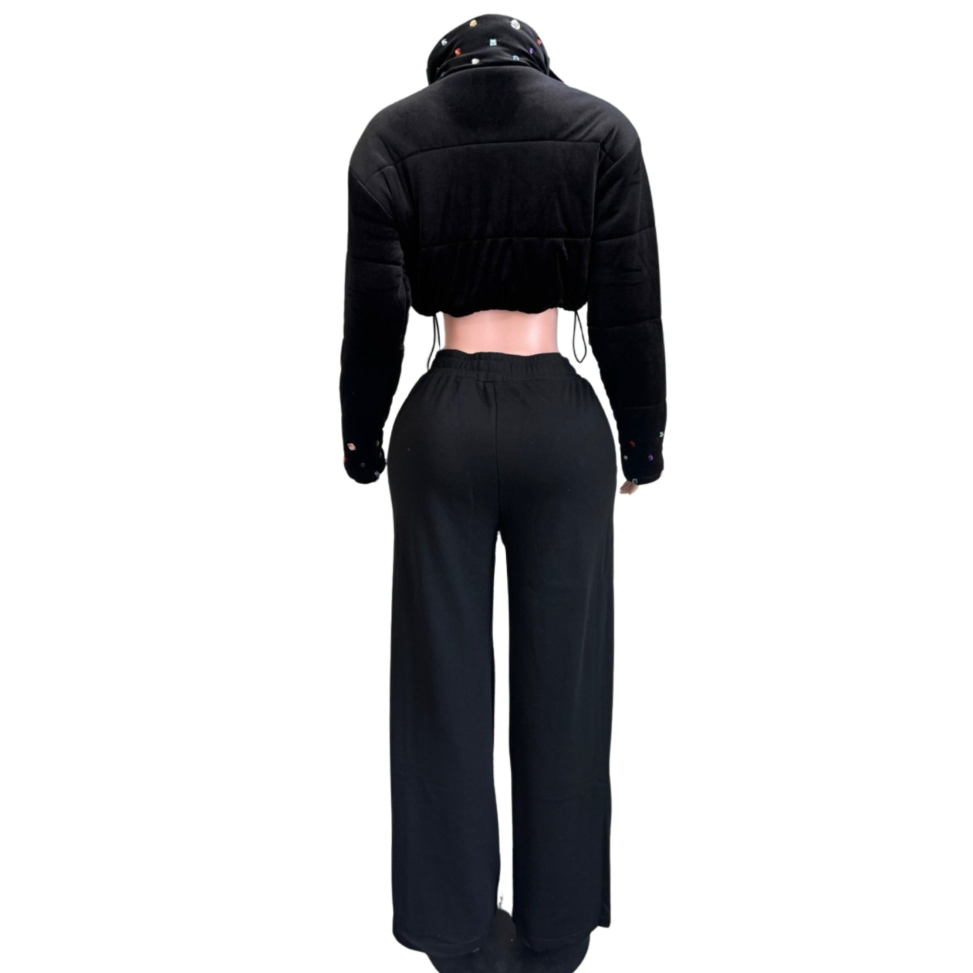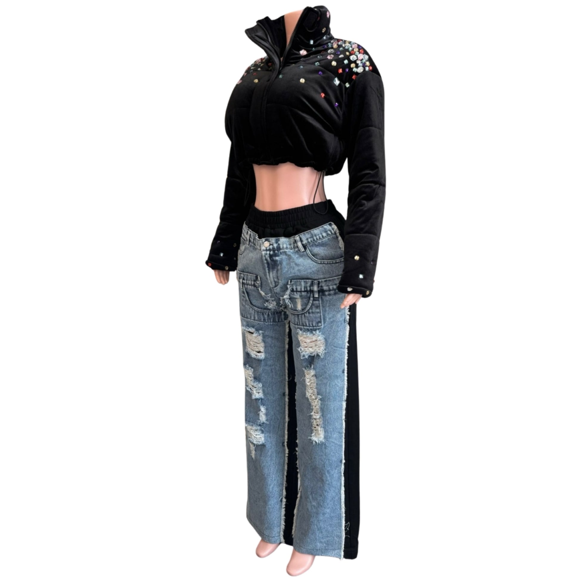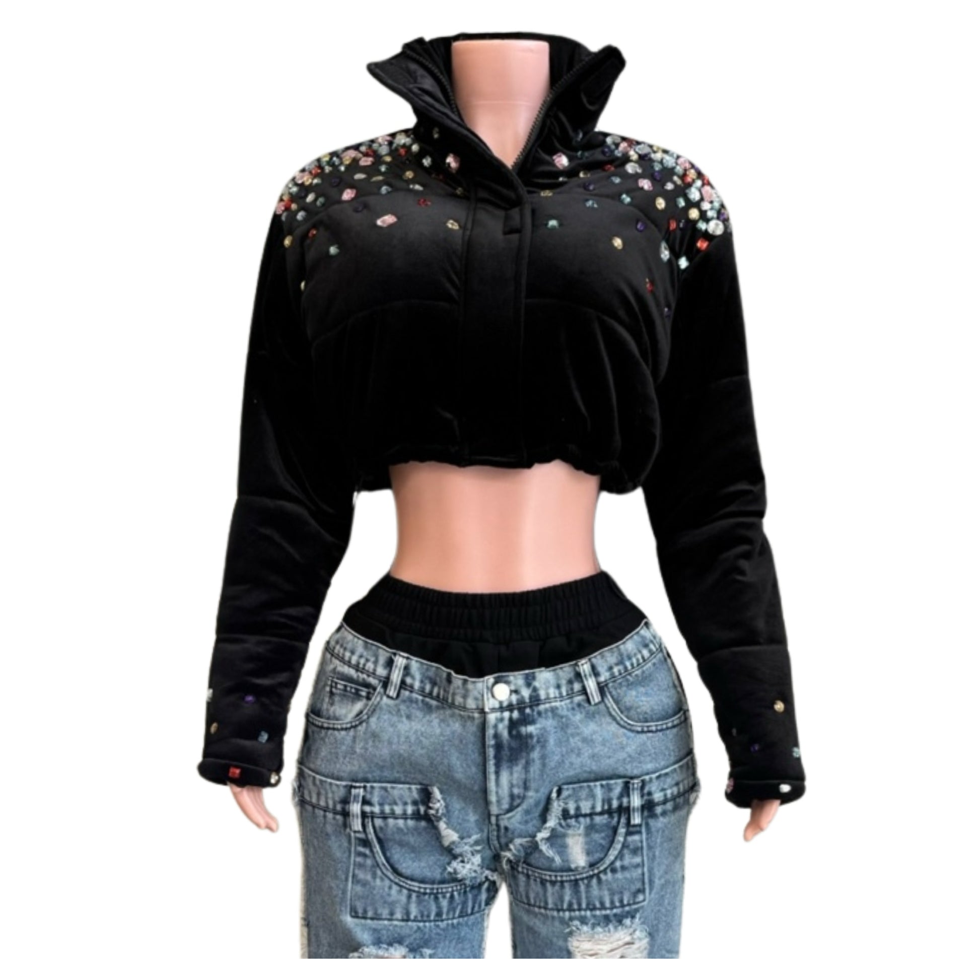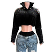 Black velvet cropped jacket adorned with multicolor rhinestone embellishments on the shoulders, collar, and cuffs for a bold, glamorous look.