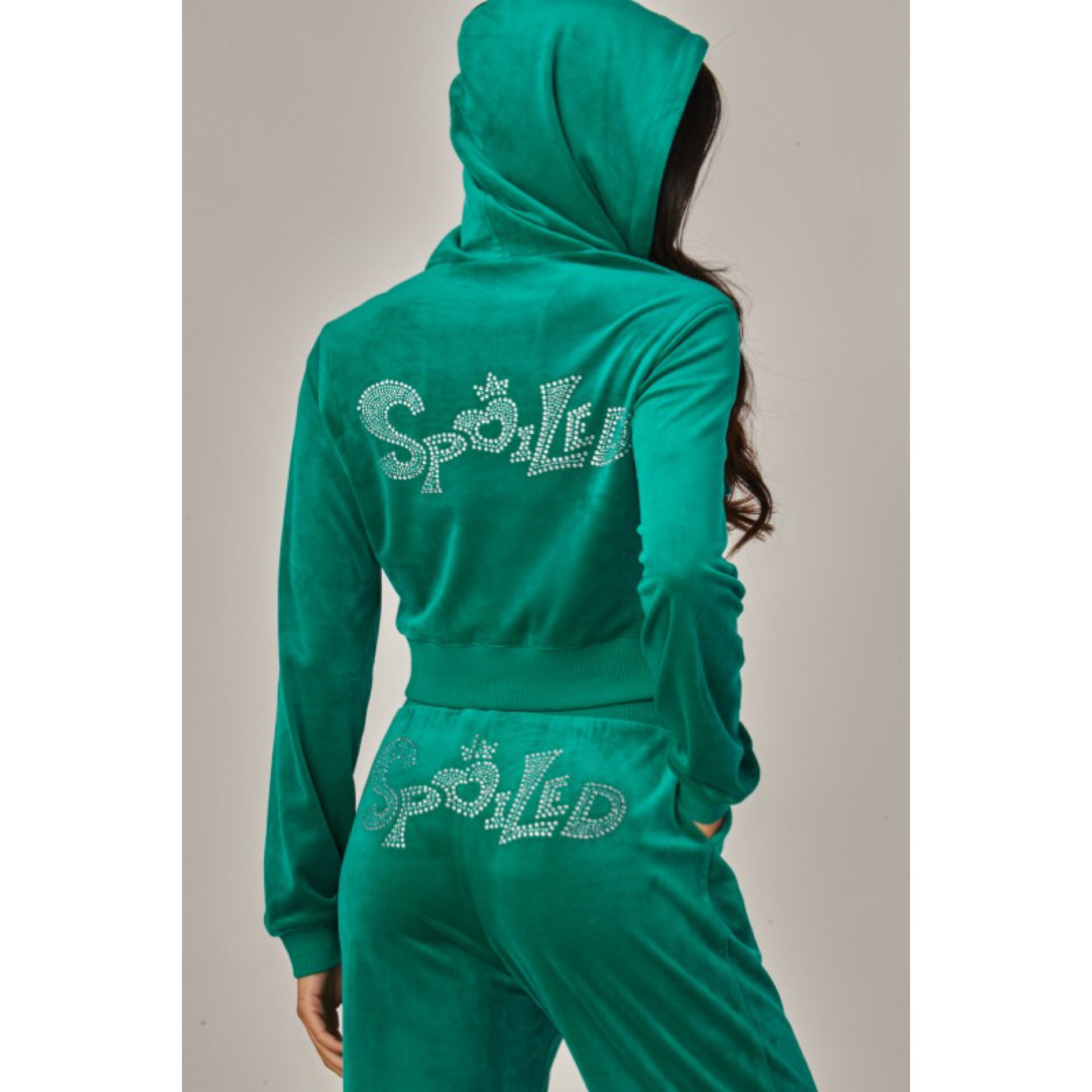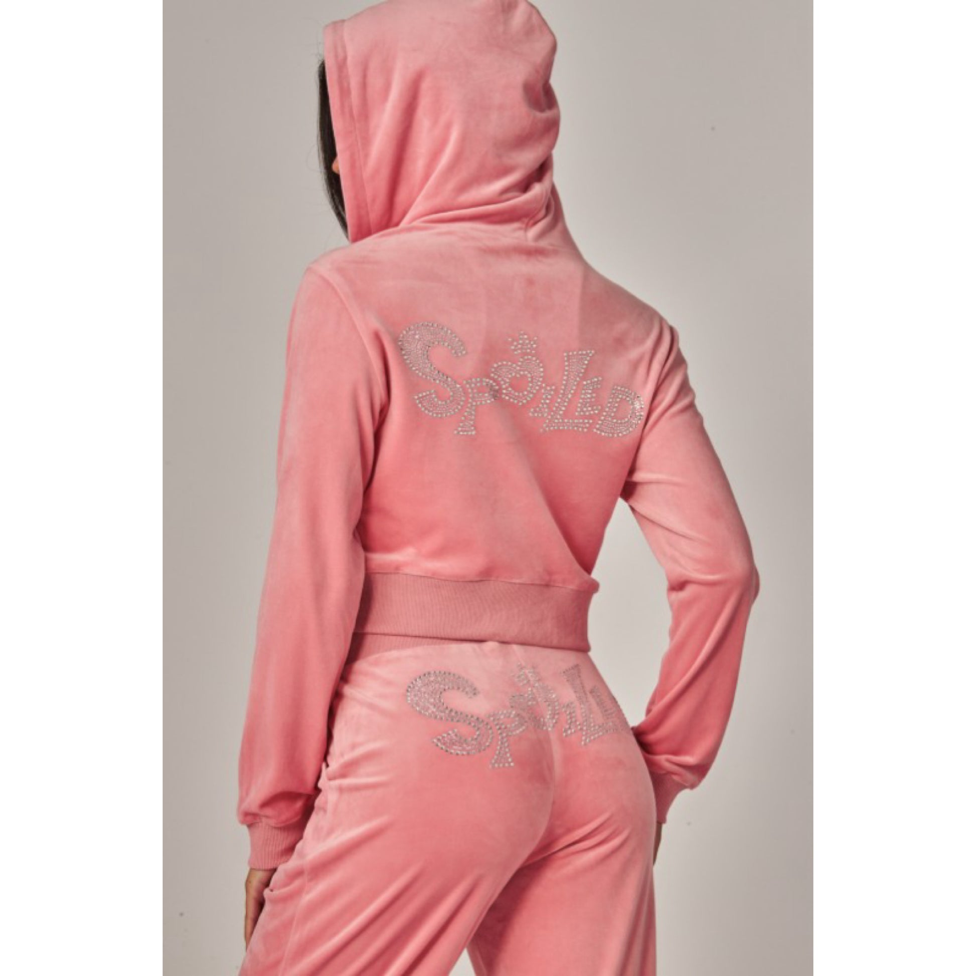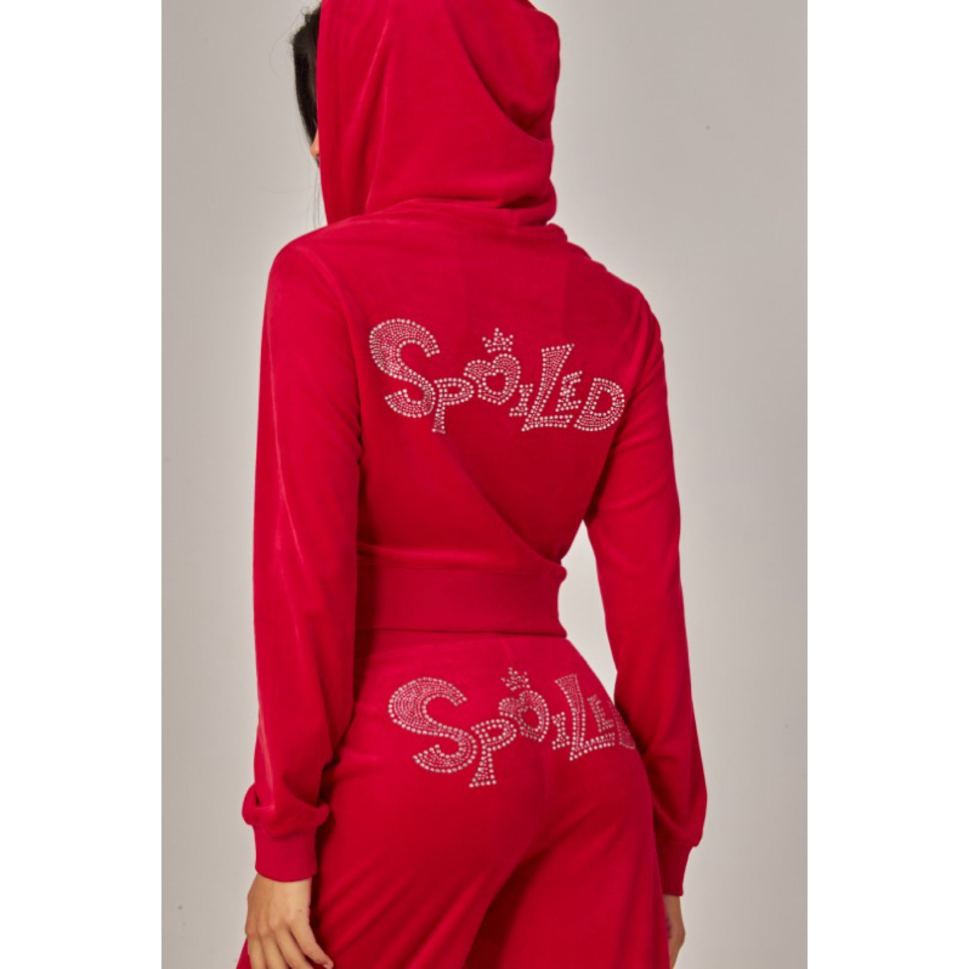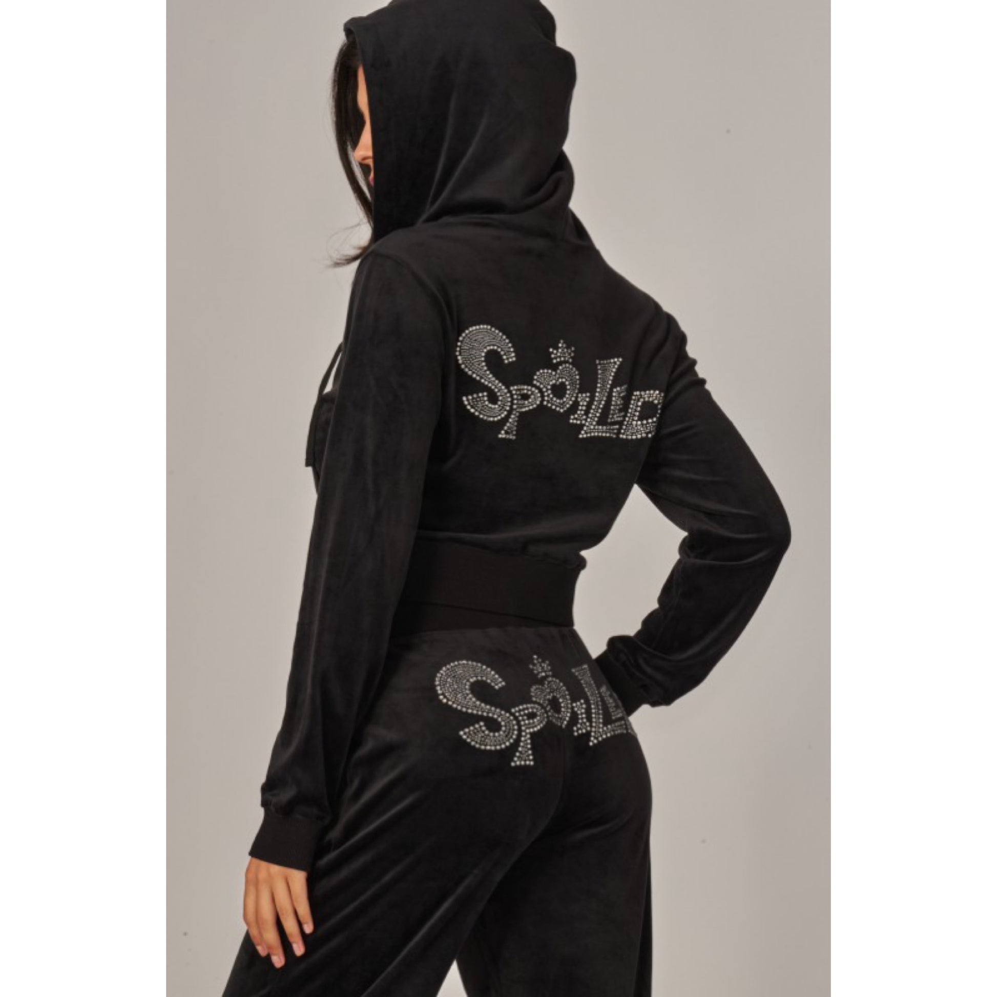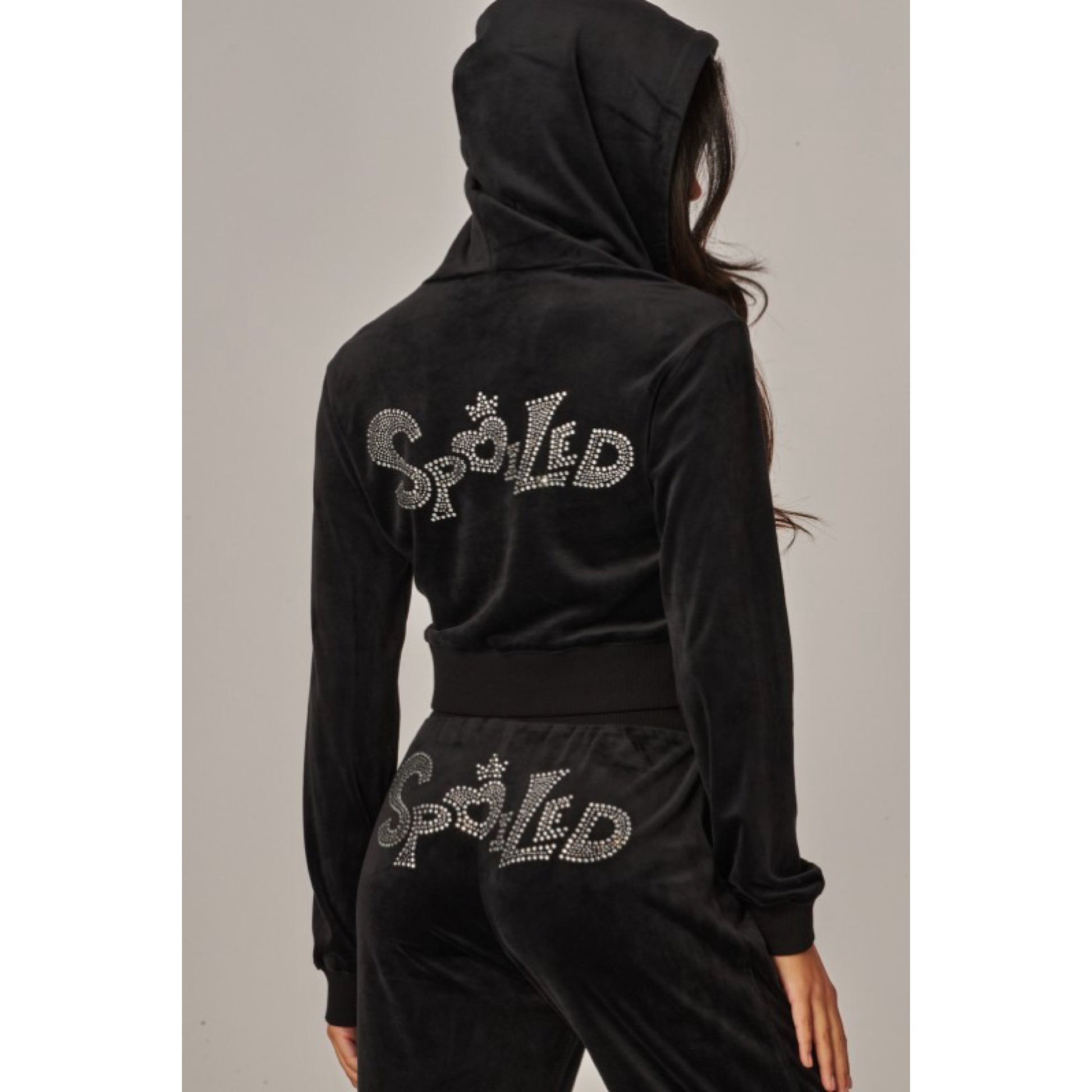 A cropped track jacket has a drawstring hood, front pockets, and rhinestone logo graphics on the front and back. Low rise pants have spoiled spelled out in rhinestones at back, and a ribbed elastic waistband