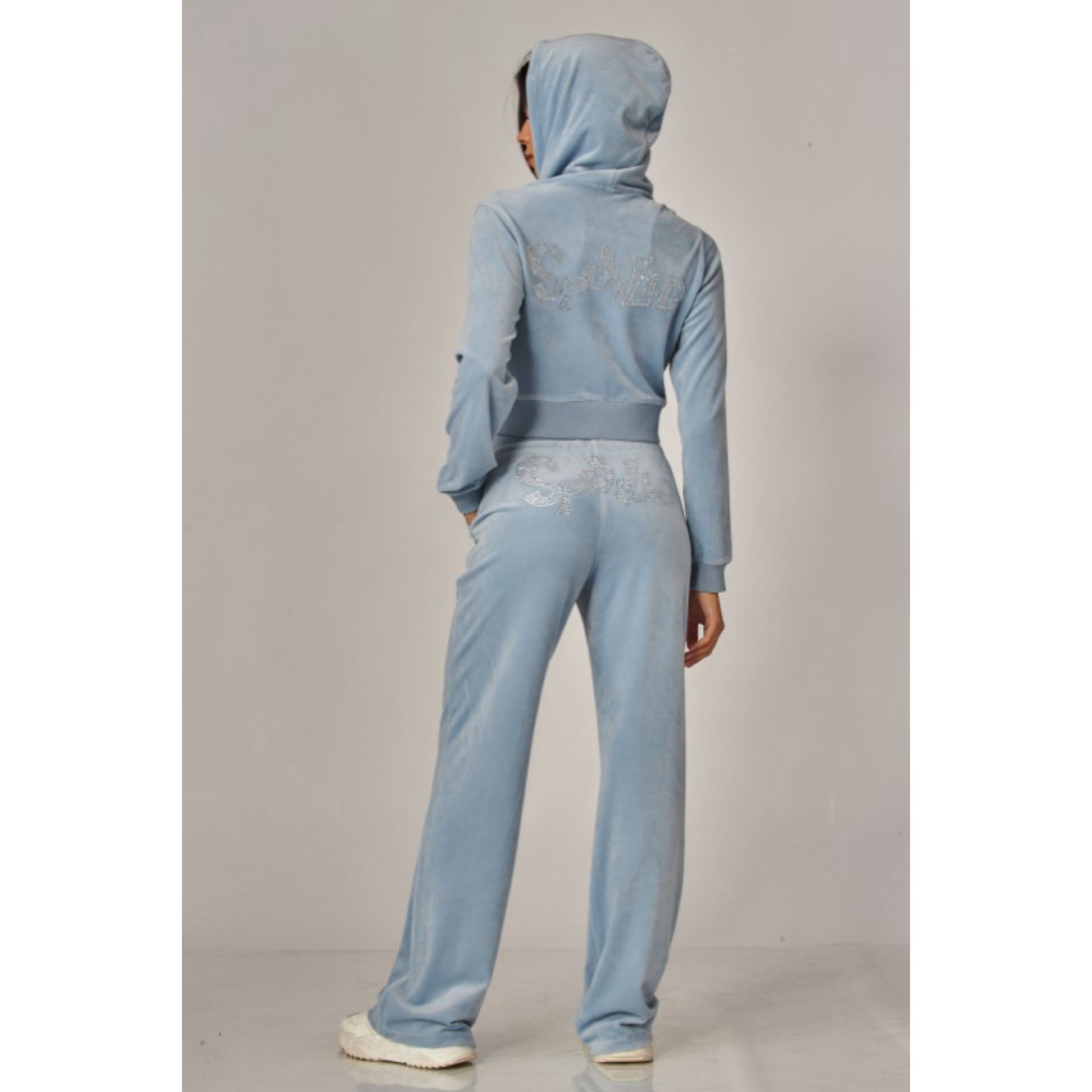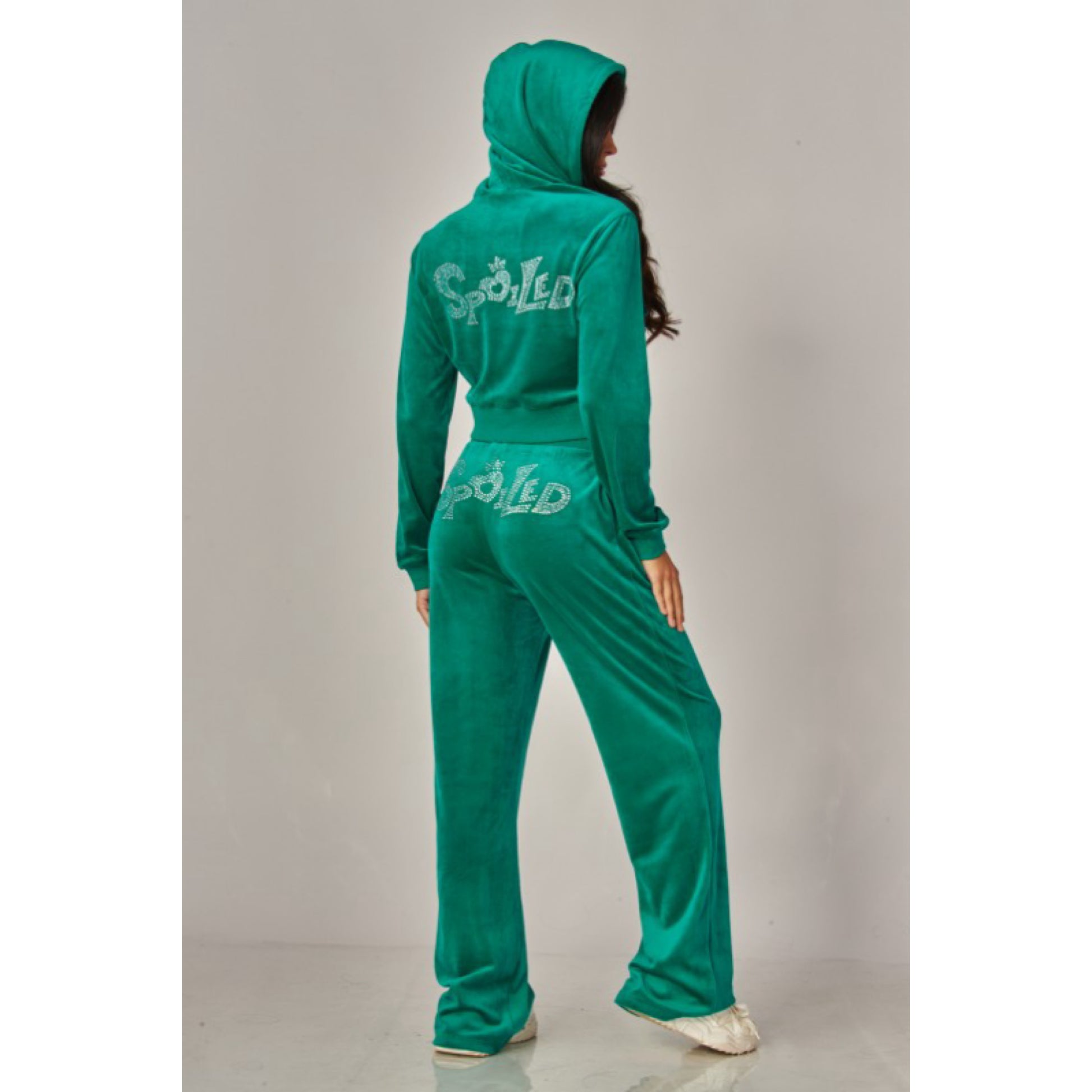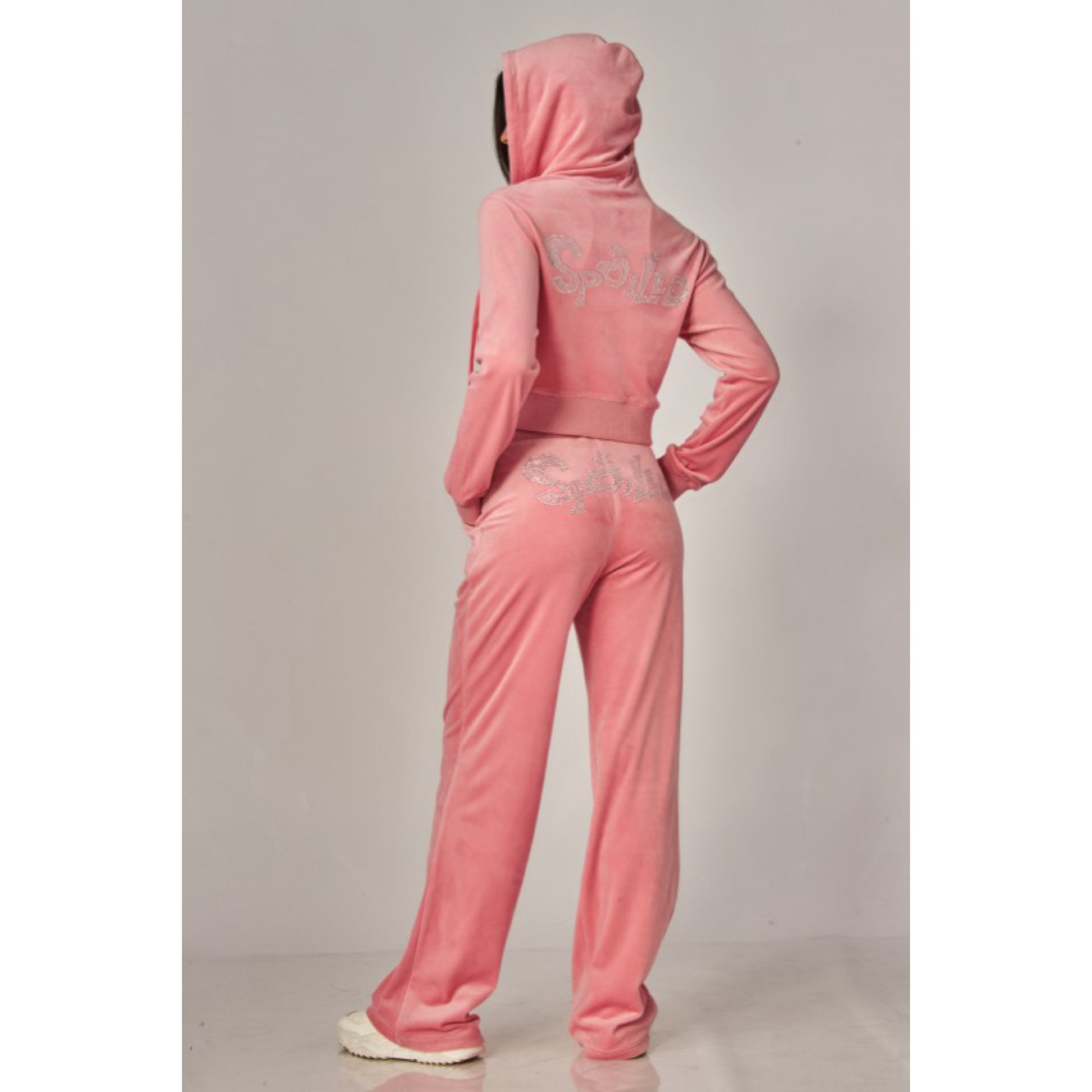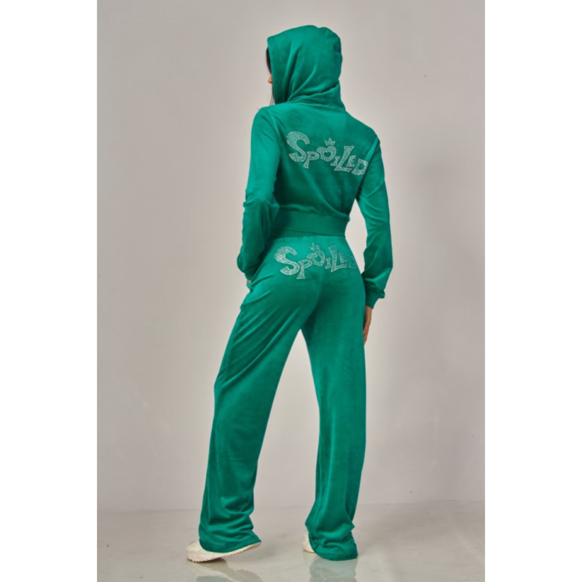 A cropped track jacket has a drawstring hood, front pockets, and rhinestone logo graphics on the front and back. Low rise pants have spoiled spelled out in rhinestones at back, and a ribbed elastic waistband