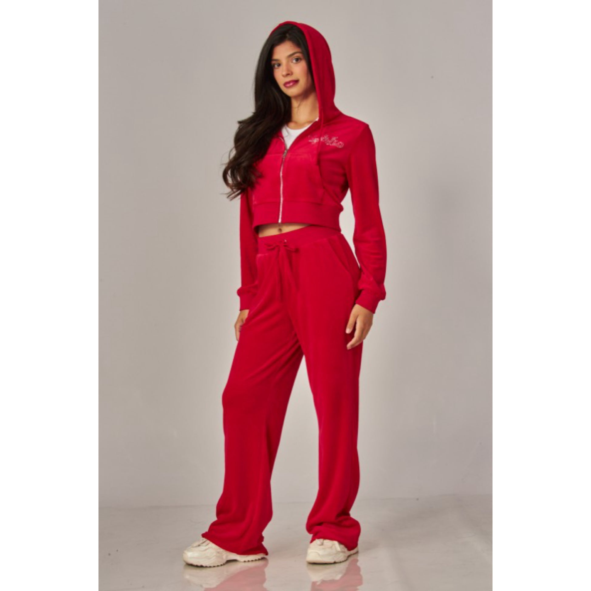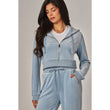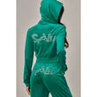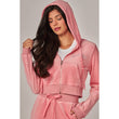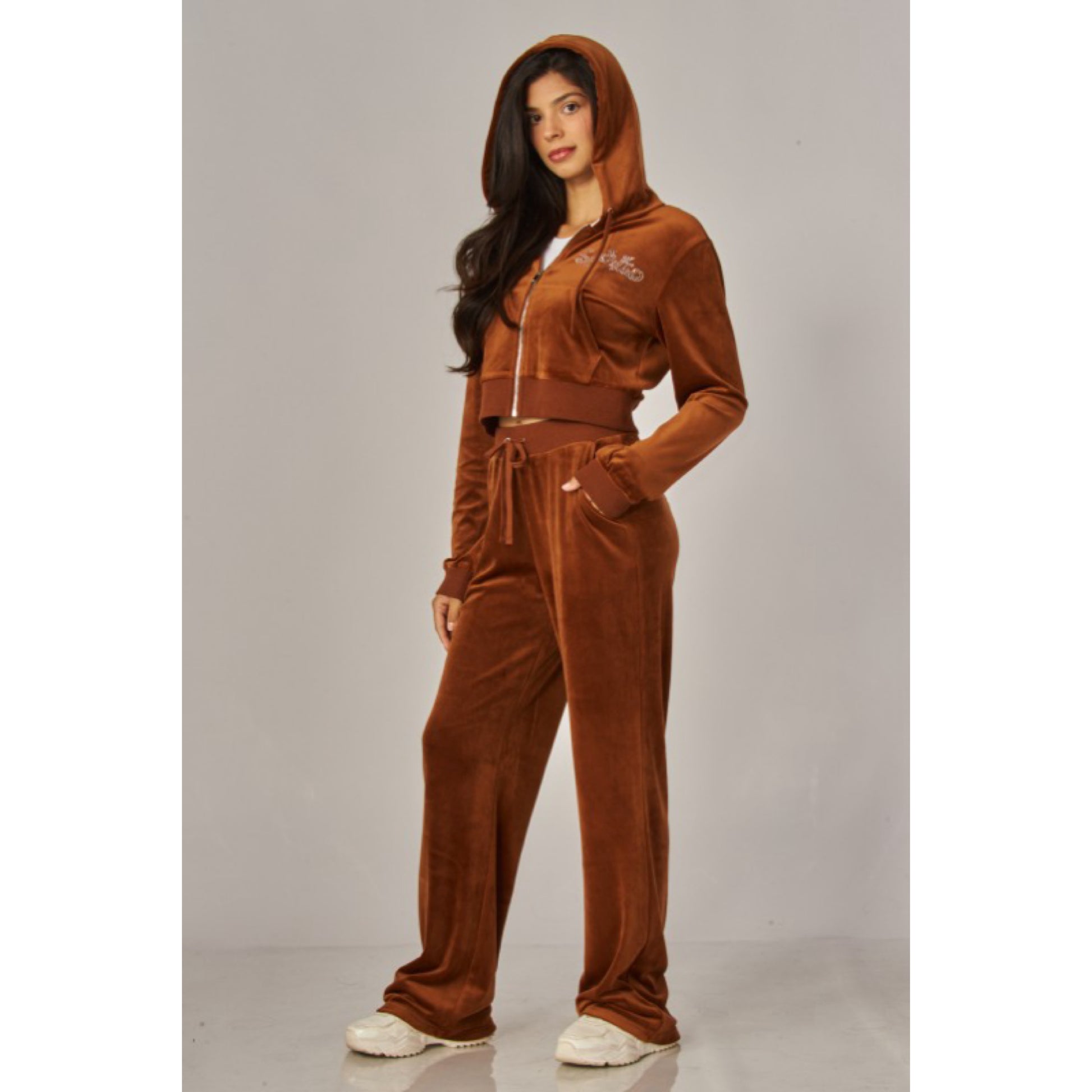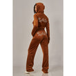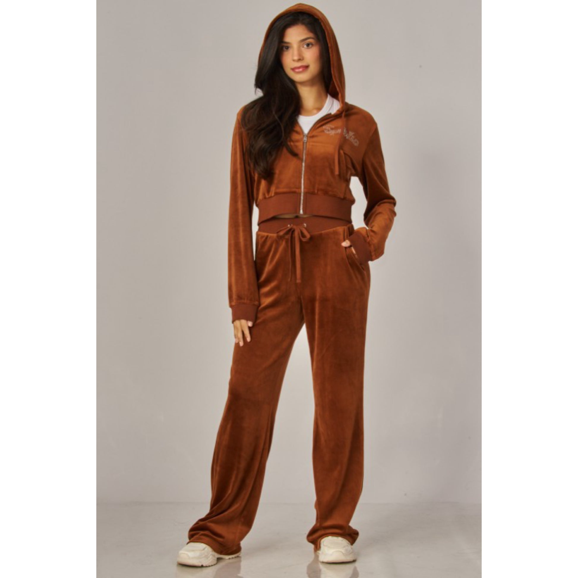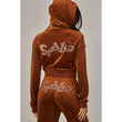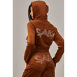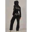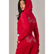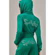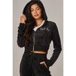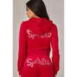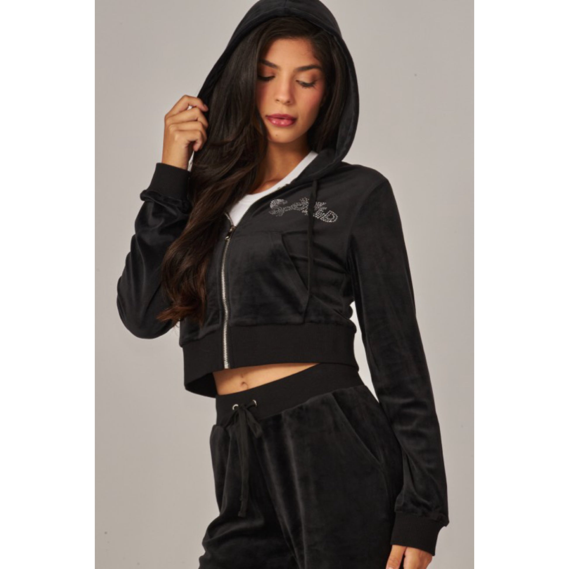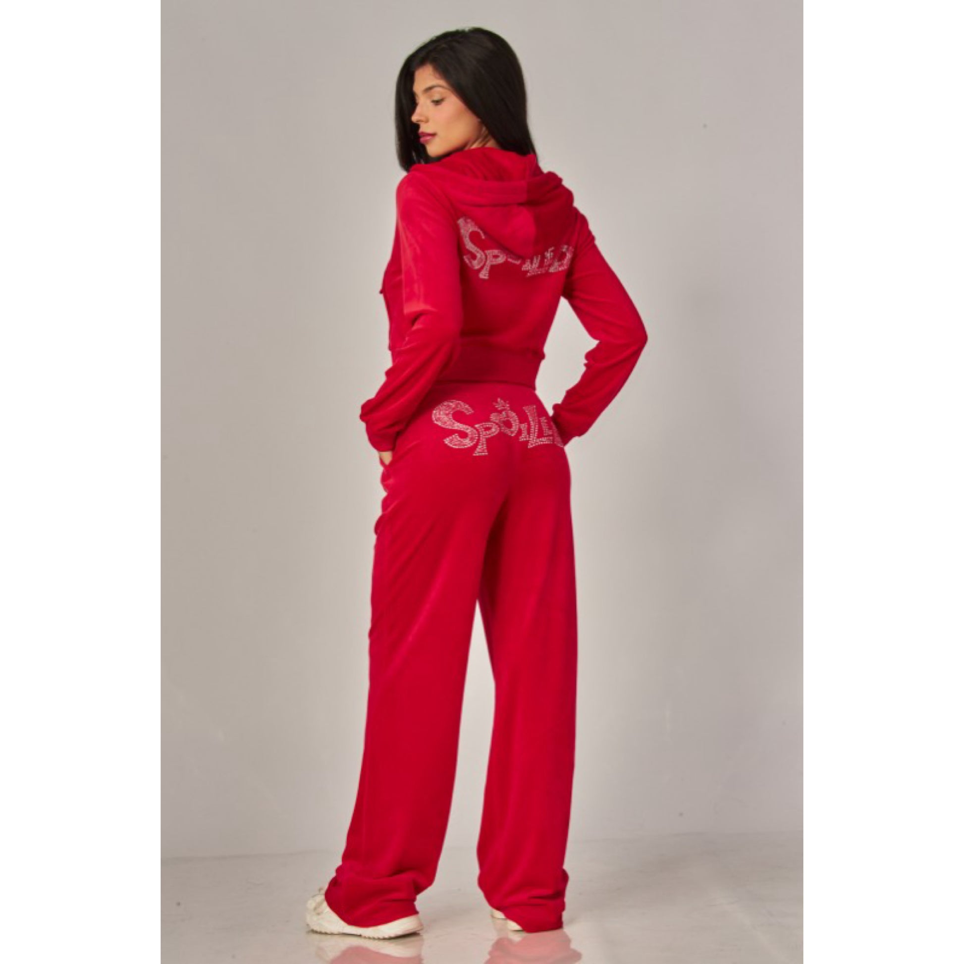 A cropped track jacket has a drawstring hood, front pockets, and rhinestone logo graphics on the front and back. Low rise pants have spoiled spelled out in rhinestones at back, and a ribbed elastic waistband