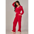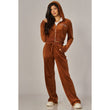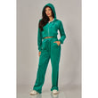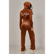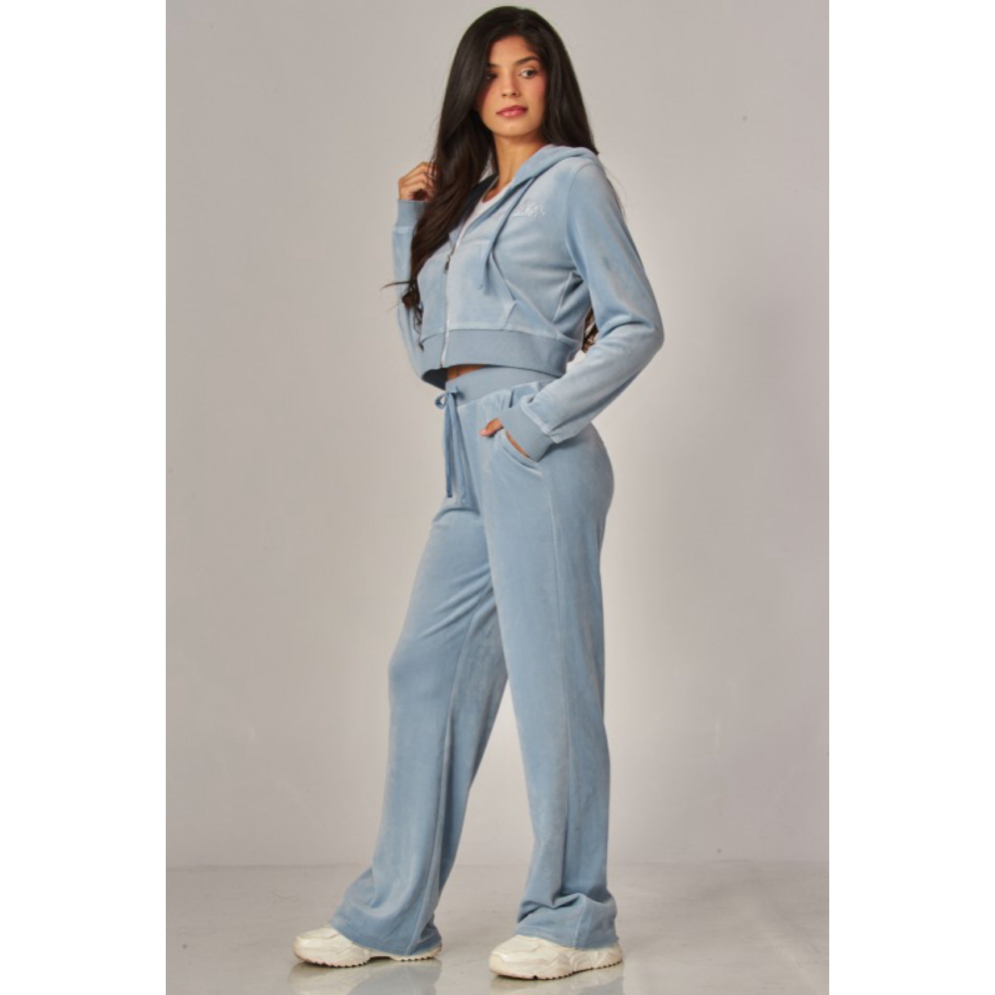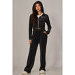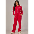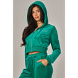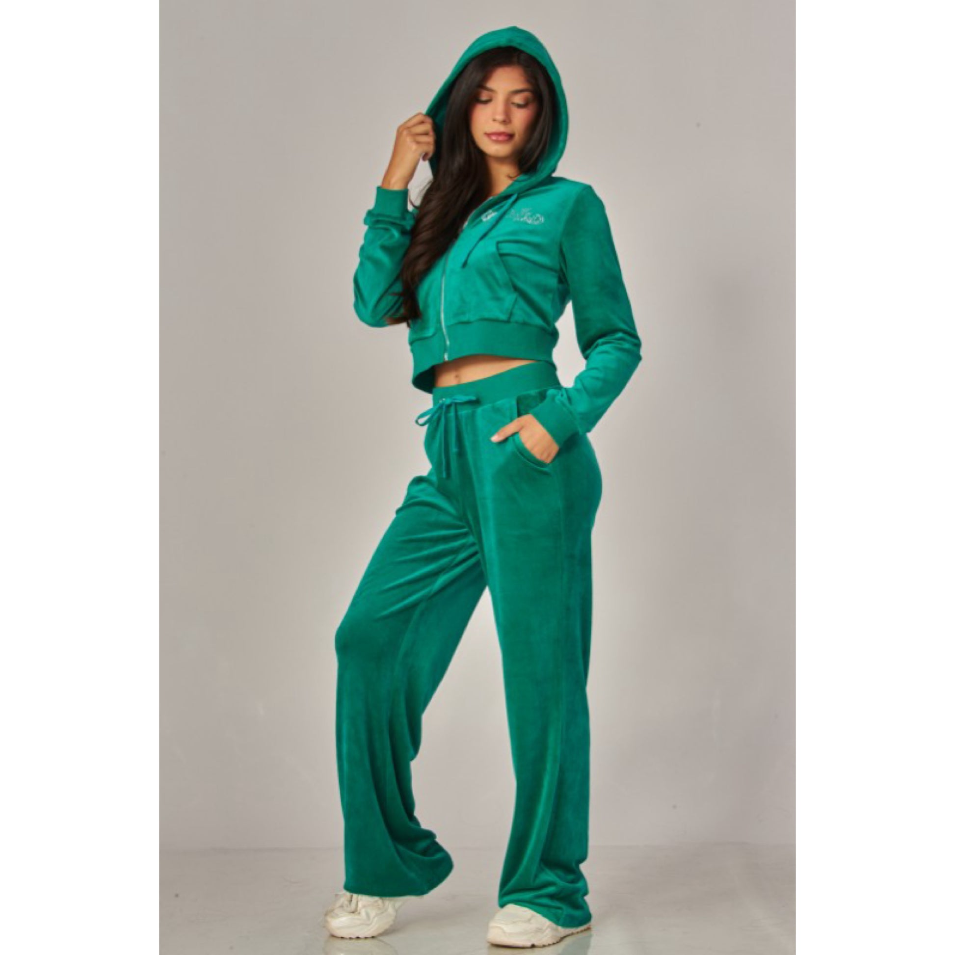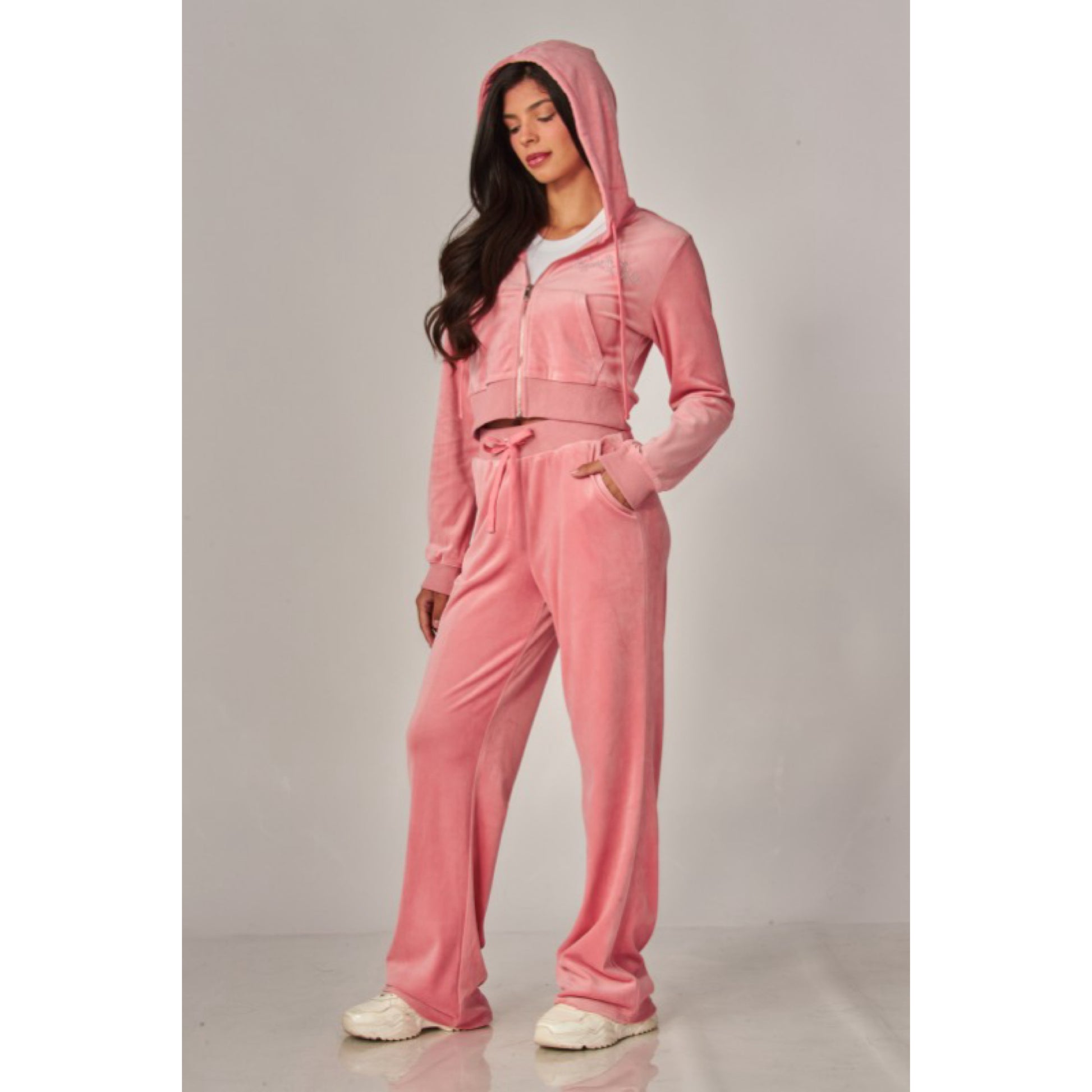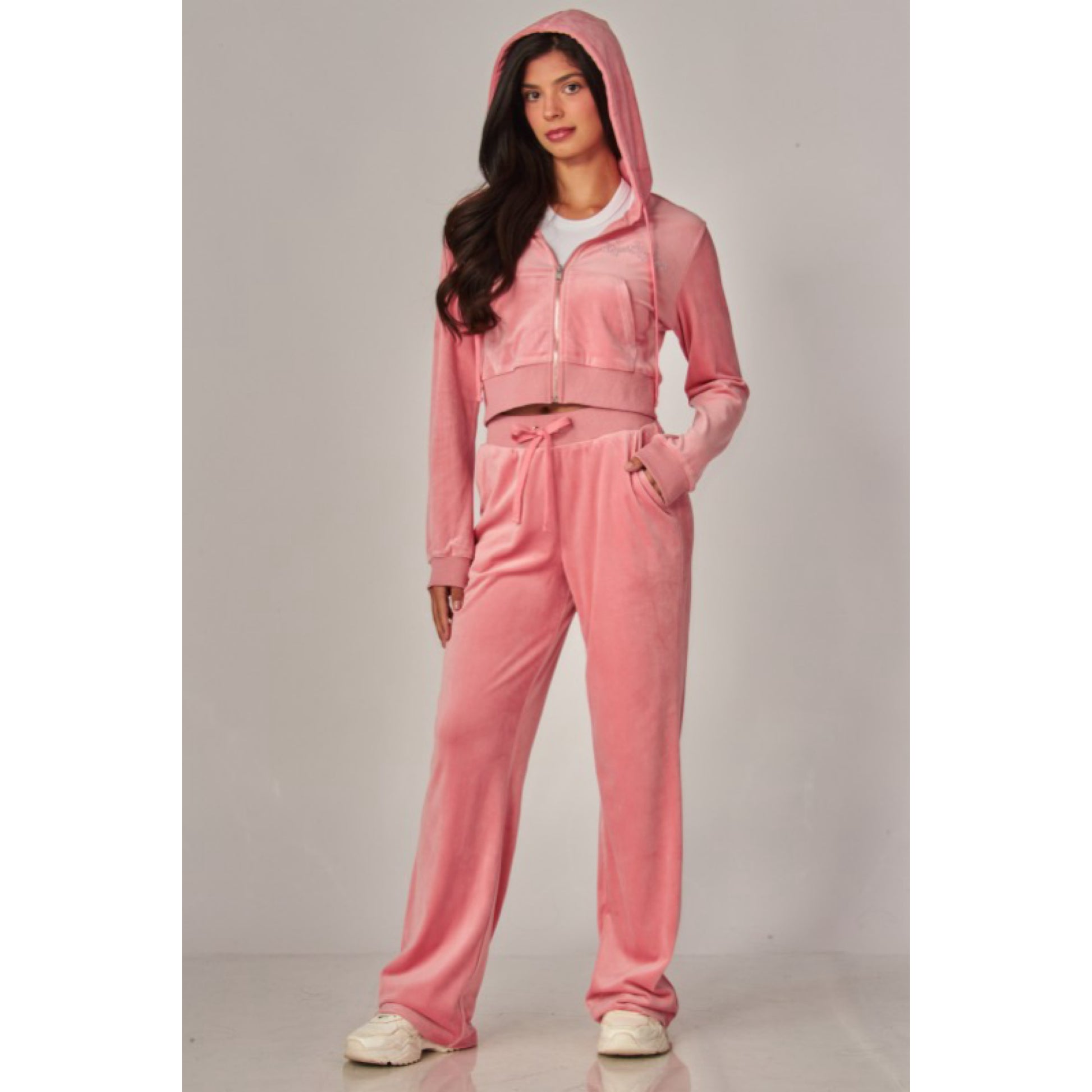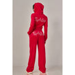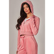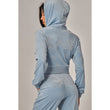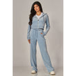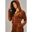 A cropped track jacket has a drawstring hood, front pockets, and rhinestone logo graphics on the front and back. Low rise pants have spoiled spelled out in rhinestones at back, and a ribbed elastic waistband