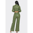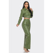 Long sleeves cropped front zipper jacket with padded shoulders embellished with rhinestones and textured print.
