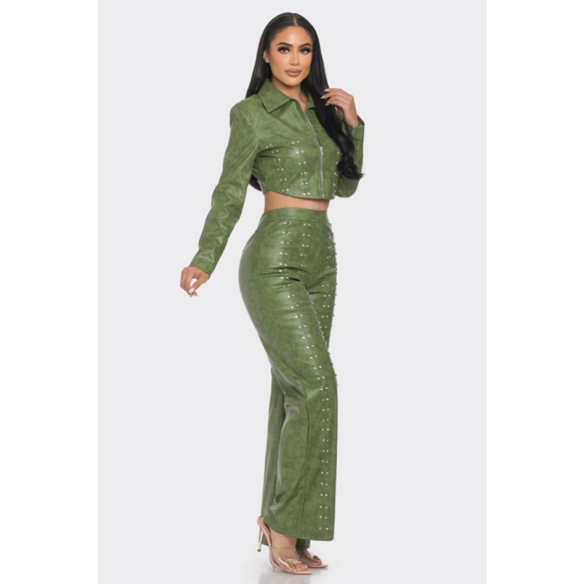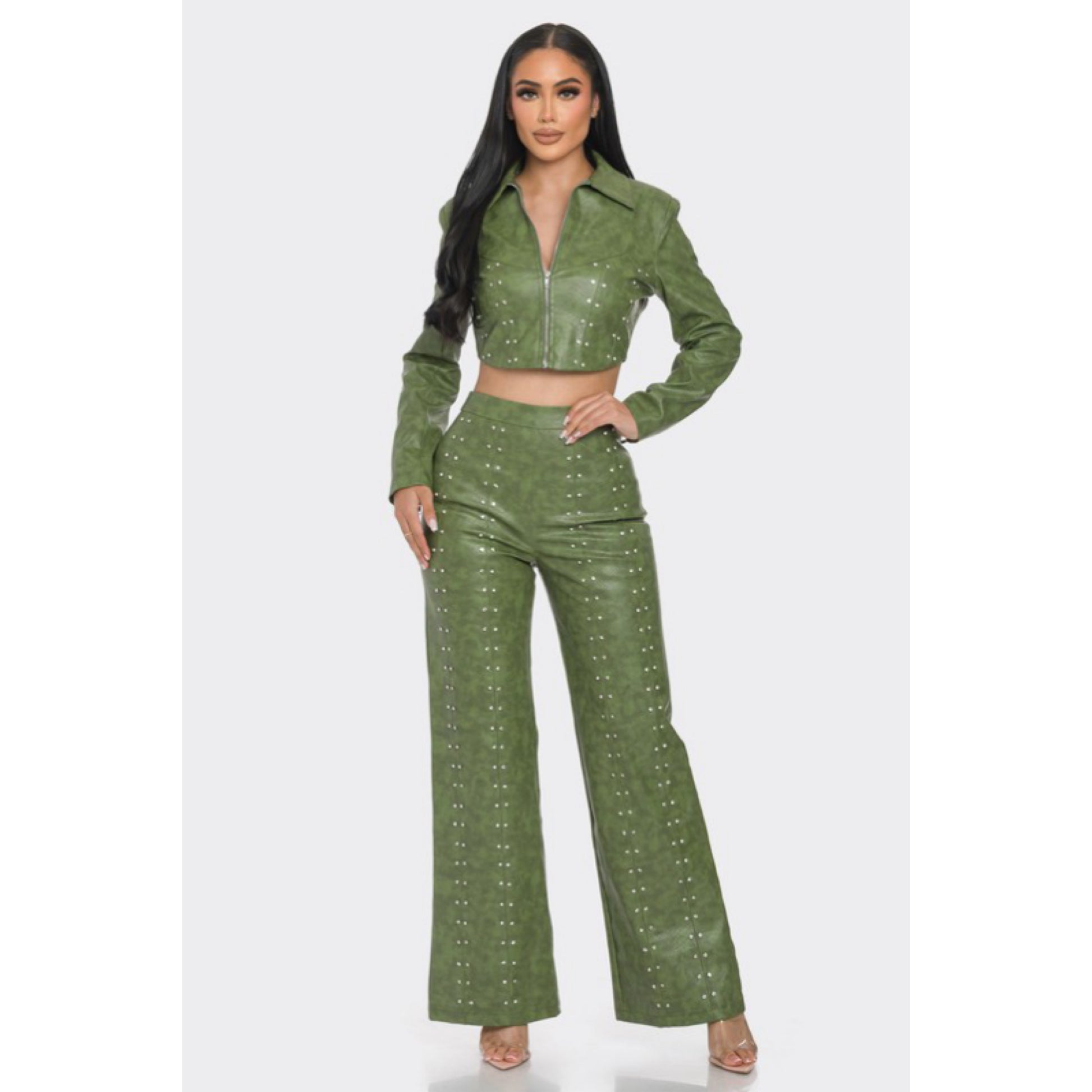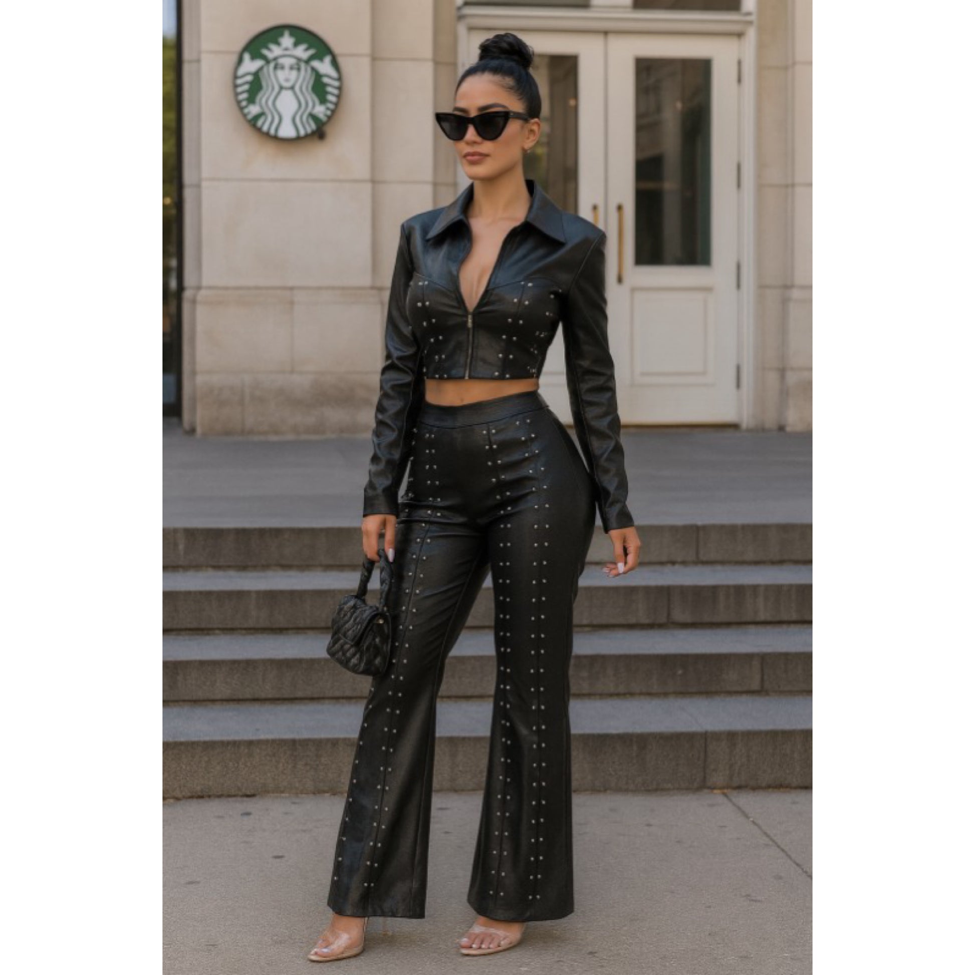 Wide leg high waisted pants embellished with rhinestones and back zipper