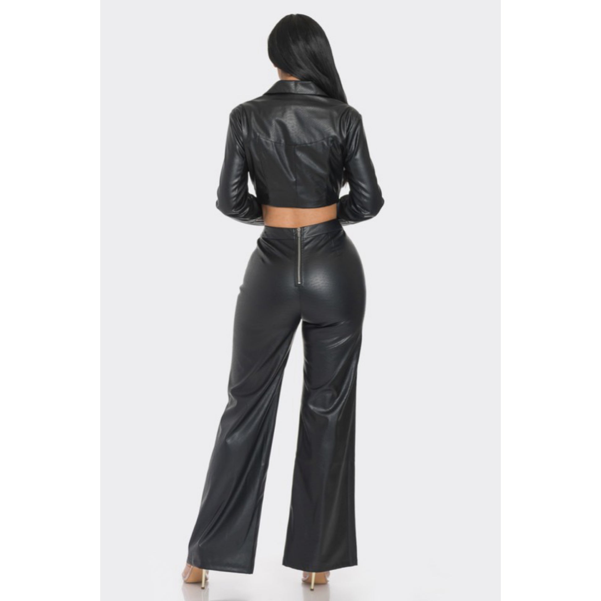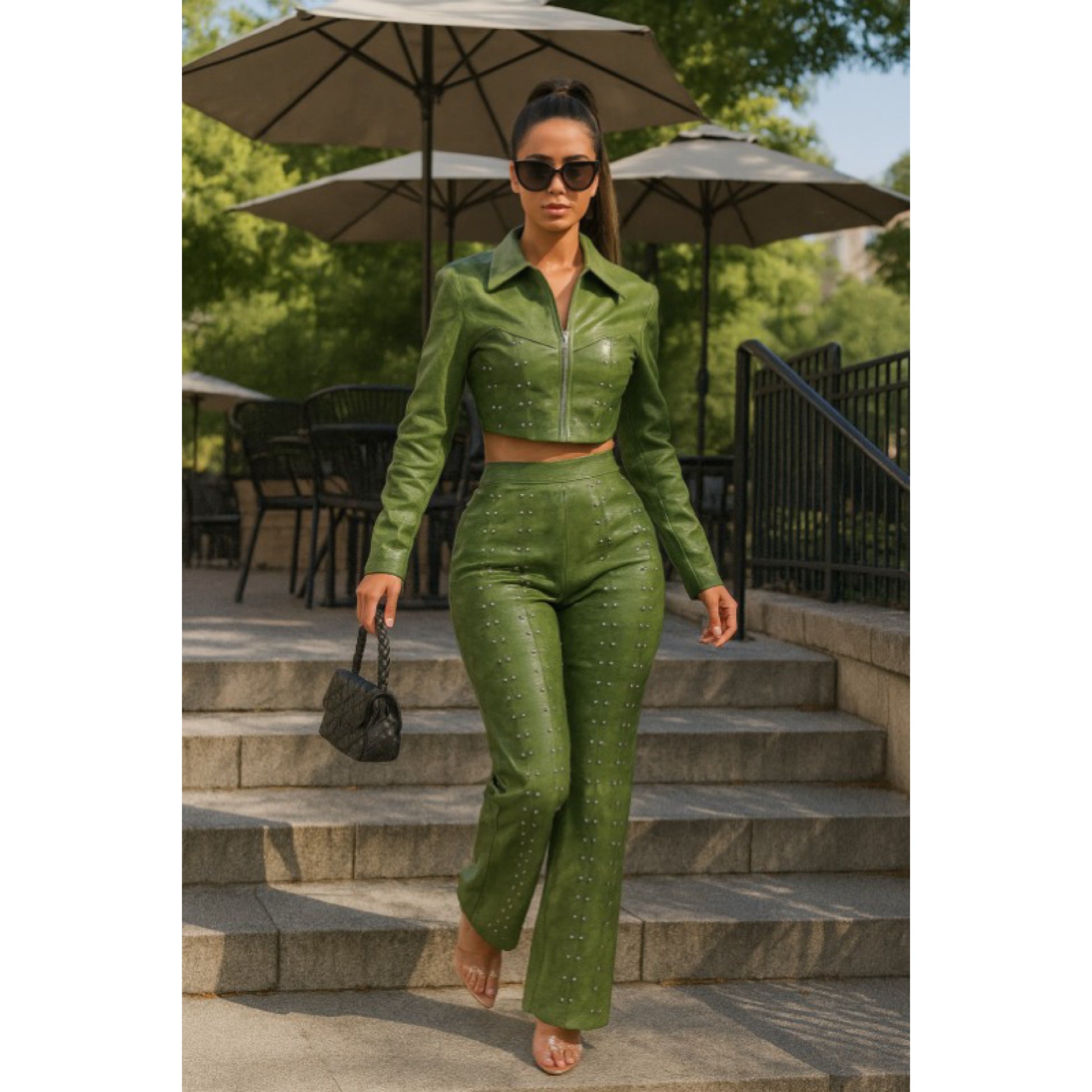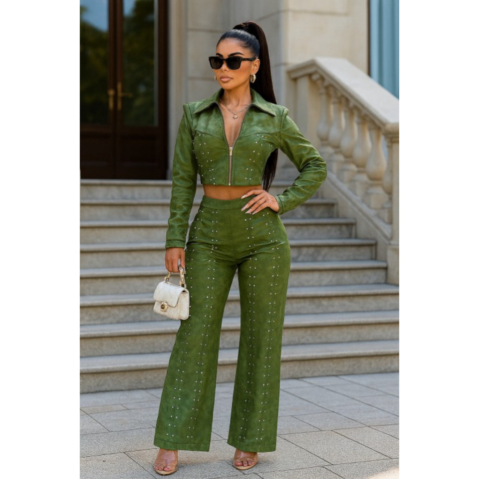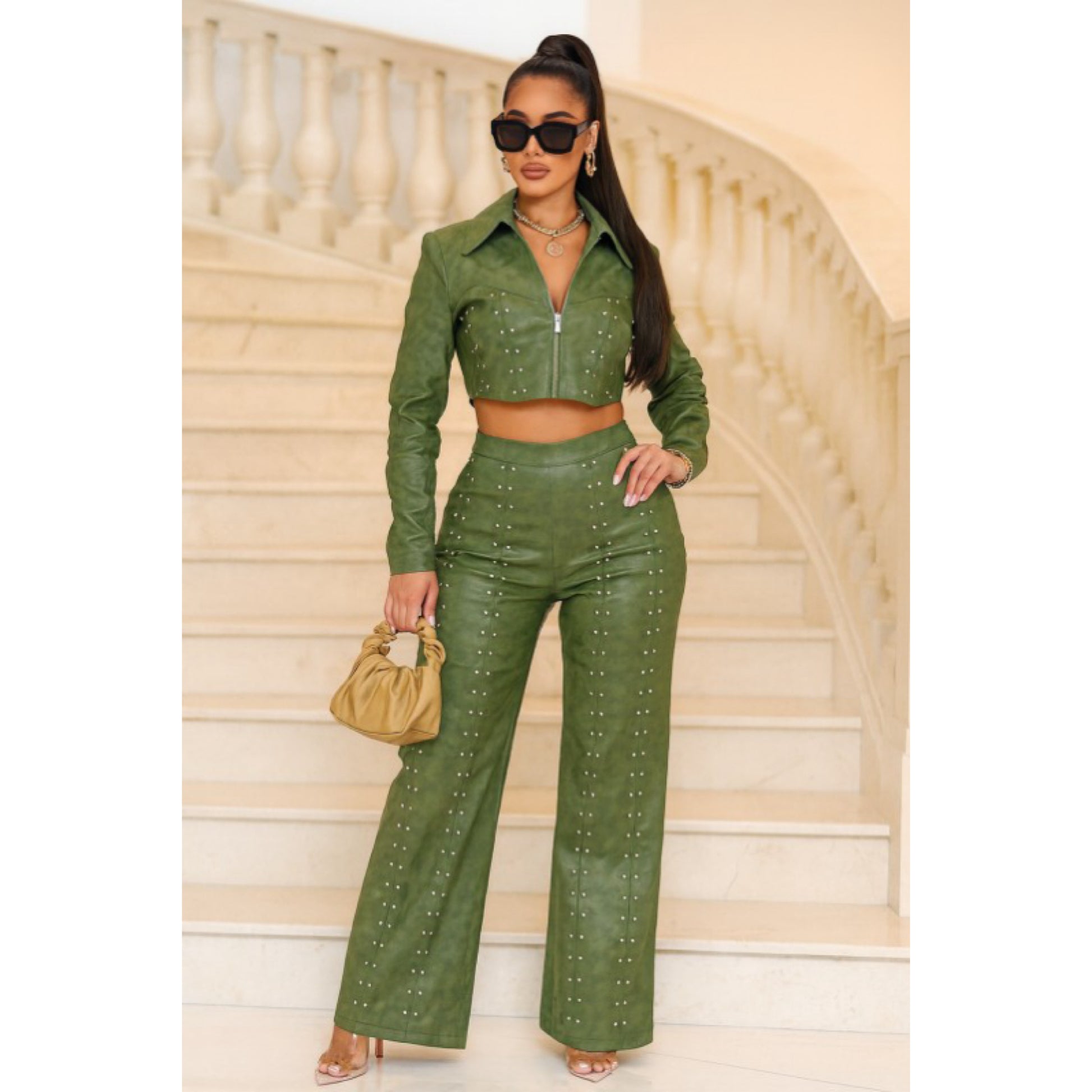 Wide leg high waisted pants embellished with rhinestones and back zipper
