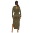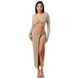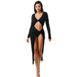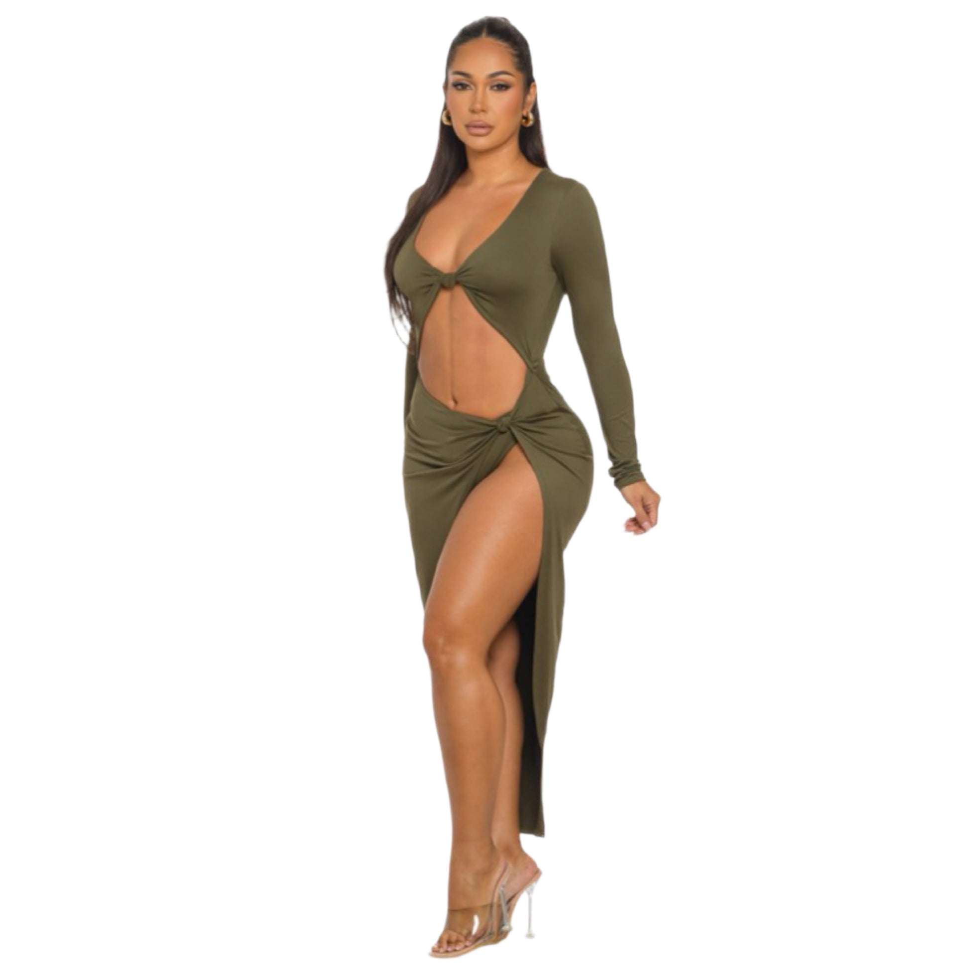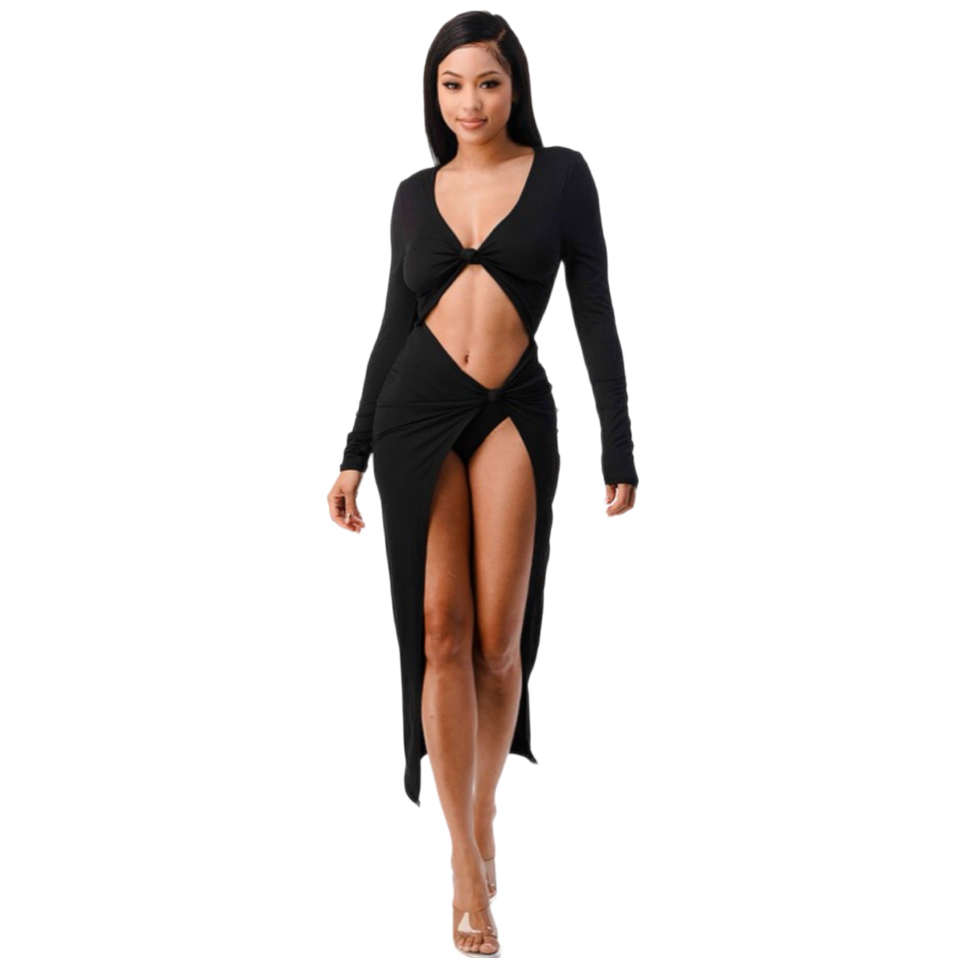 Long sleeves midi dress with a cutout keyhole back with button loop closure. Comes with matching bikini bottom