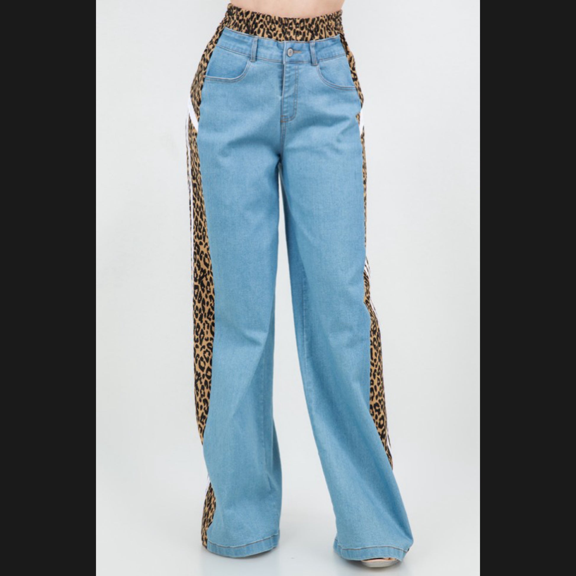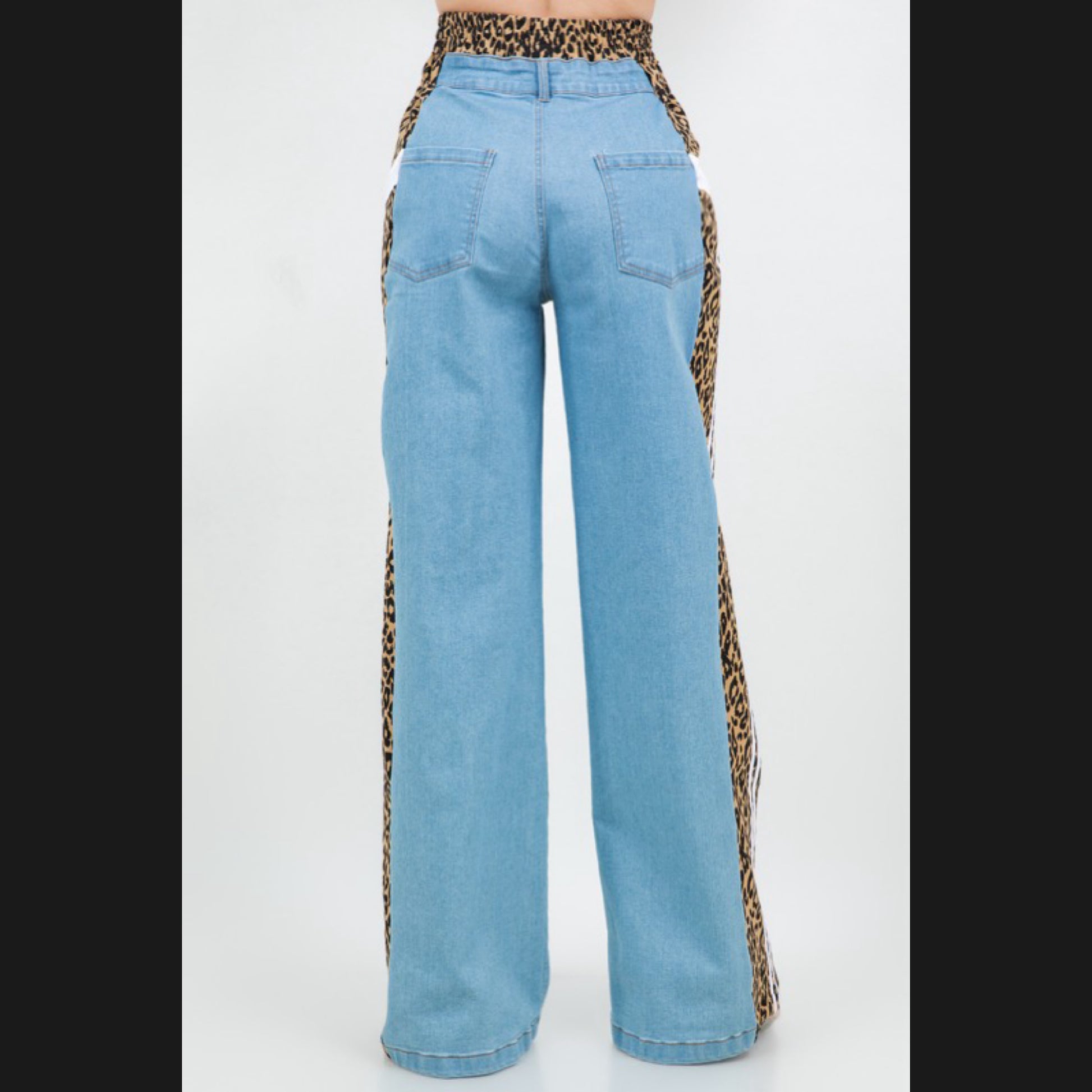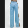 Medium wash denim combo with Leopard fabric with line detail