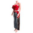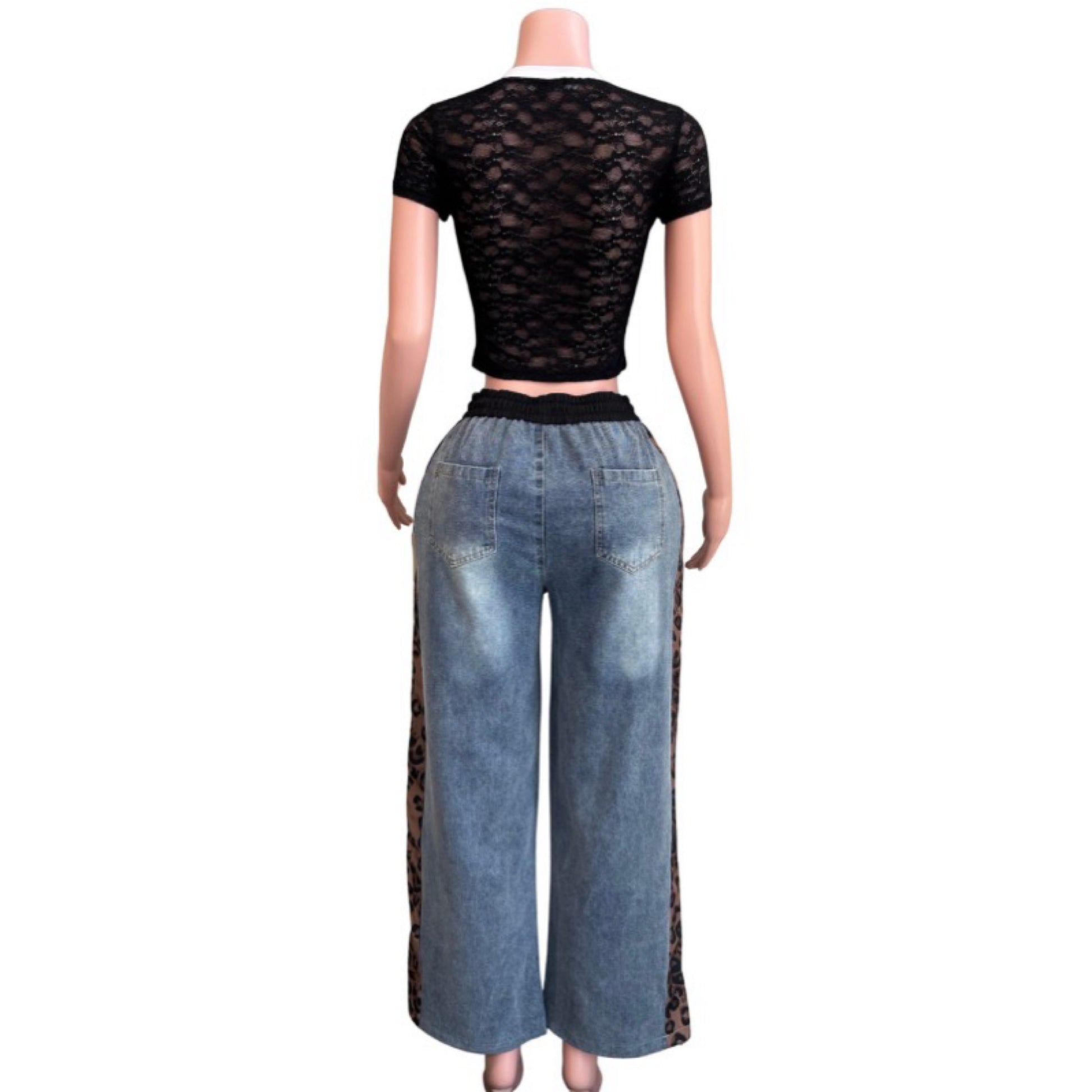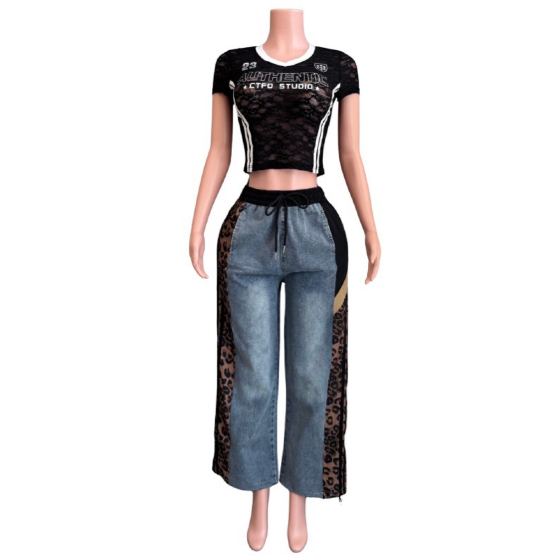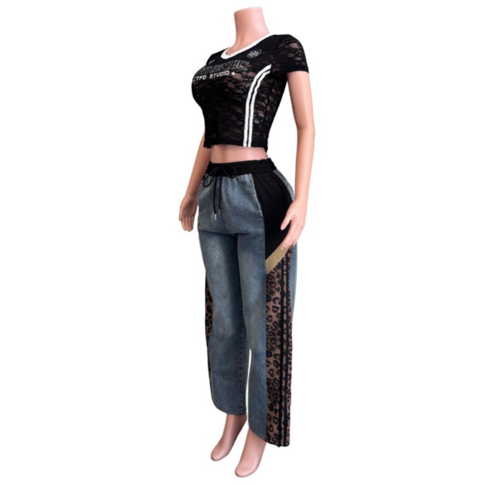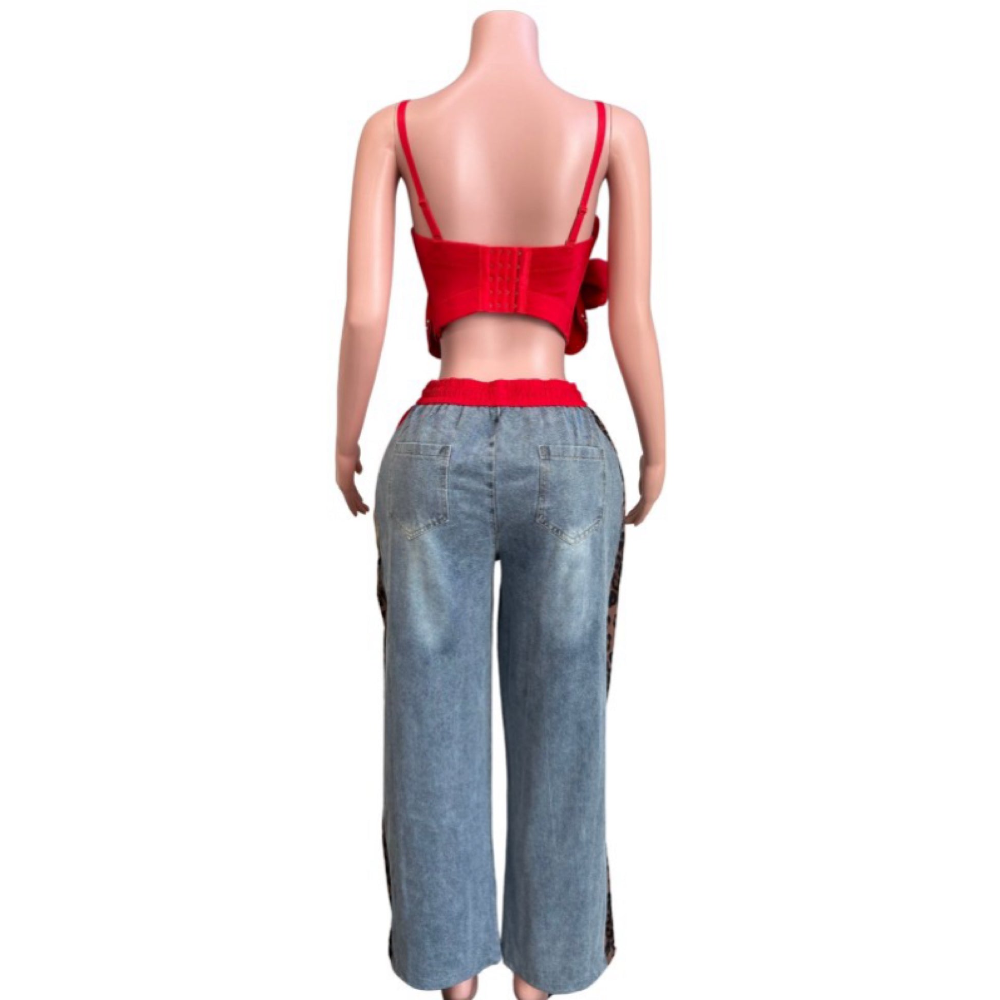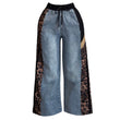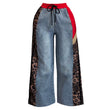 These jogger pants feature a bold, contrasting design combining denim, leopard print, and color block panels. These pants have a relaxed fit with a drawstring waist, allowing for adjustable comfort. The front and back showcase a mix of denim textures with striking red panels along the sides, accentuated by black stripes running down the leg. This dynamic combination creates a sporty yet trendy look, perfect for casual work or making a street style statement
