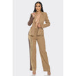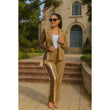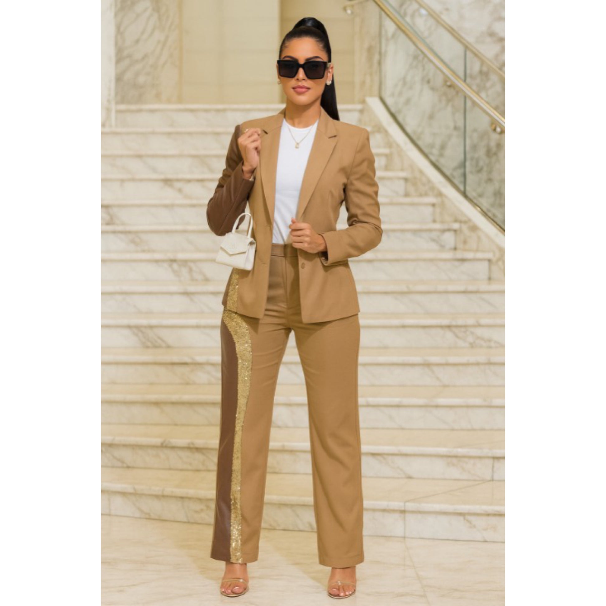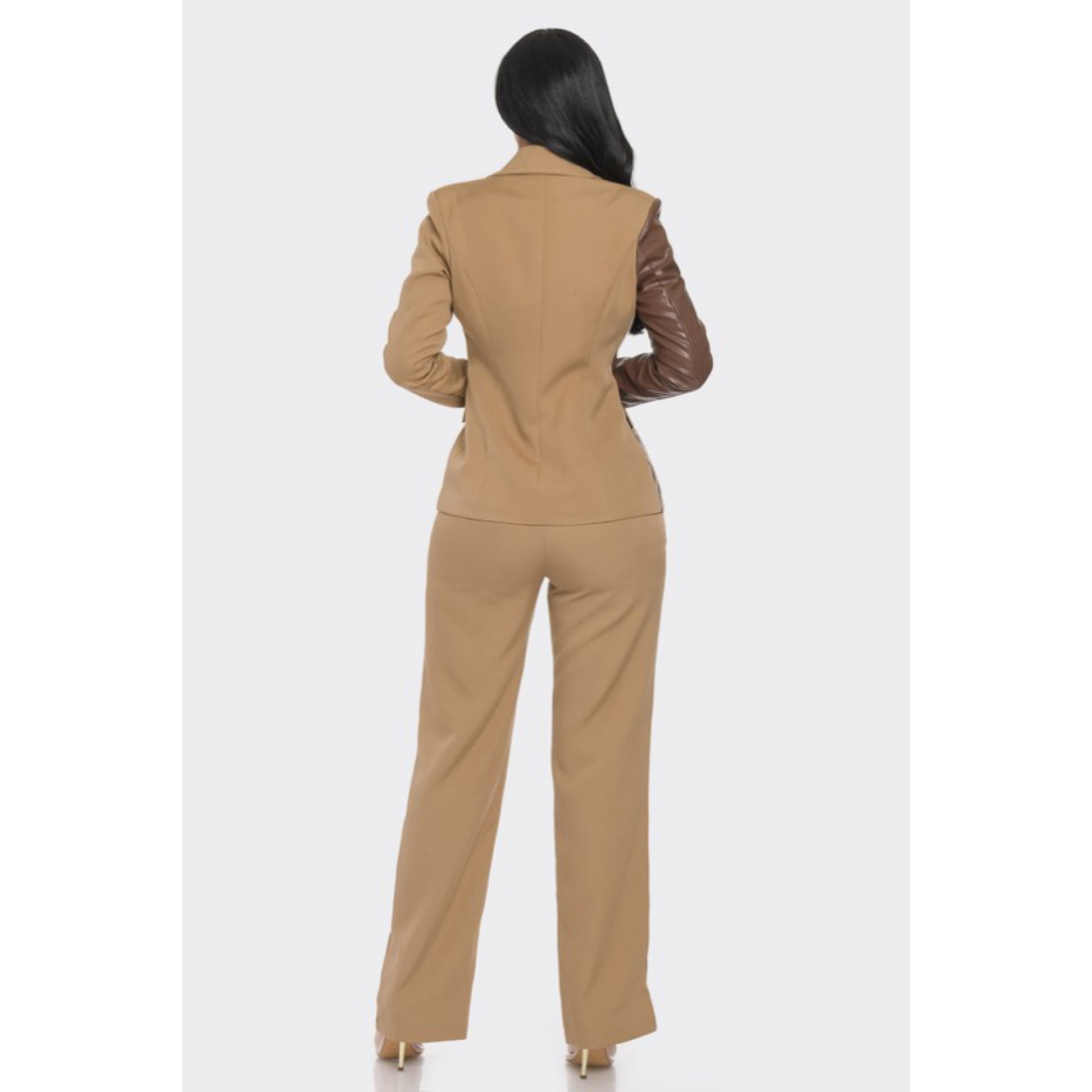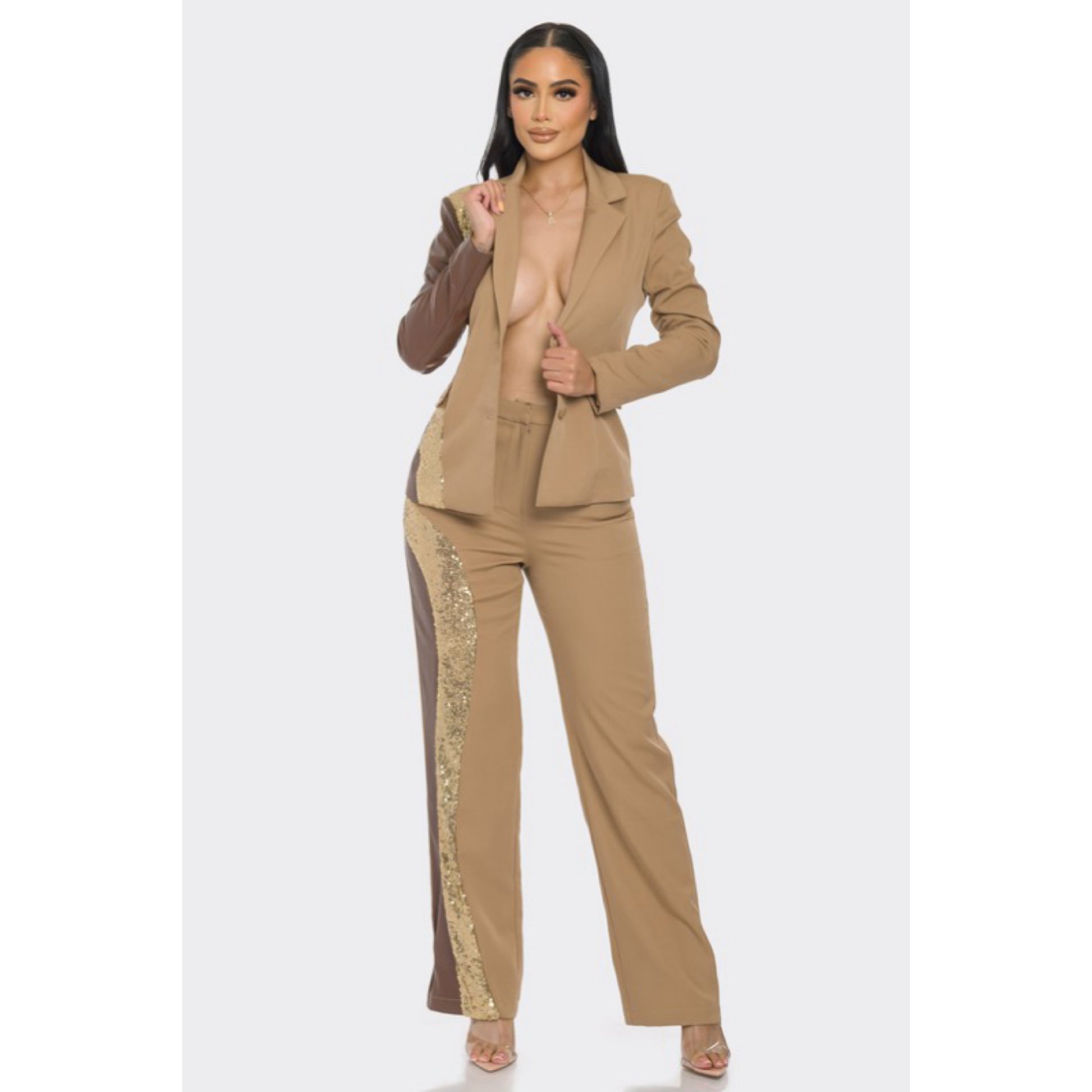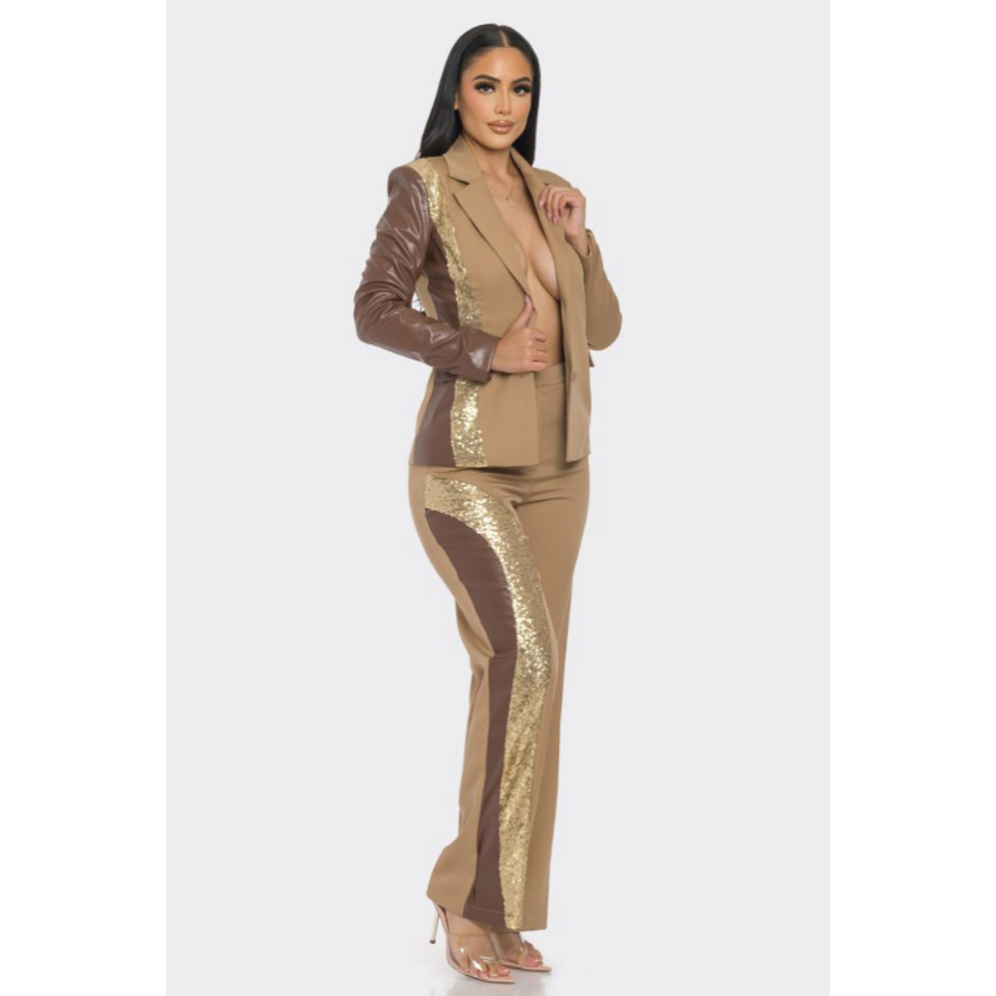 Sequin and pu leather blazer and straight leg pants with hook closure. Perfect for a business look to show off
