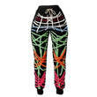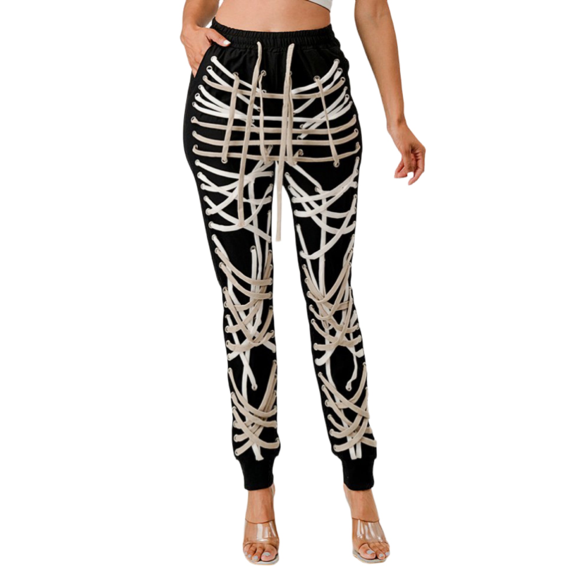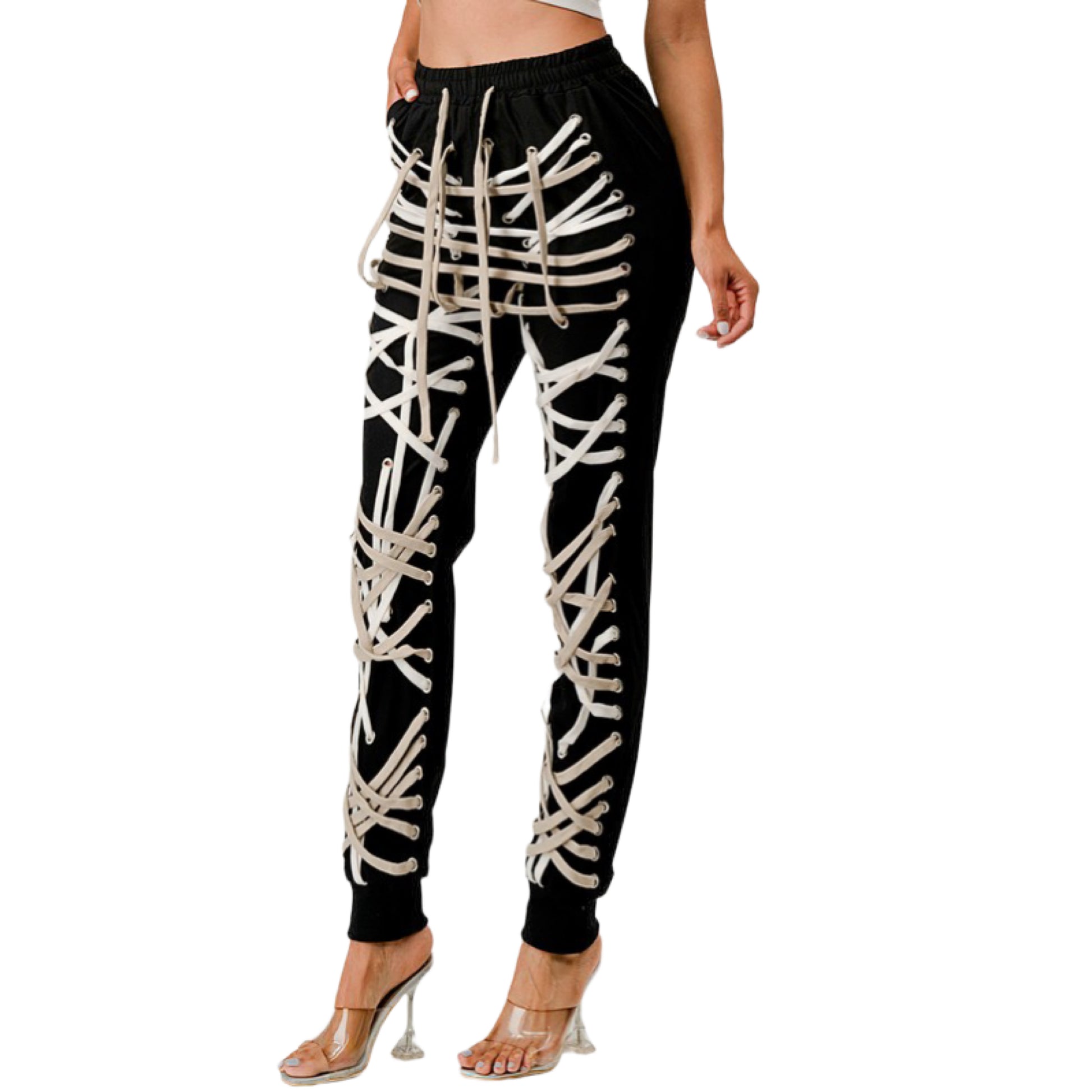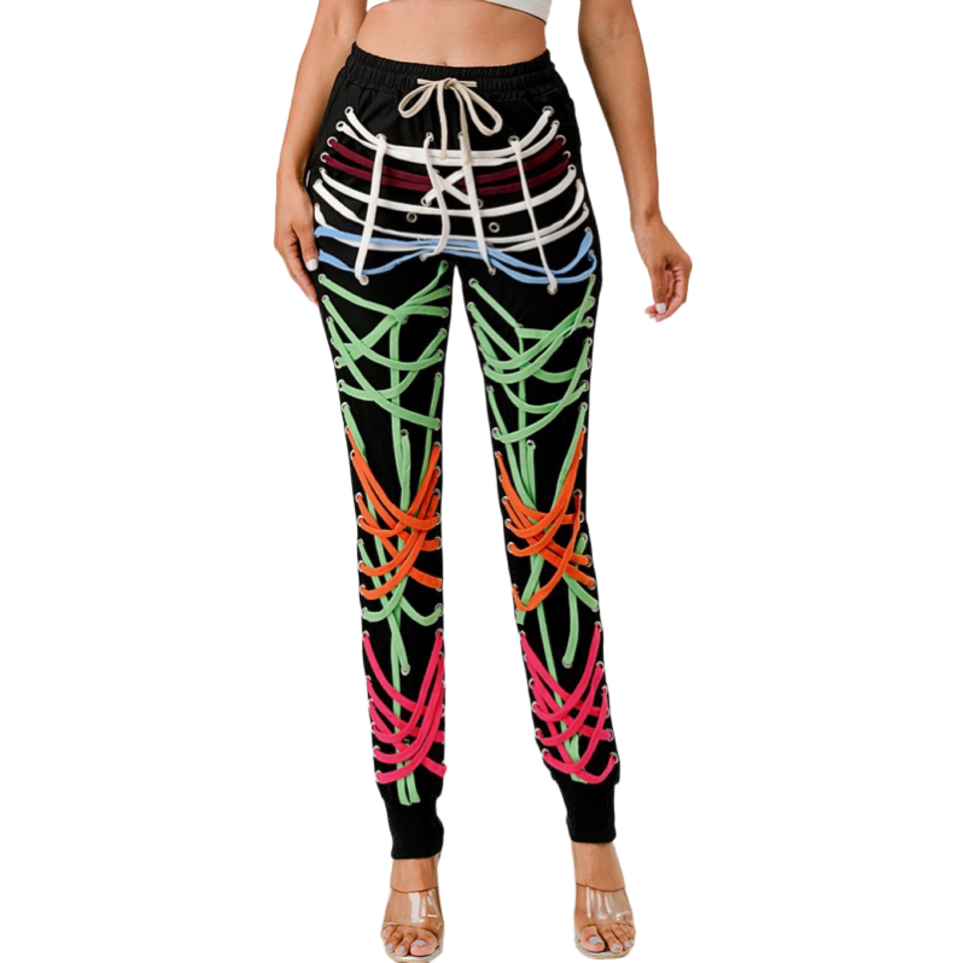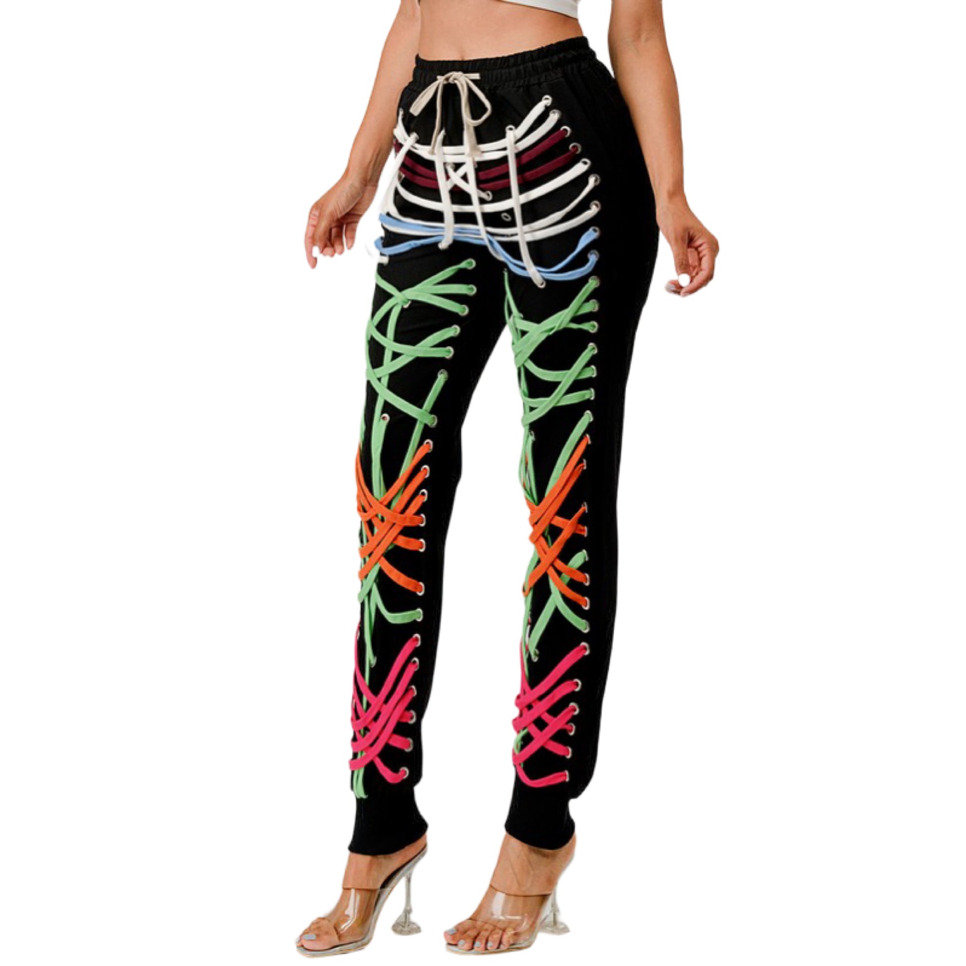 Joggers featuring a unique, colorful lace-up design. The lacing is prominent, with bright, multi-colored strings crisscrossing through metal grommets. creating a vibrant and eye-catching pattern along the front of the pants. The waistband is elastic with an adjustable drawstring, ensuring a comfortable fit. The pants have a casual yet stylish appeal, perfect for making a bold fashion statement.