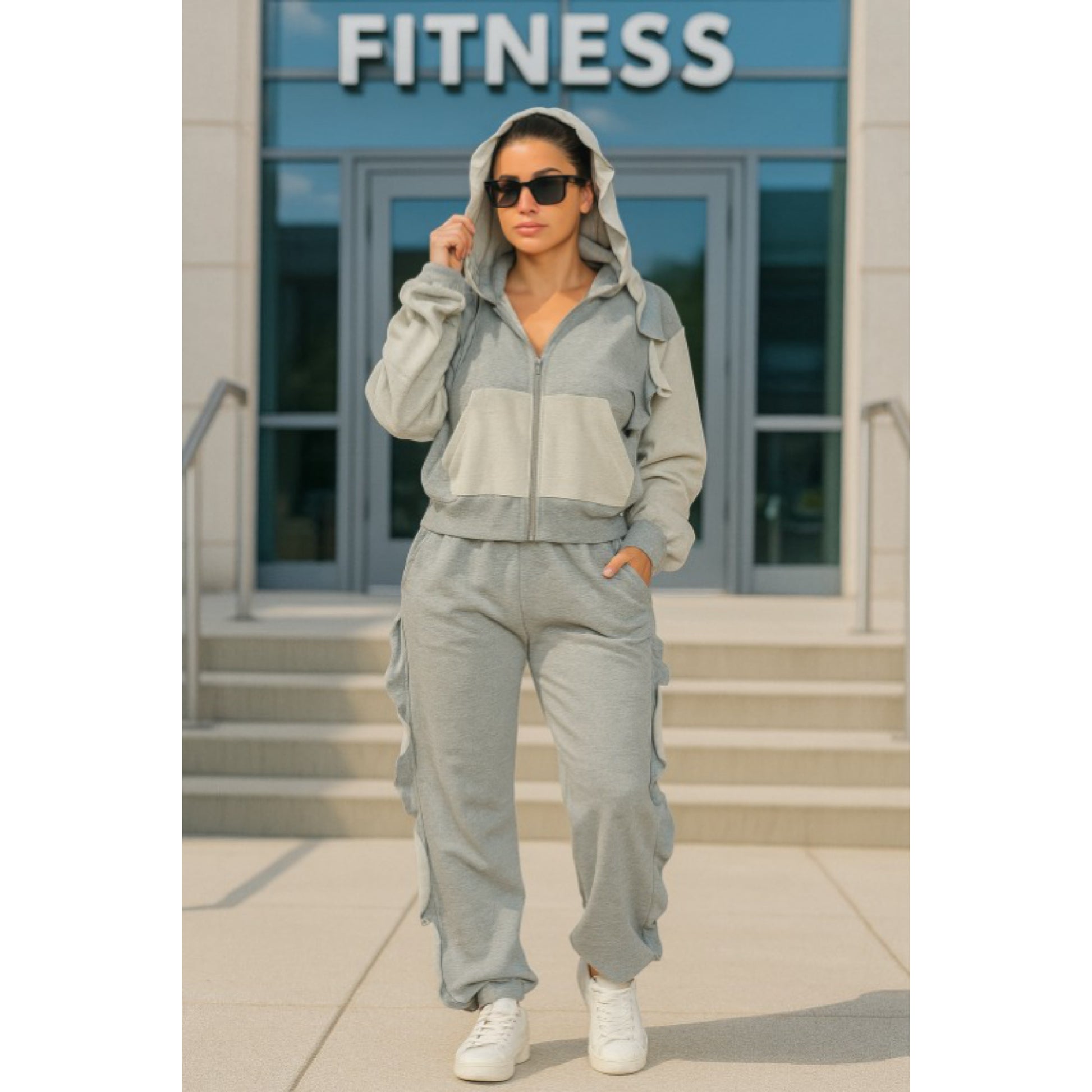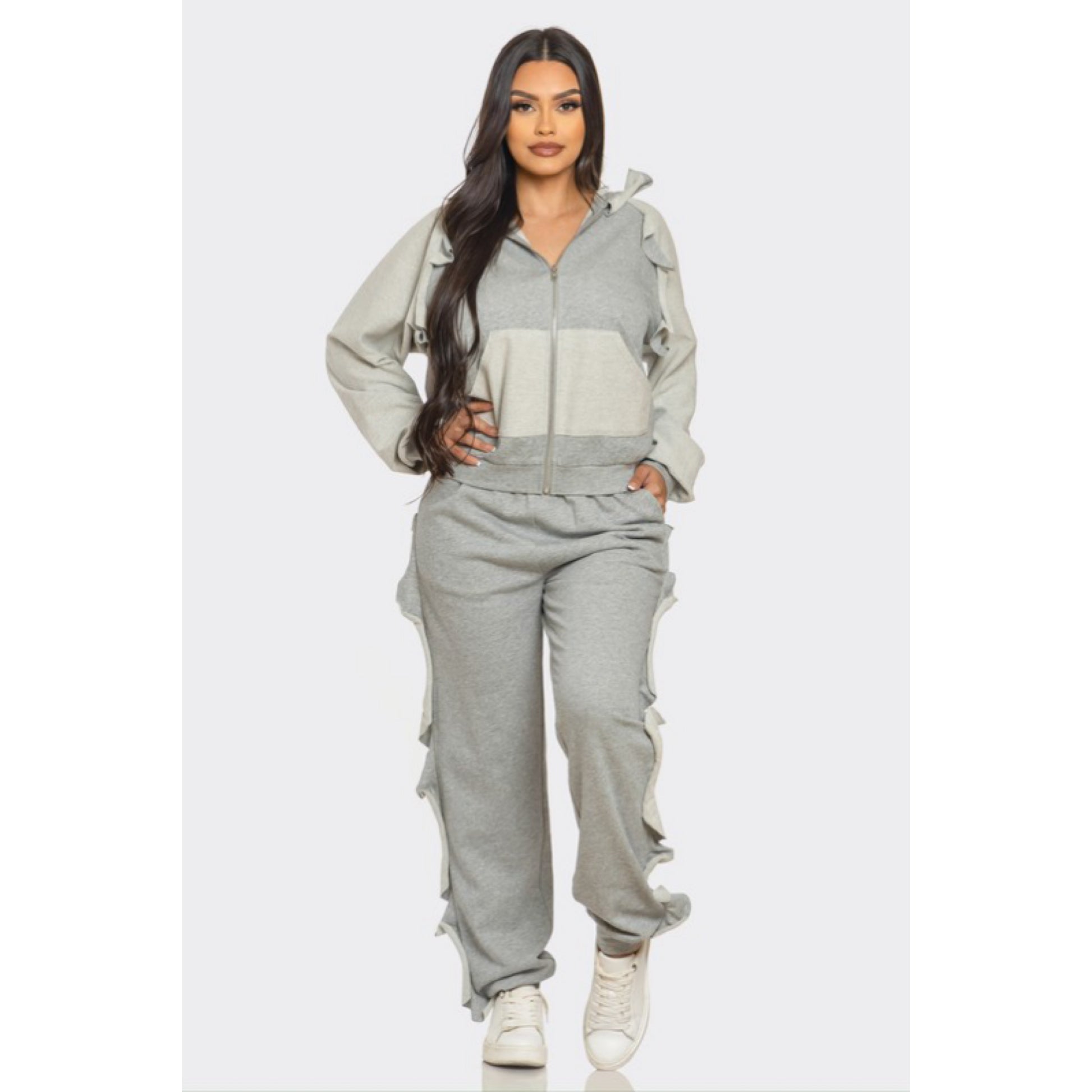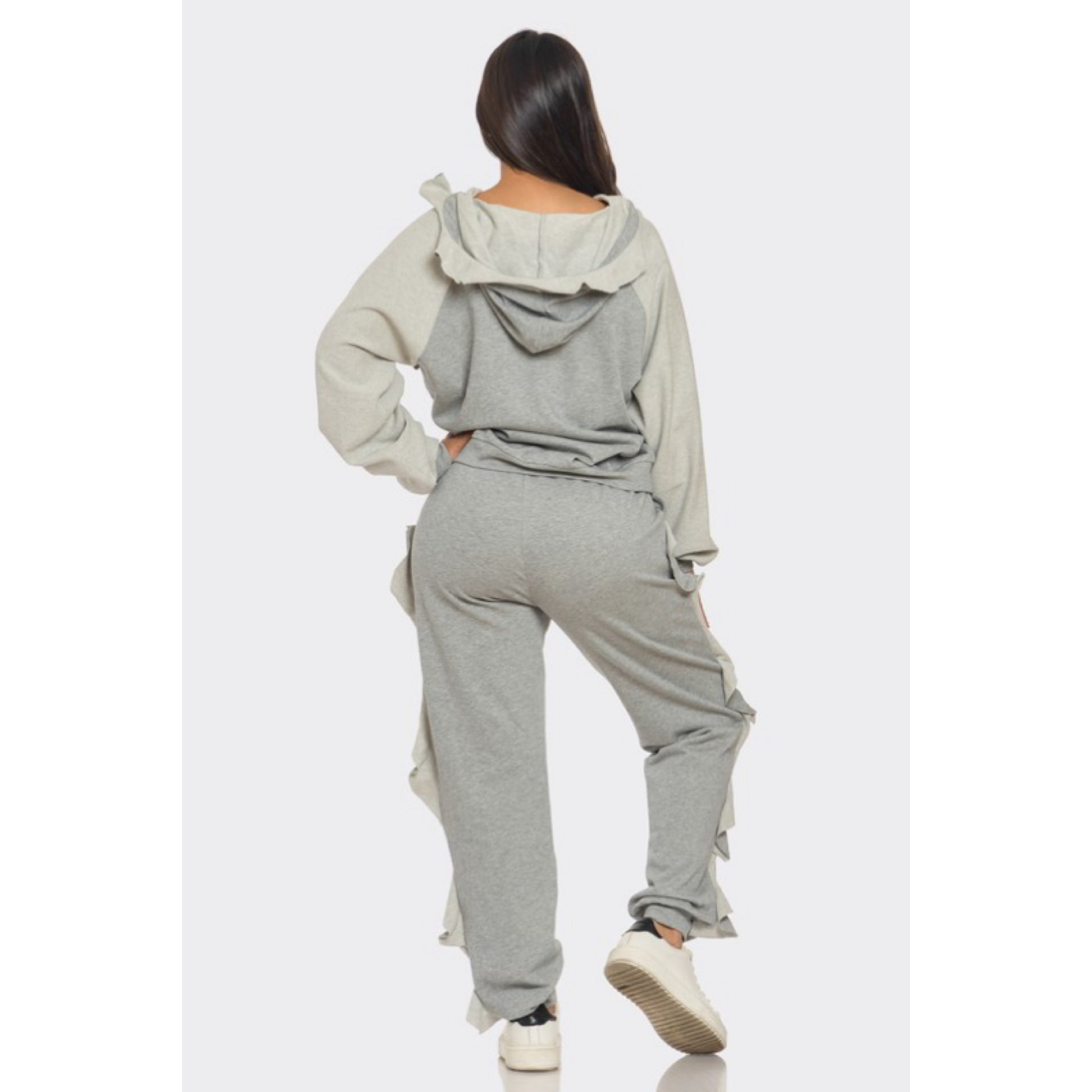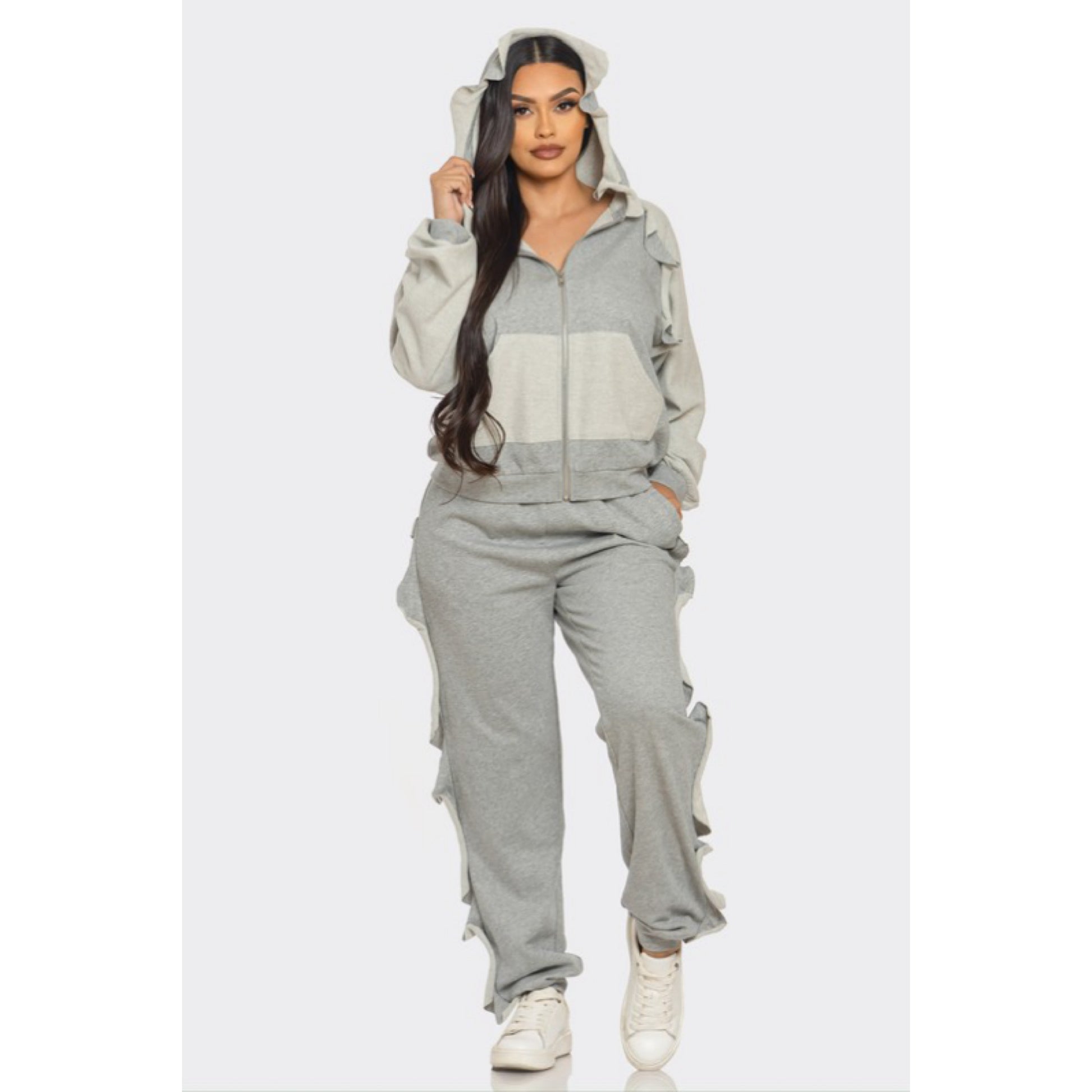 Ruffled sweatsuit with hoodie and pockets