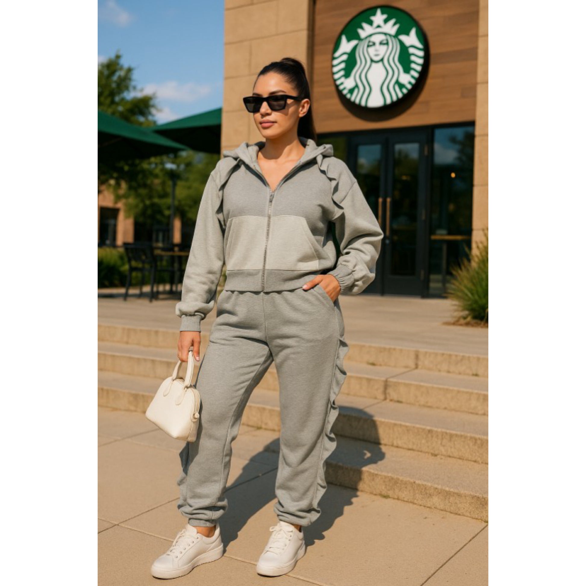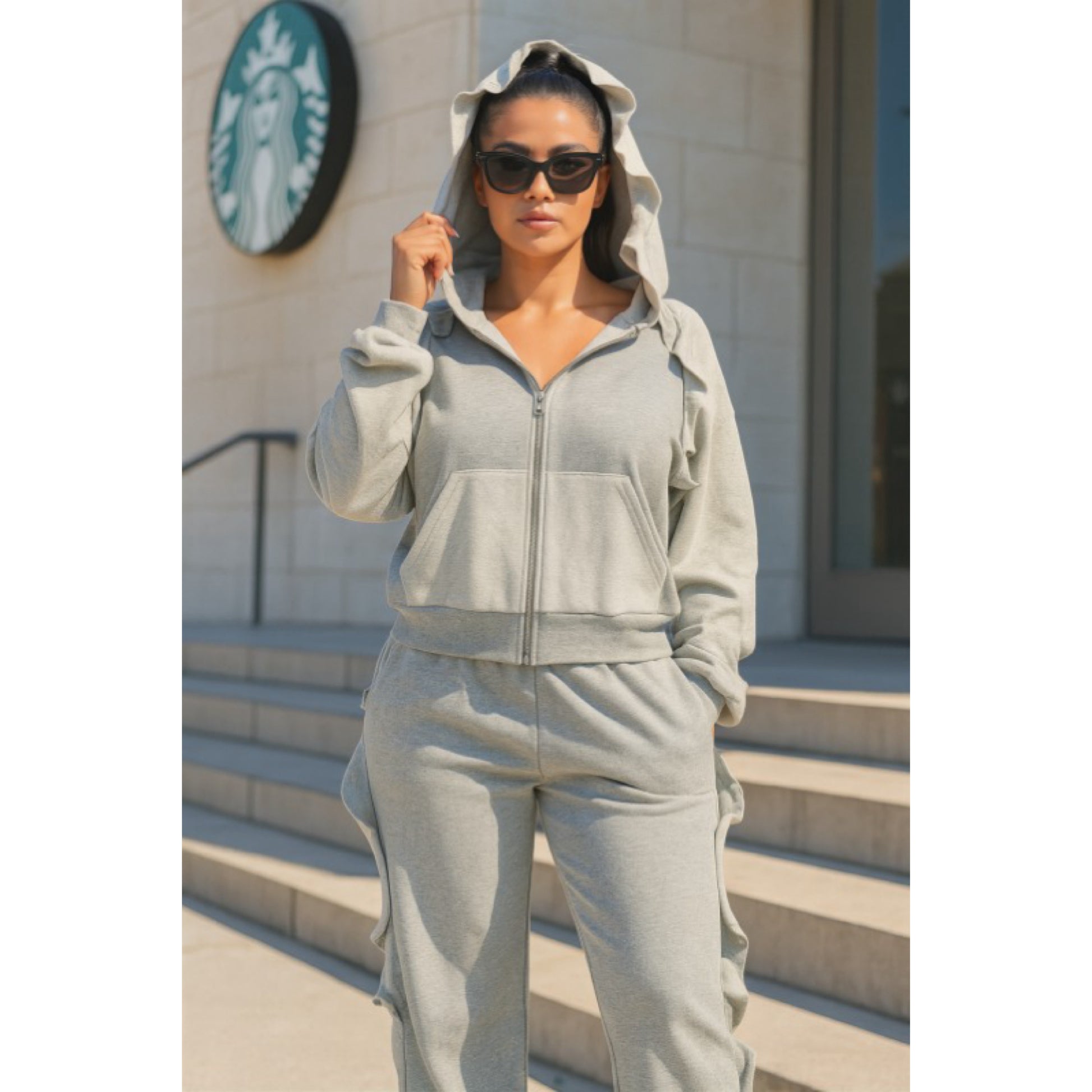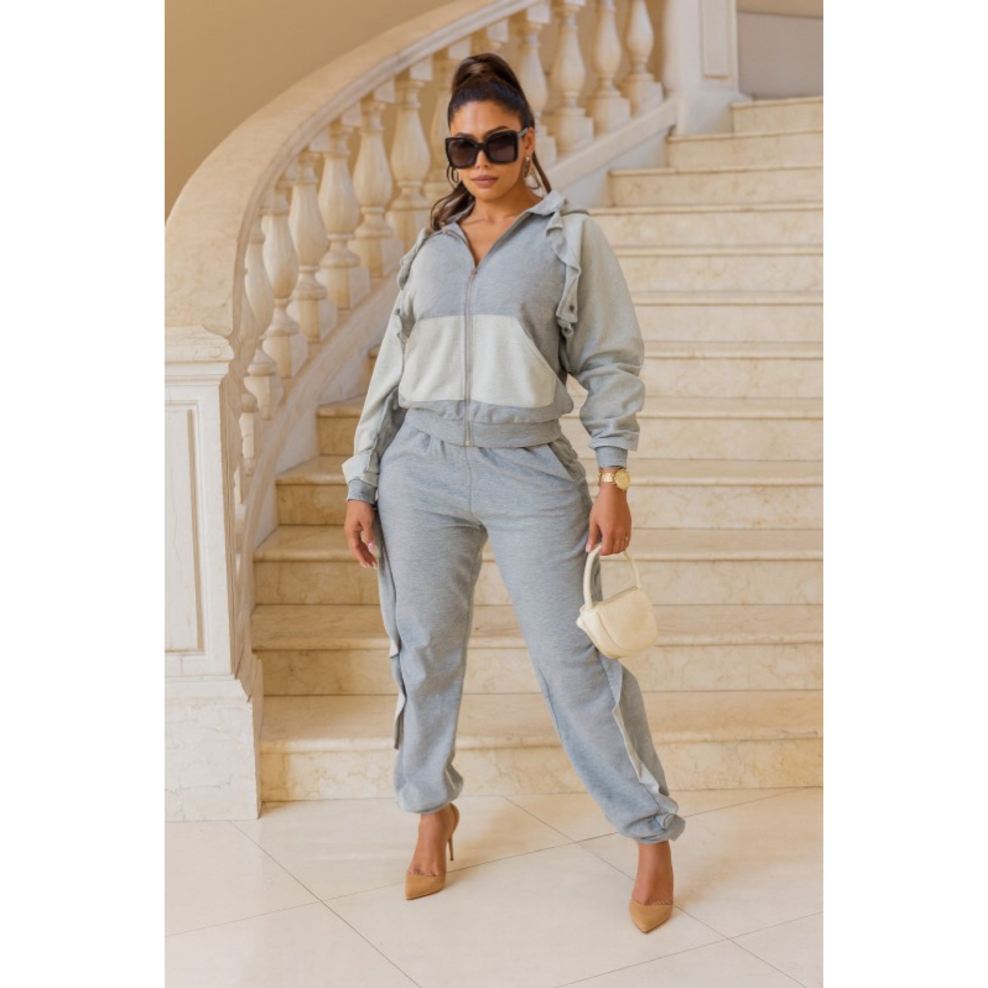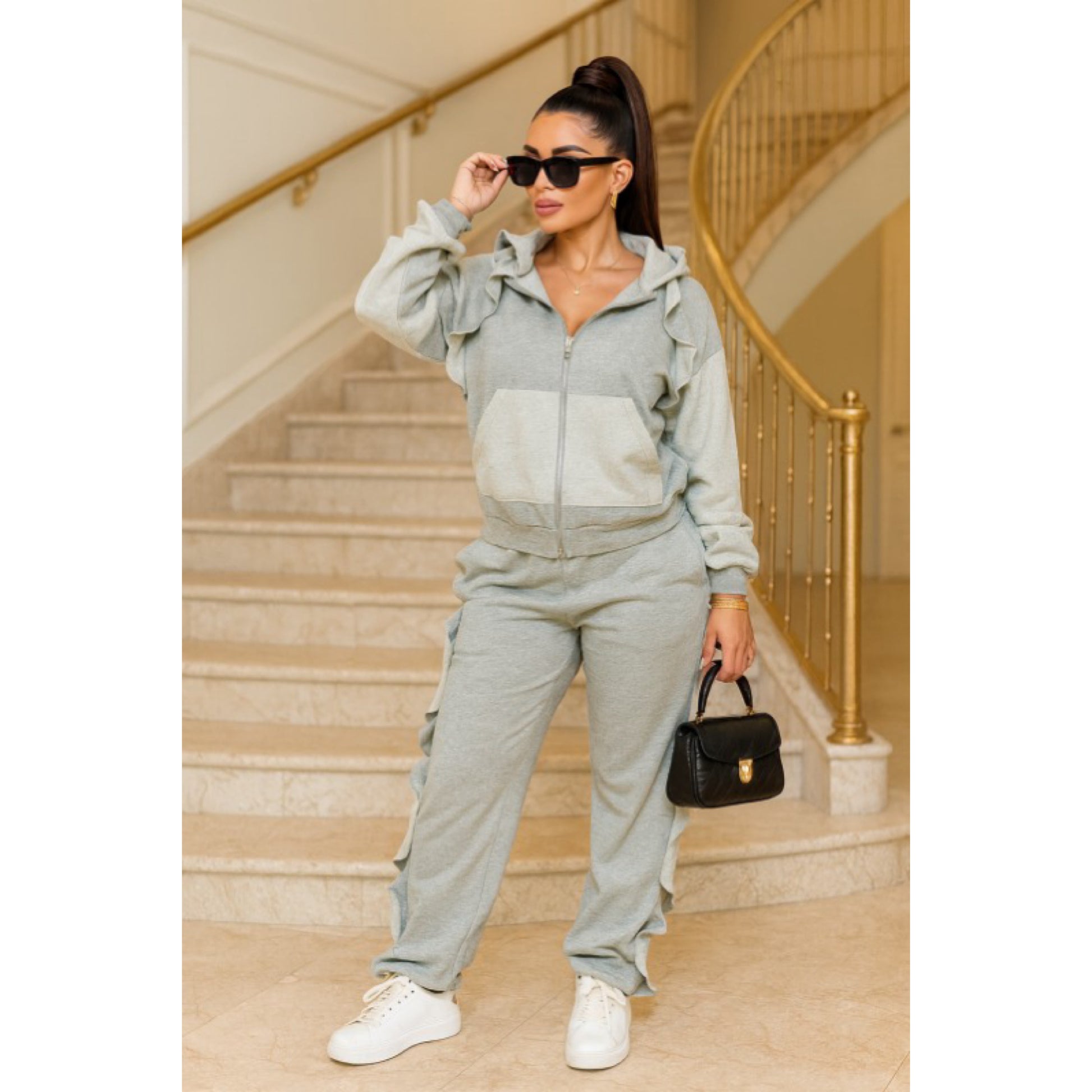 Ruffled sweatsuit with hoodie and pockets