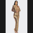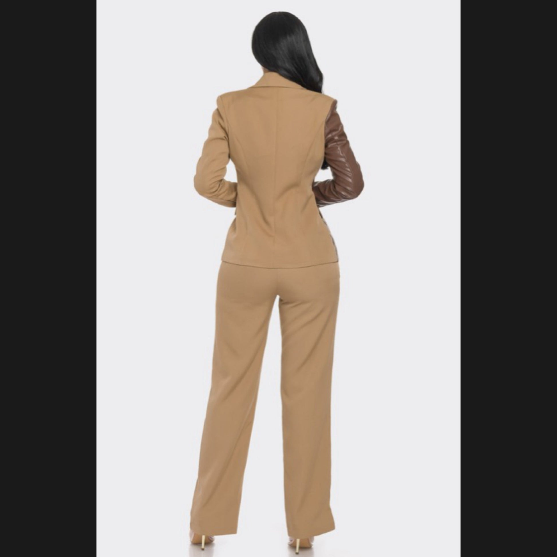 Sequin and pu leather blazer and straight leg pants with hook closure. Perfect for a business look to show off
