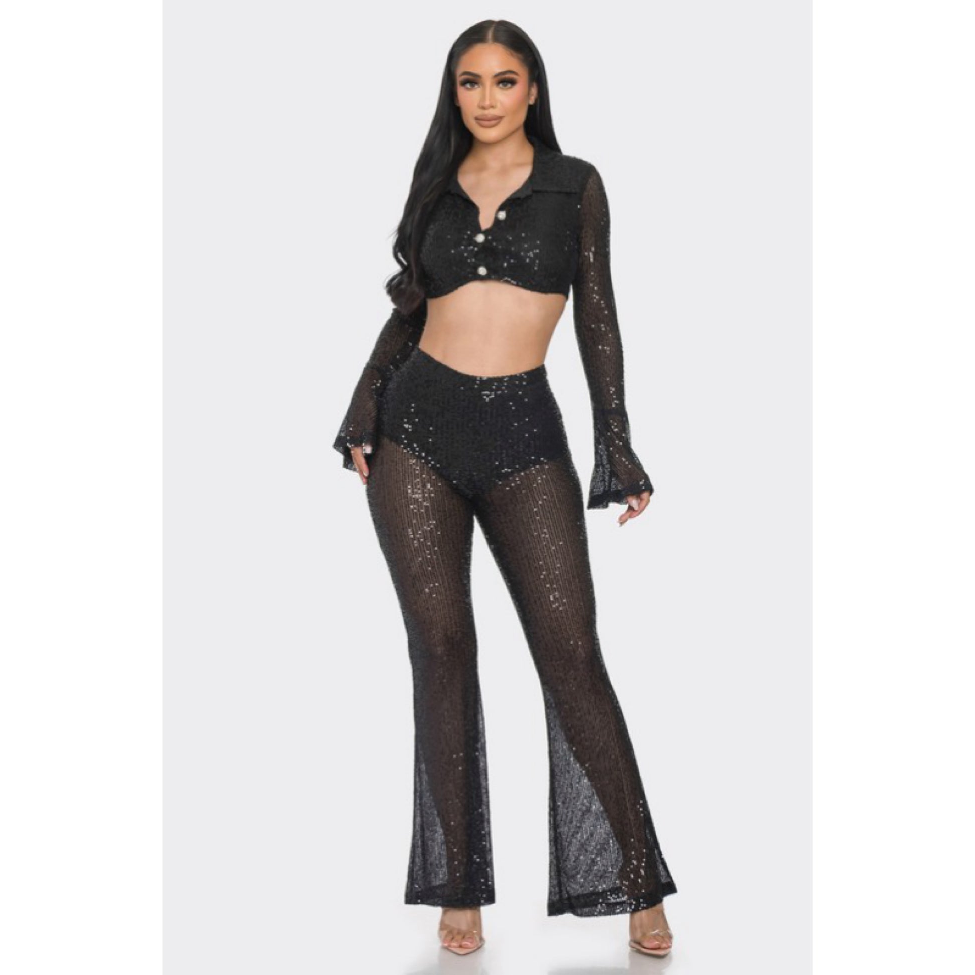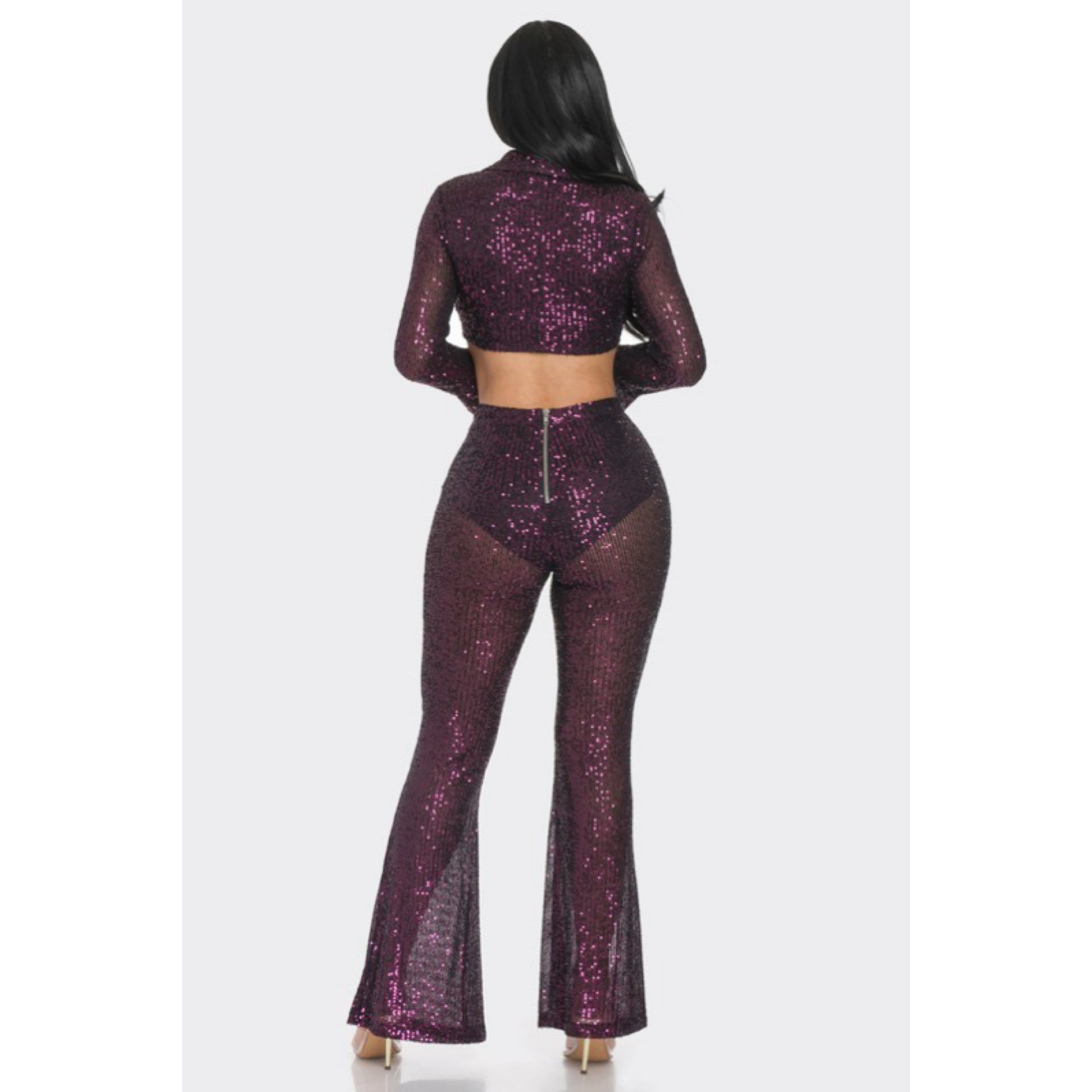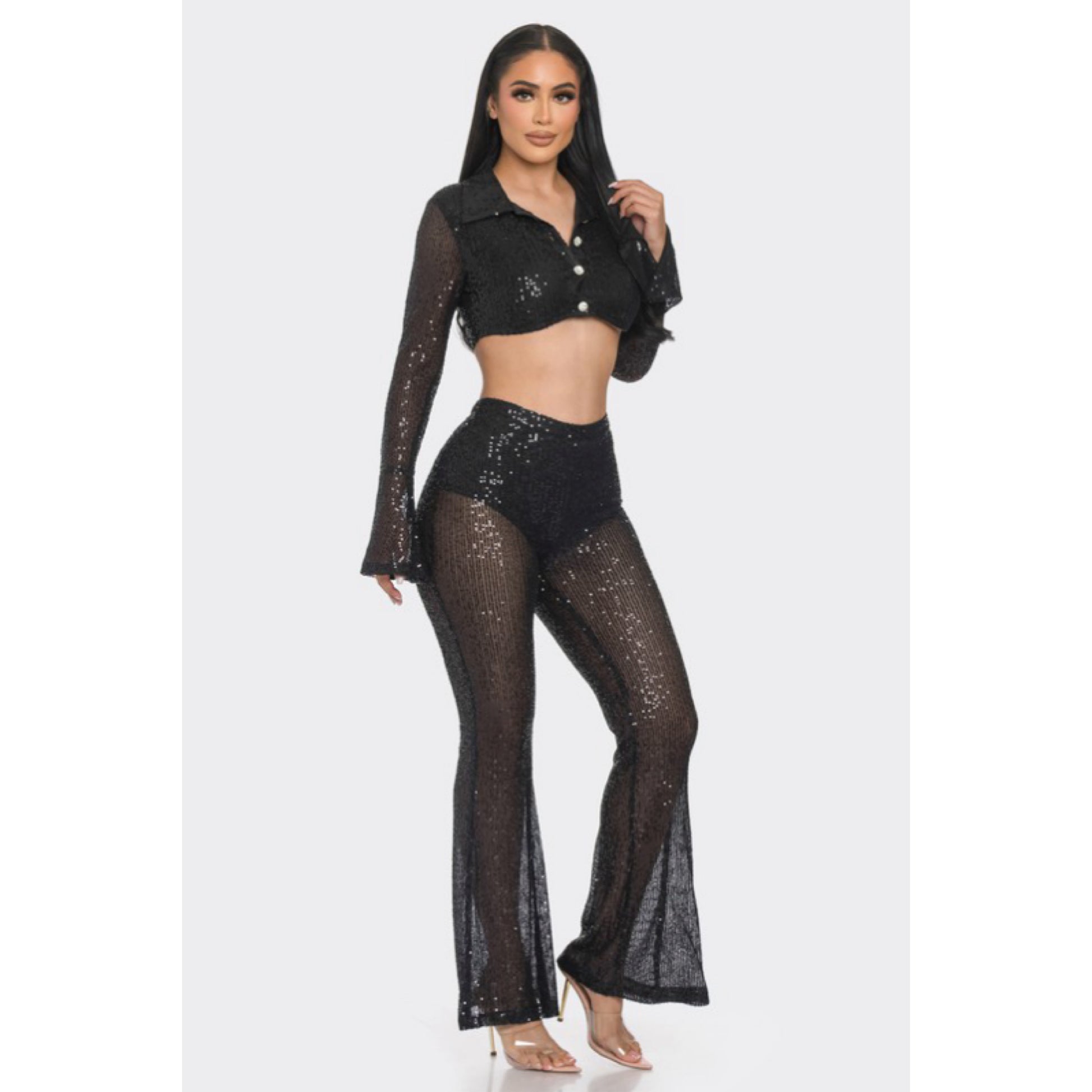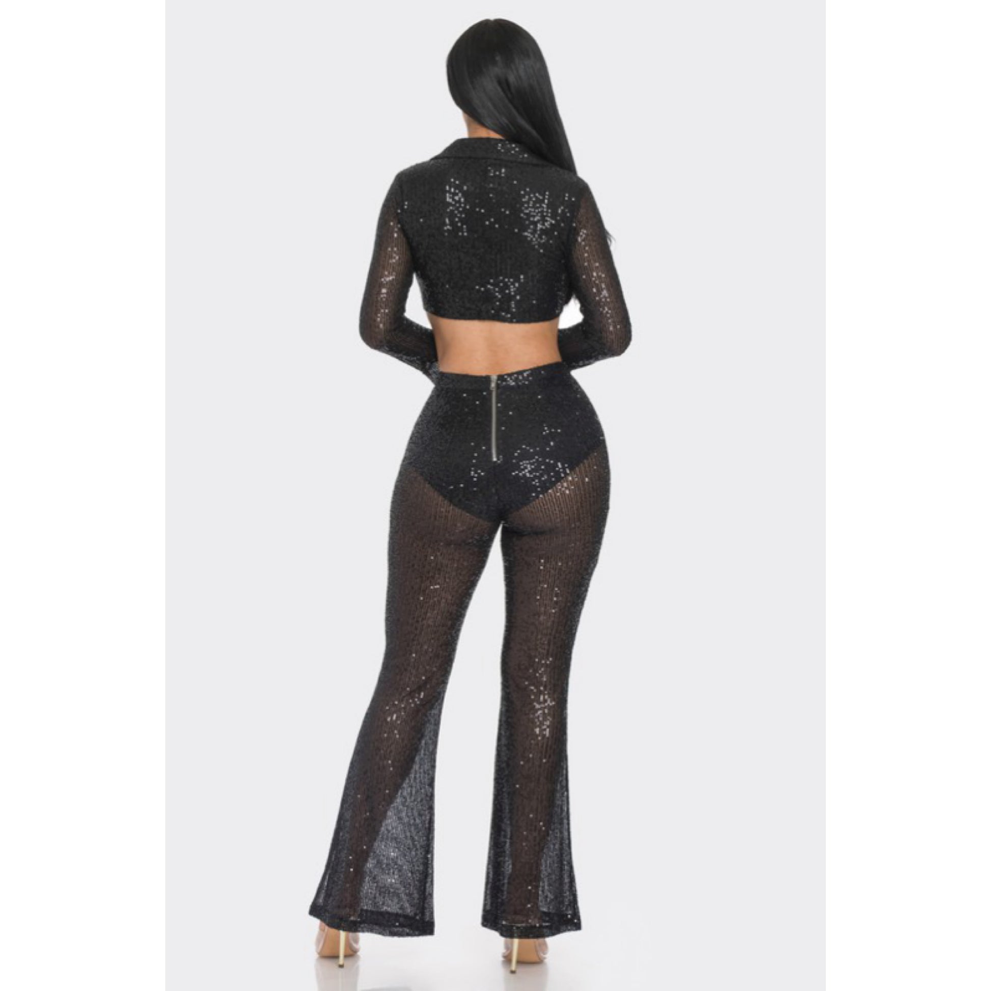 High waisted sequined mesh flared bottoms and gold zipper to the back