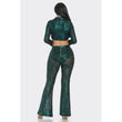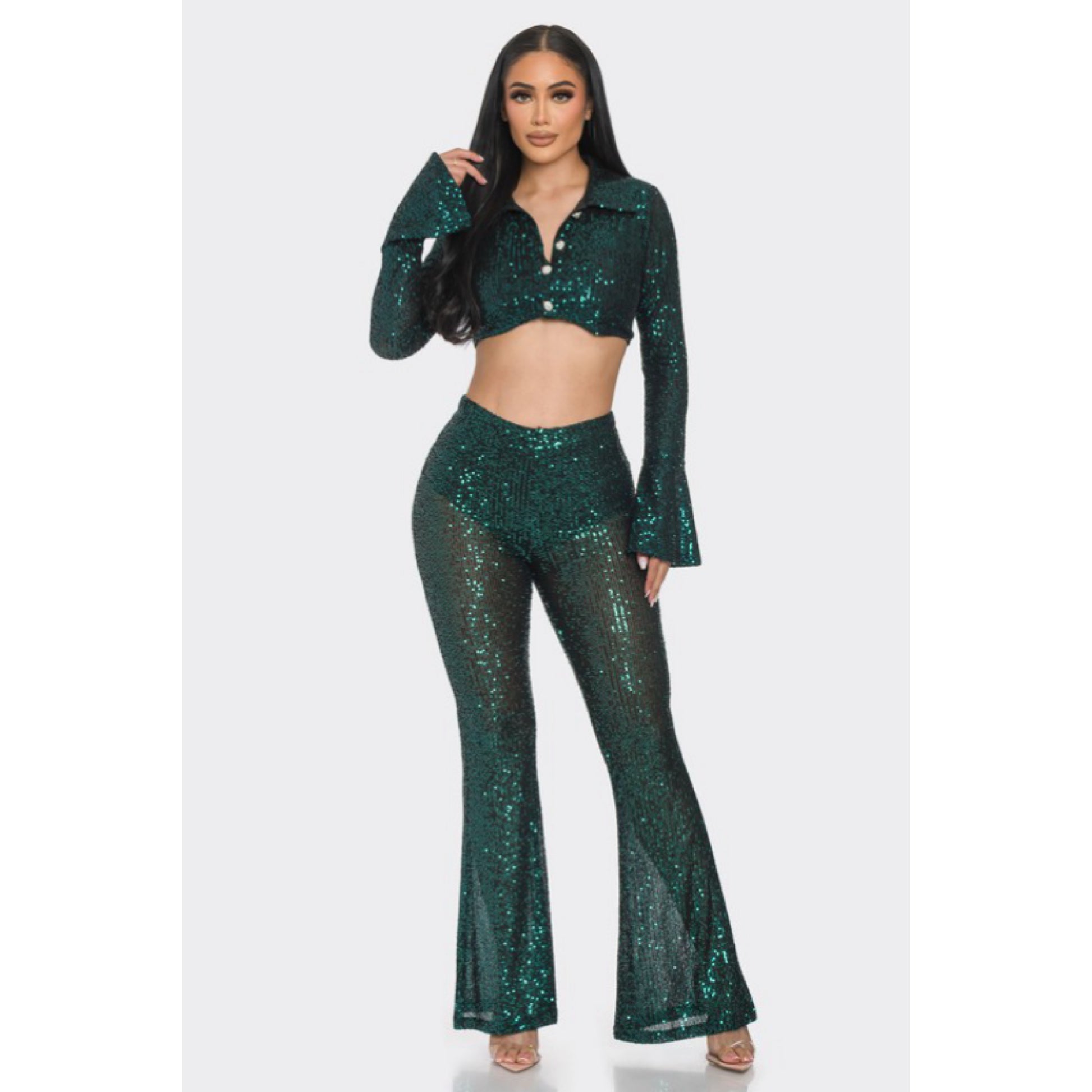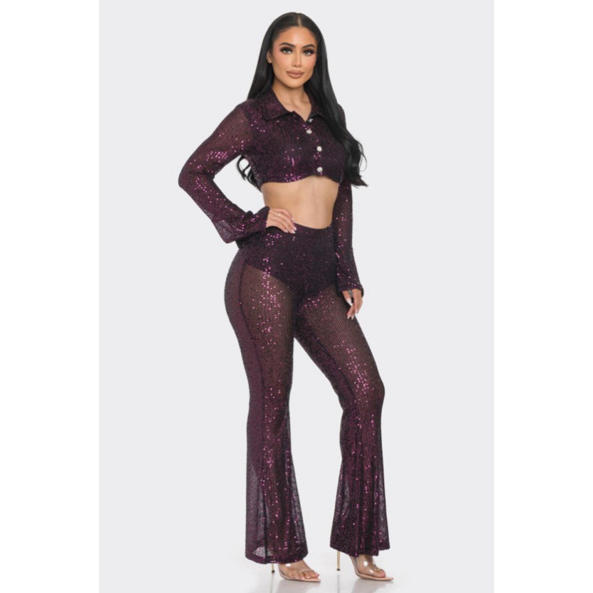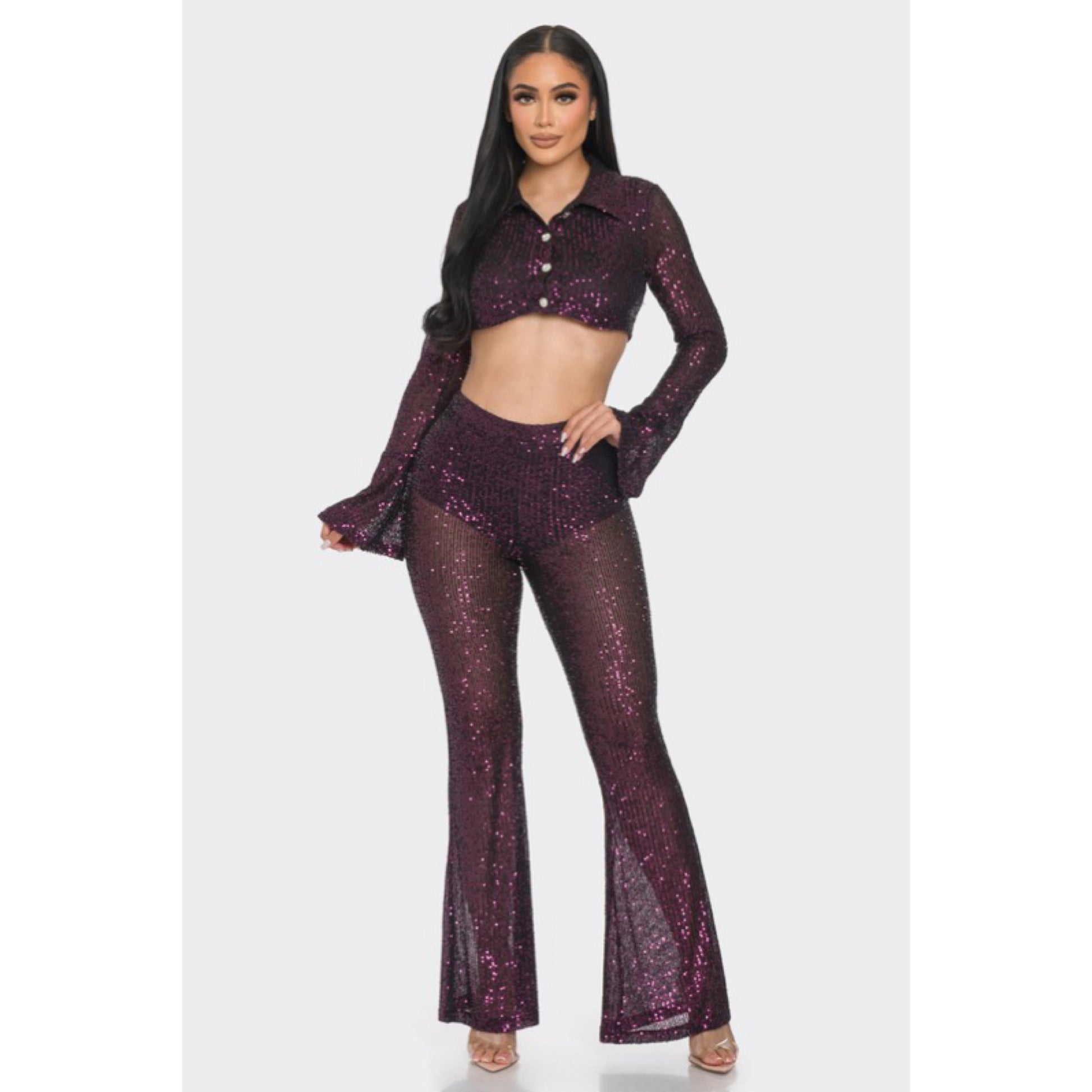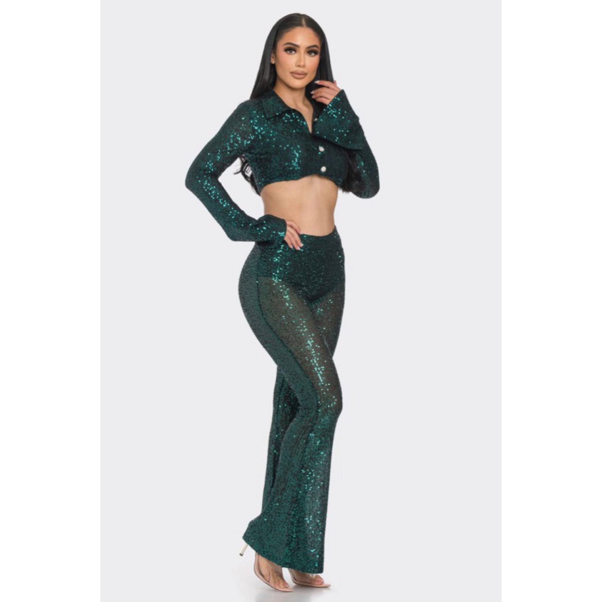 High waisted sequined mesh flared bottoms and gold zipper to the back