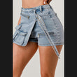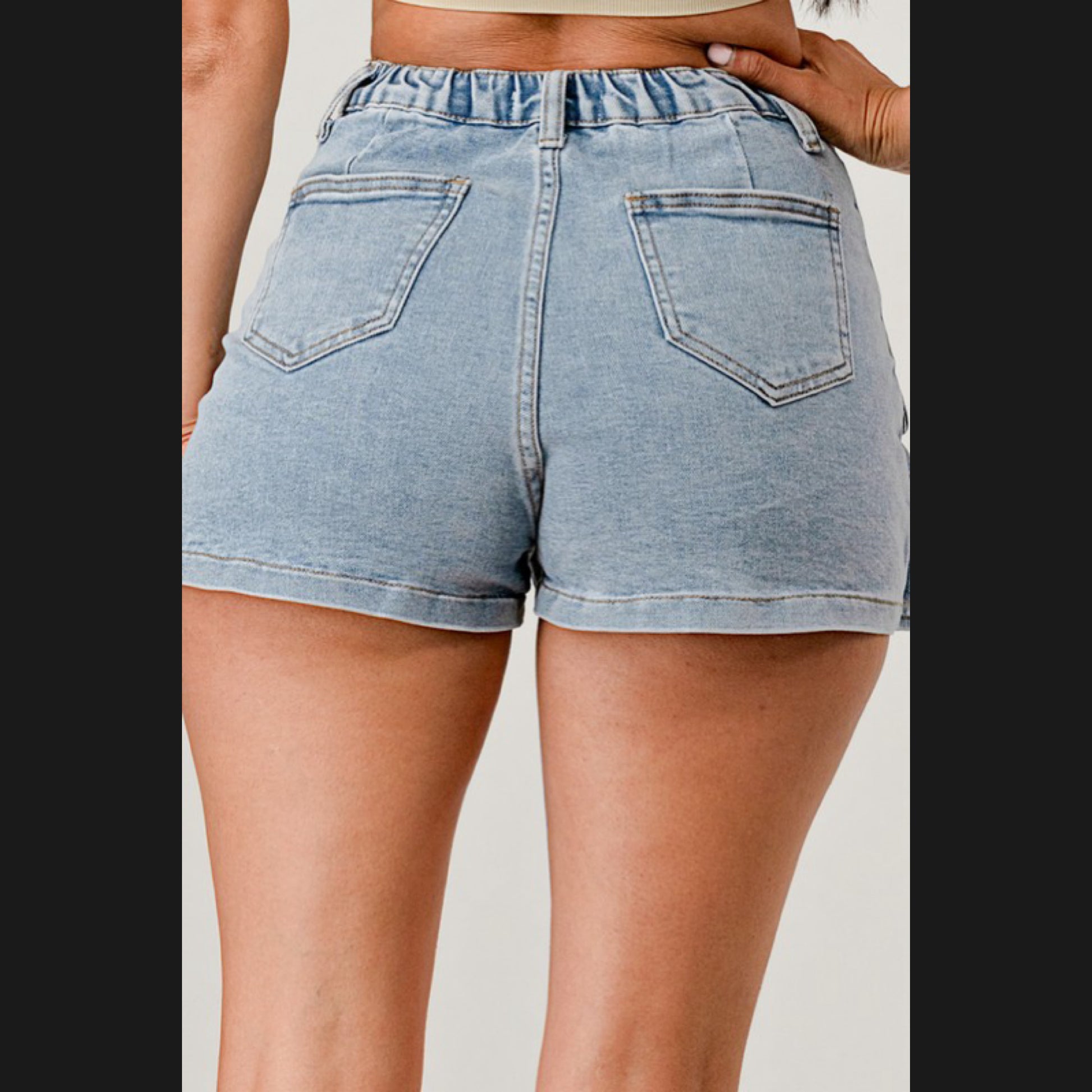 Denim high-waisted cargo shorts are designed with both style and functionality in mind. Featuring a high-waisted fit, this shorts come with multiple utility pockets, including flap and zipper pockets, for added practicality.